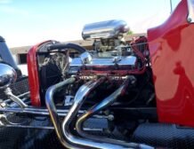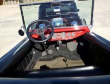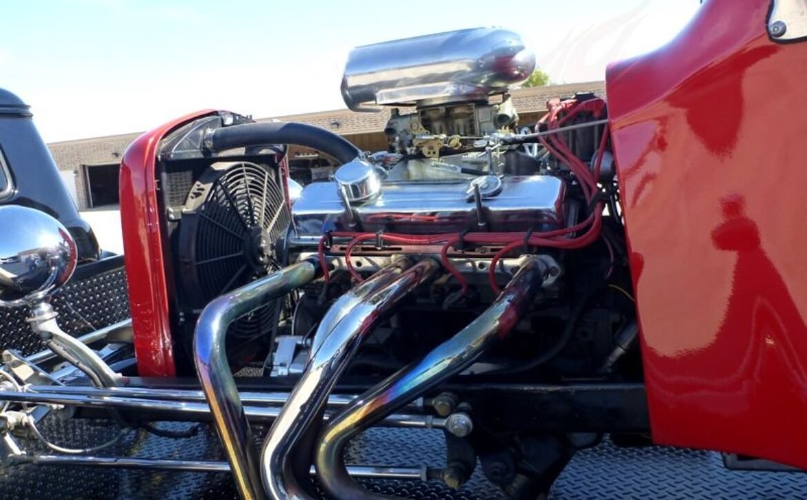 The vehicle’s aesthetics are further enhanced by a Red-painted radiator shell complementing a polished chrome grill, rounded chrome headlights, and flush-mounted tail lights, all functioning flawlessly. Instead of the typical two-piece windshield, this T-Bucket boasts a distinctive single-piece windshield mounted in a chrome frame. Its standout presence is further supported by Weld Racing wheels wrapped in Mickey Thompson Sportsman tires (15 inches in diameter, with 29×18.00R15LT rear tires), perfectly suited to this classic build.