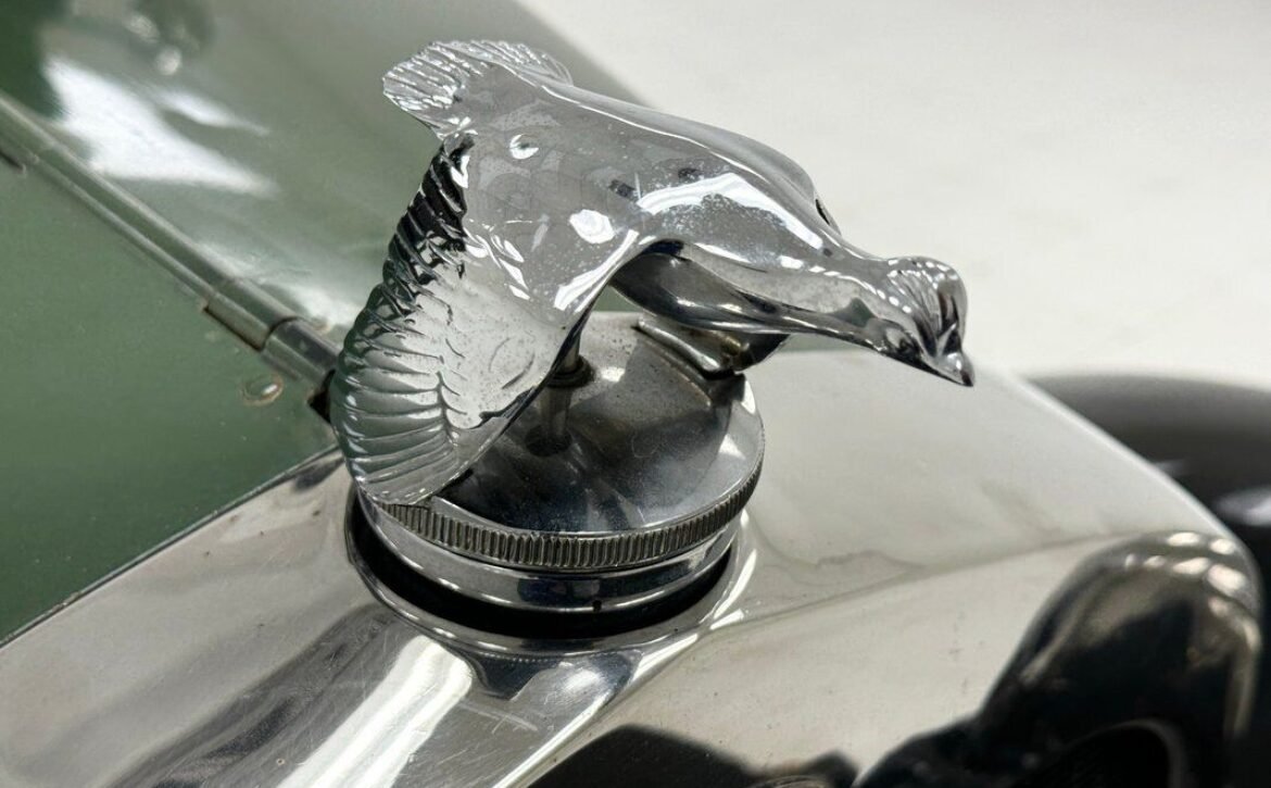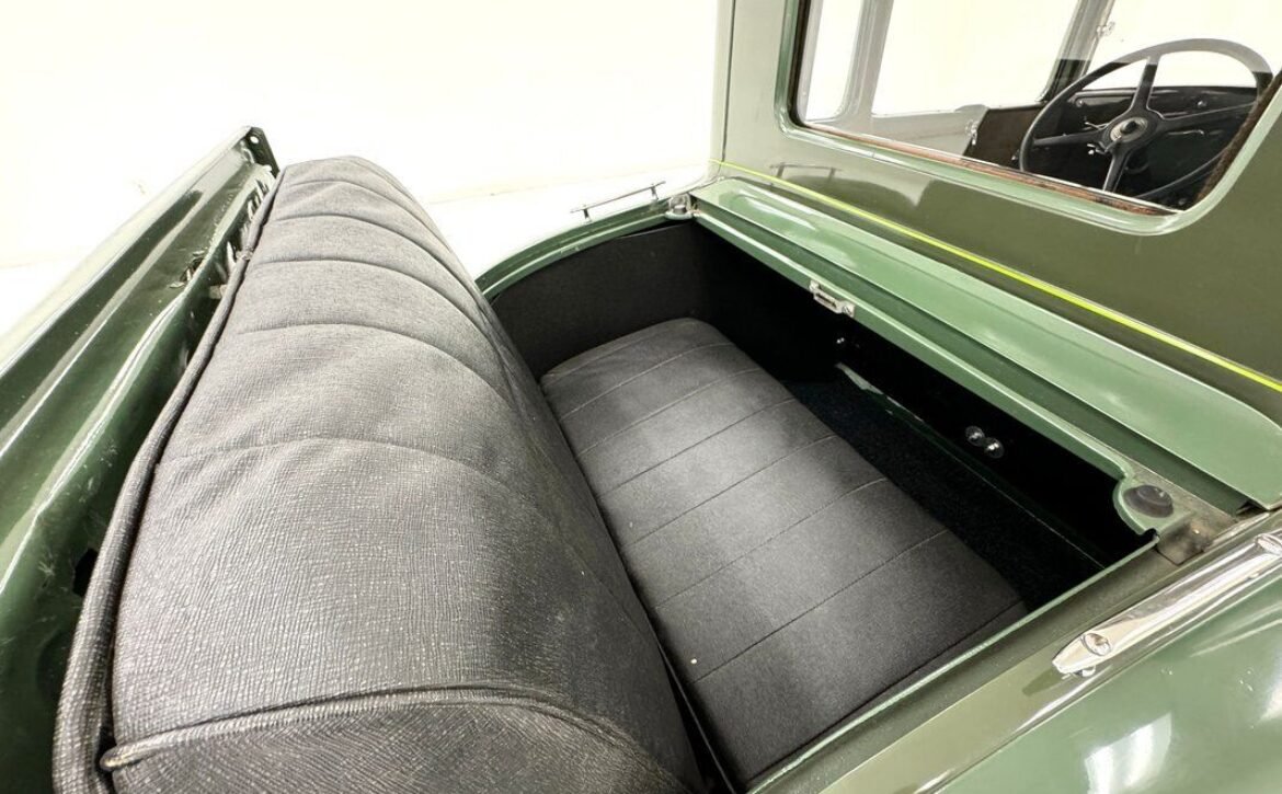 The polished metal radiator frame, straight front bumper, and split rear bumpers further elevate the car’s presentation. The fenders and running board are painted black, providing a striking contrast to the greens of the body and allowing the whitewall tires to really stand out. Some tasteful 1950s-era lights, including front markers and rear lights, add a subtle vintage flair. The rear-mounted spare, although showing some signs of weathering with its tan cover, remains a rare and original feature that adds character to the car.