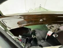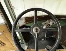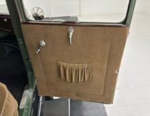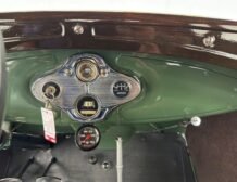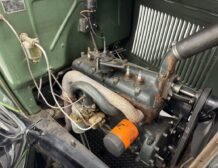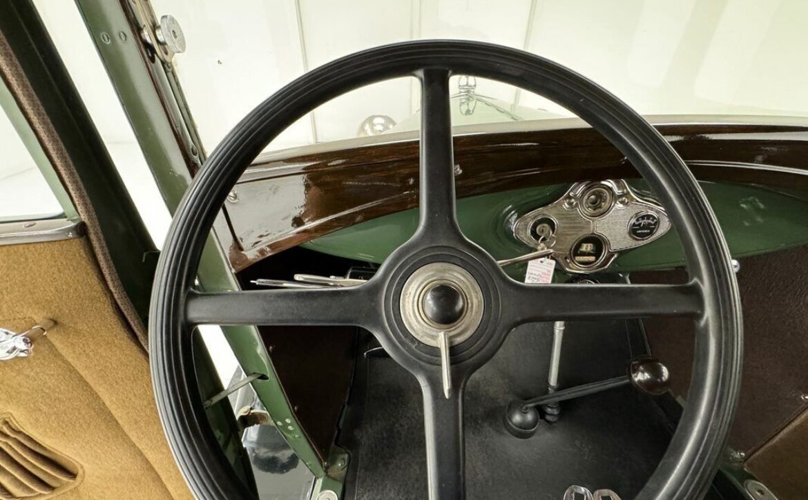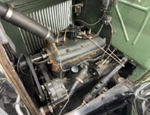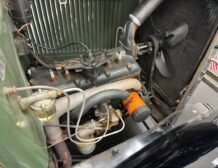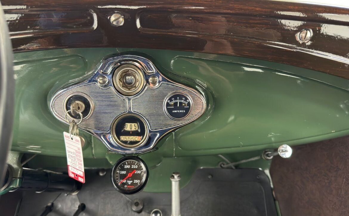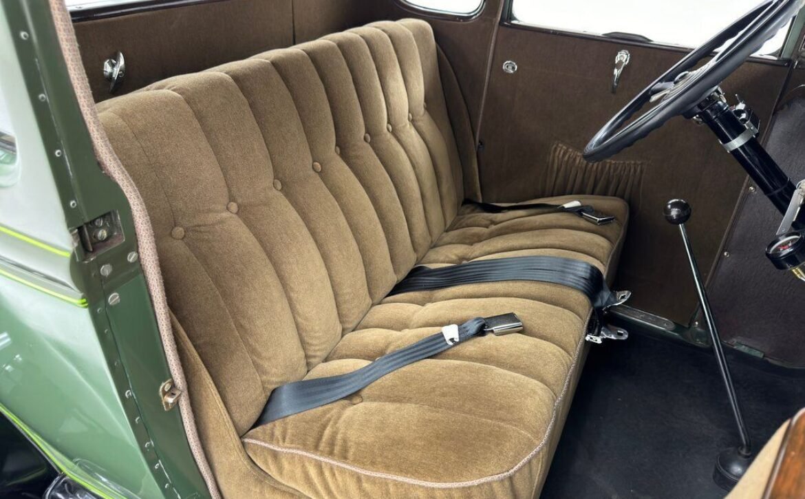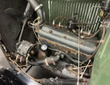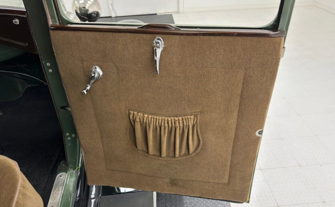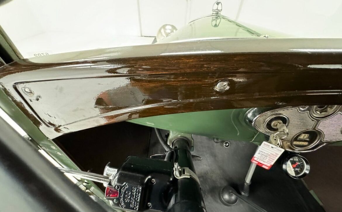 The slim shifter rises from the floor next to the handbrake, surrounded by a rubberized mat that contours to the floor. The soft headliner and sidewalls are both coated in matching mohair, adding to the interior’s plush feel. Noteworthy features include levers for pivoting the windshield and a roller drape to cover the back window. The rumble seat, covered in black grain vinyl, remains in excellent condition.