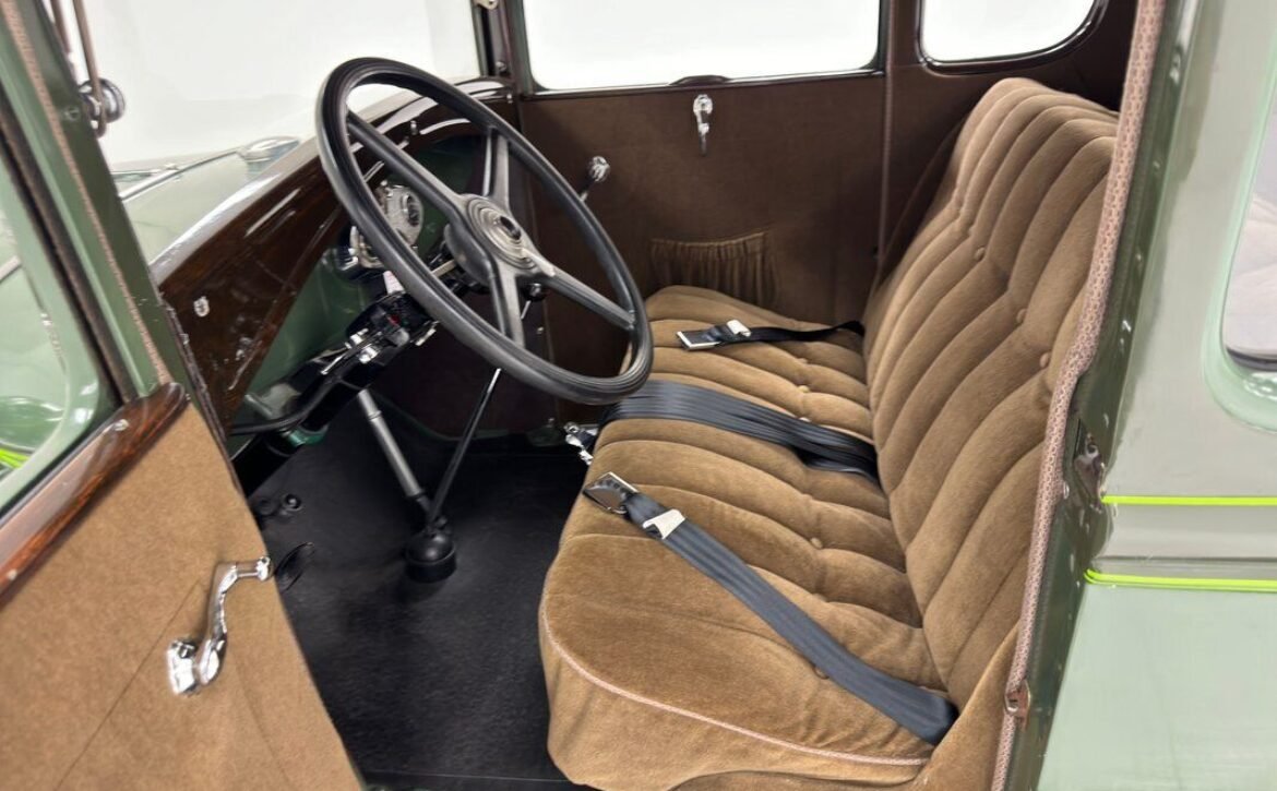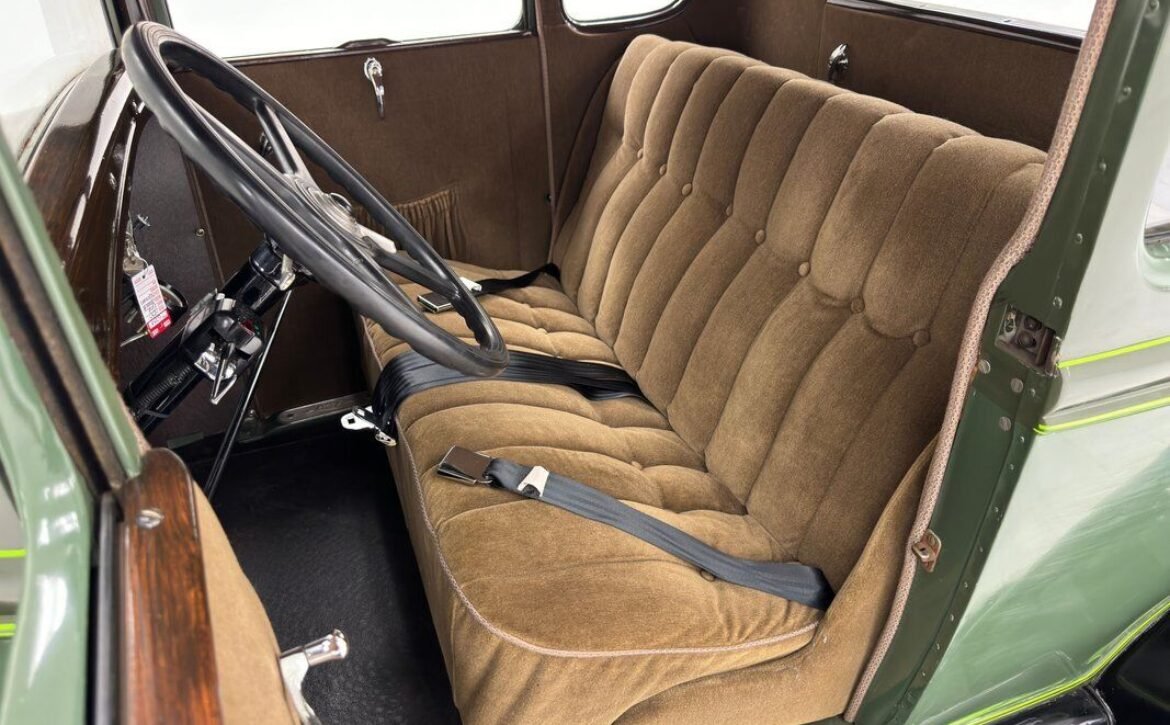 The interior of this Model A Sport Coupe exudes vintage luxury with its mohair door panels, featuring a pleated map pocket and a wood header. The bench seat, upholstered in fancy goat fleece, is channel tufted with brown buttons and tan piping, all in great condition. A basic 4-spoke steering wheel sits before a wood-topped dash with a green lower section and a cloverleaf silver plate in the middle, housing the ignition and period-correct gauges. A modern temperature gauge has been thoughtfully added for added convenience.