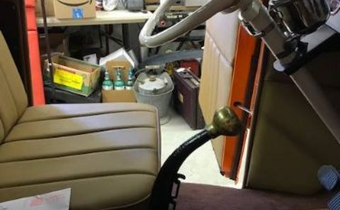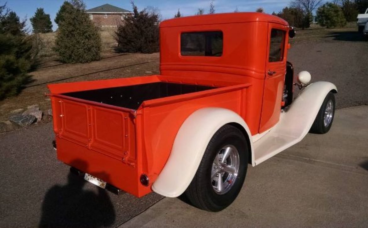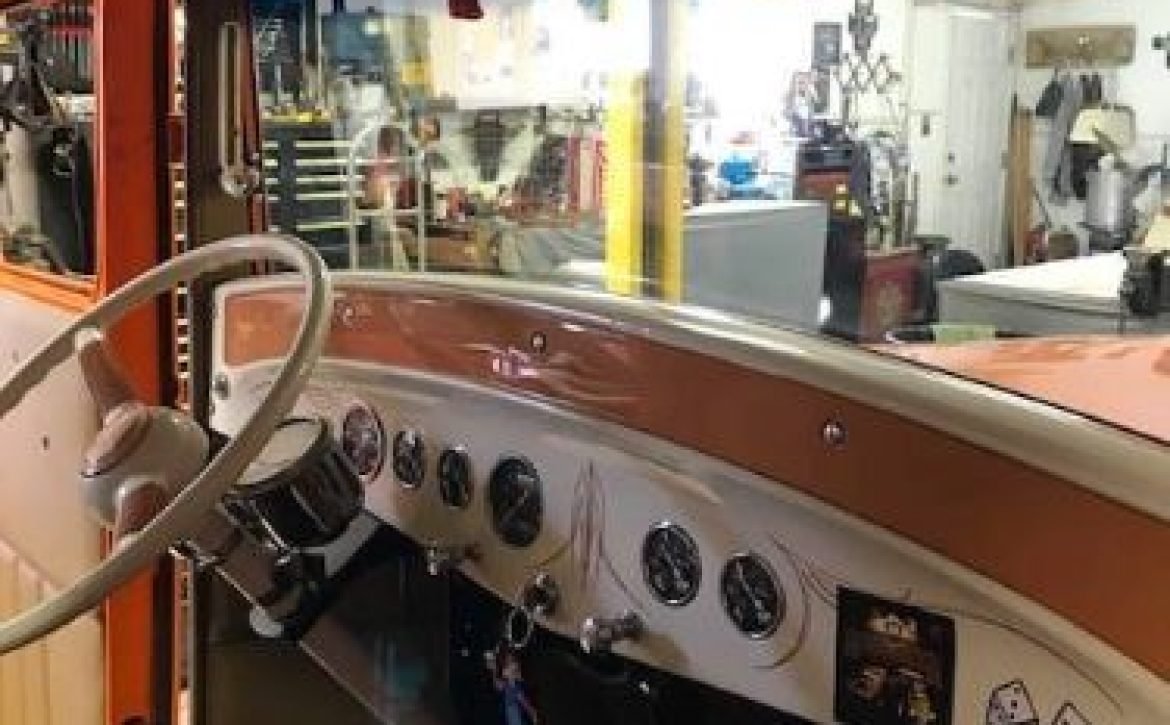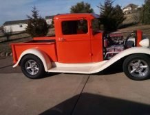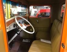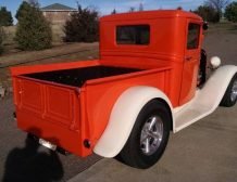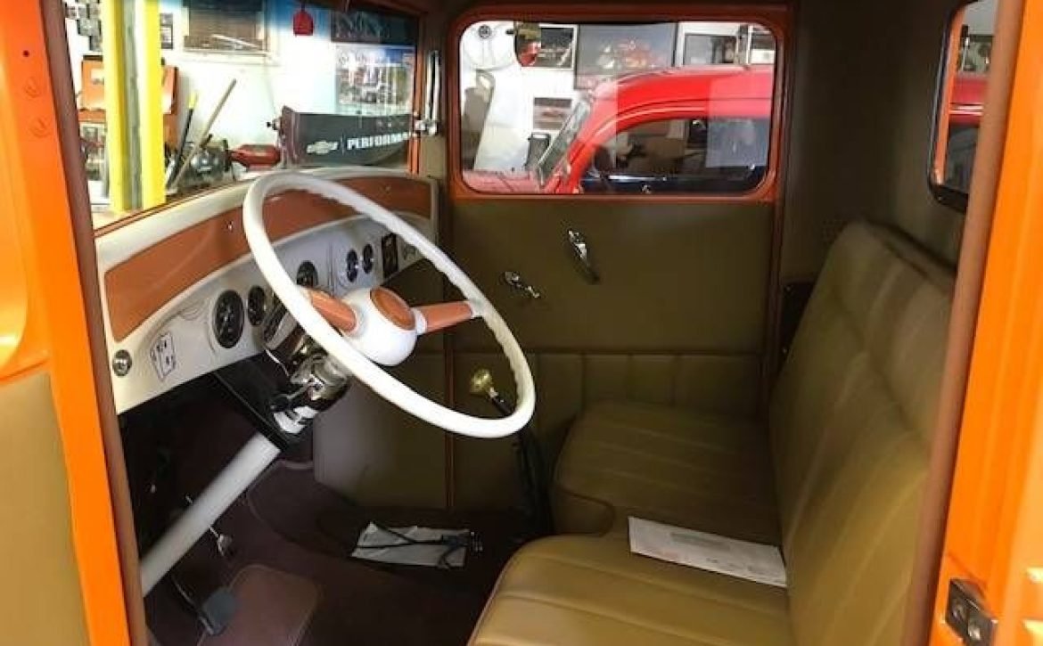 This pickup boasts tinted glass with a shaded windshield, enhancing both privacy and style. An original speedometer and matching gauges keep the nostalgia intact, while rack and pinion steering and a 3″ dropped front axle offer modern handling. The exterior is finished in an eye-catching Orange/Vanilla Shake paint scheme, complemented by a custom Saddle-colored interior. The pickup’s unique character is further emphasized by a chopped top and shortened bed, along with a custom firewall.