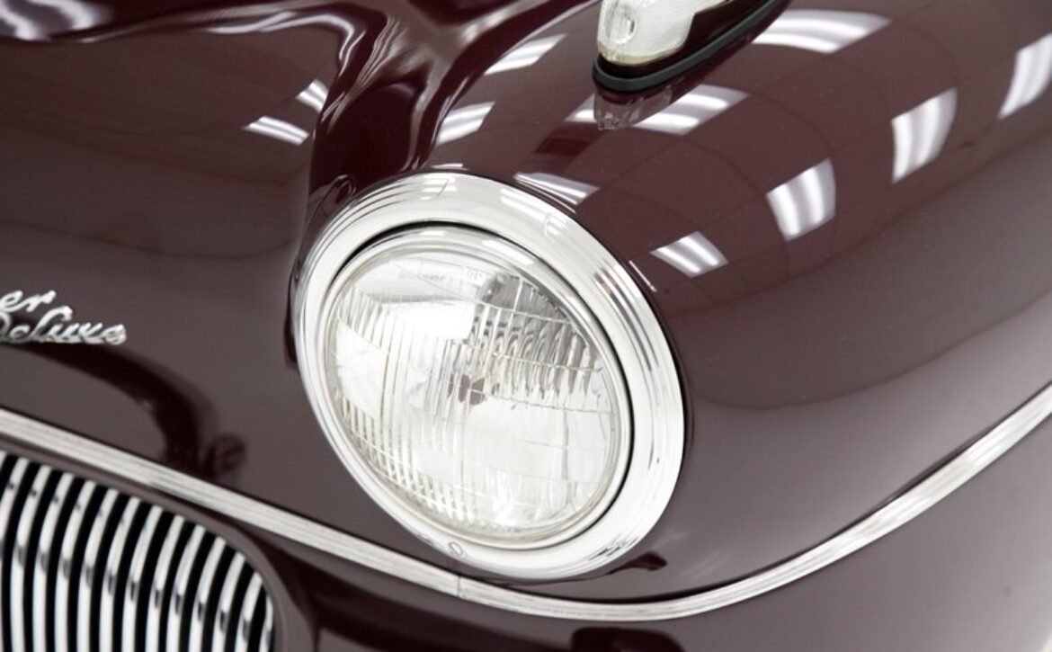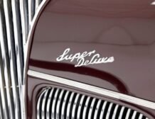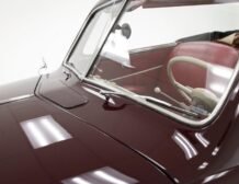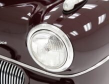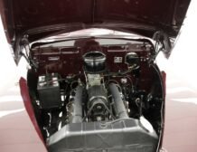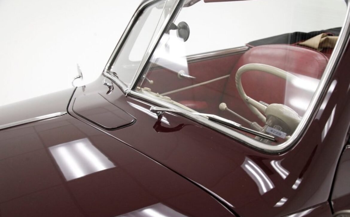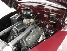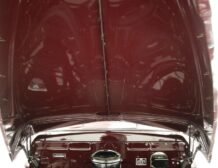 Having been preserved with care, this car remains in outstanding condition. The maroon paint gleams across all steel panels, which are straight and true, showing no signs of age. Chrome details such as the bumper, grille, and trims shine brightly, underscoring the car’s history of meticulous preservation. The interior, draped in red artificial leather correct for the period, remains inviting and practically new, supported by well-maintained Bakelite knobs and cranks.