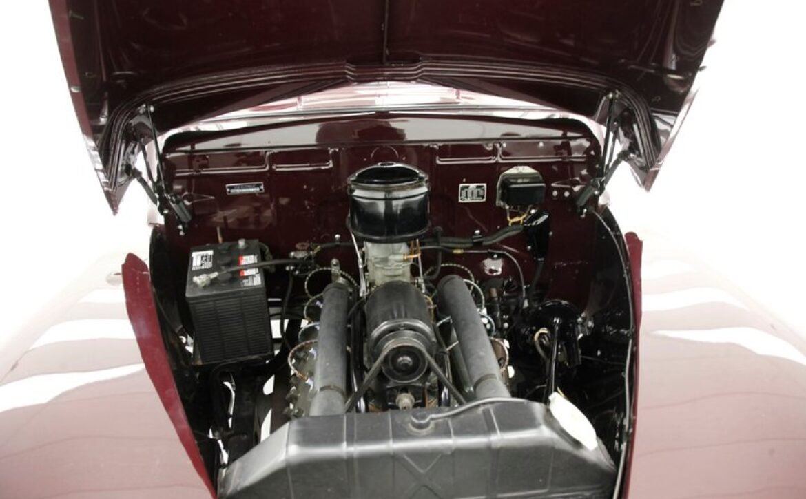 The drivetrain features the original 221ci flathead V8 engine paired with a 3-speed manual transmission, operating on a reliable 6-volt electrical system. This classic engine setup has been maintained to preserve its authenticity. The undercarriage supports solid and rust-free body hangers with a well-functioning suspension system utilizing transverse leaf springs and drum brakes on all four corners. This ensures a smooth and comfortable ride.