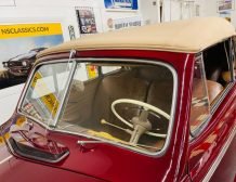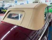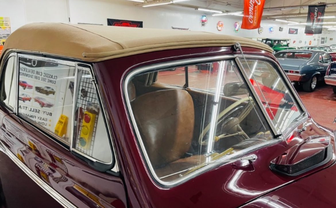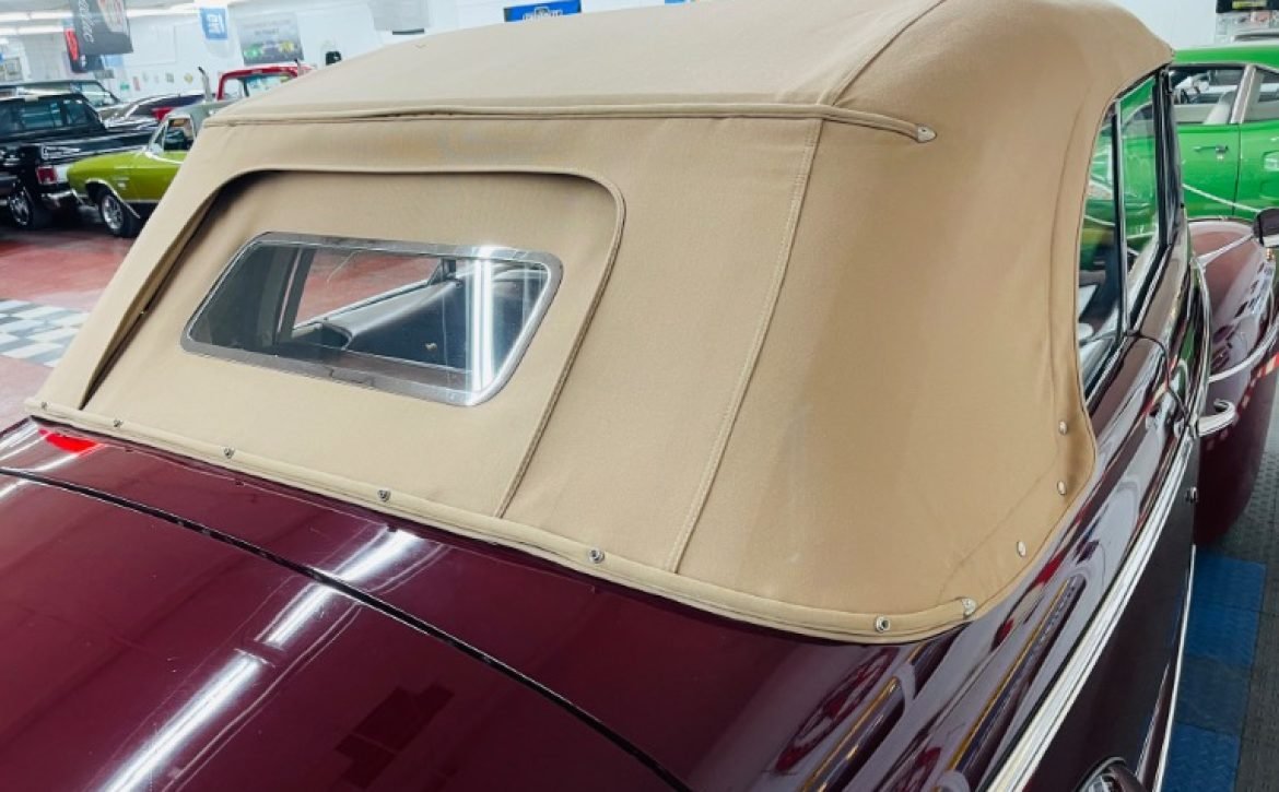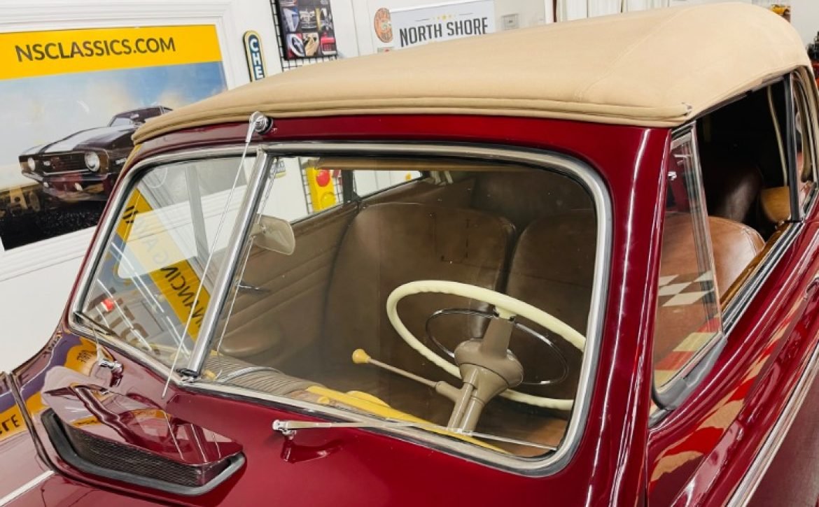 Aesthetically, the car is fitted with wide white-wall tires, enhancing its classic look and ensuring a smooth ride. The canvas convertible top is another highlight, allowing for open-air driving pleasure. Additionally, the inclusion of a spare tire and jack assembly showcases the car’s practicality and readiness for the road.