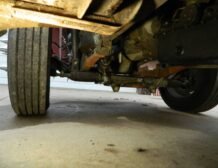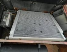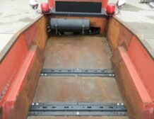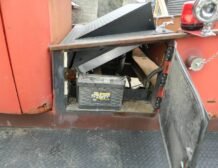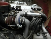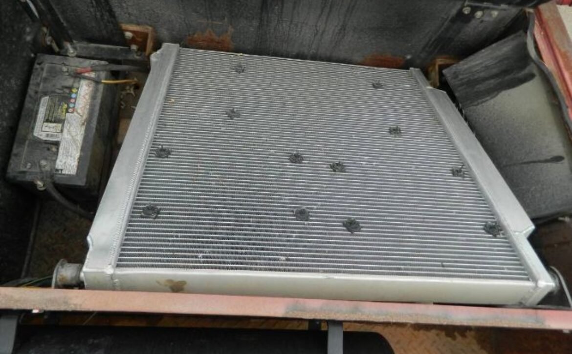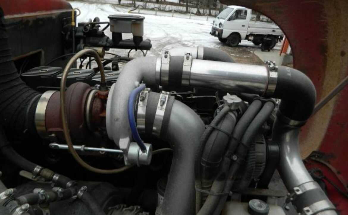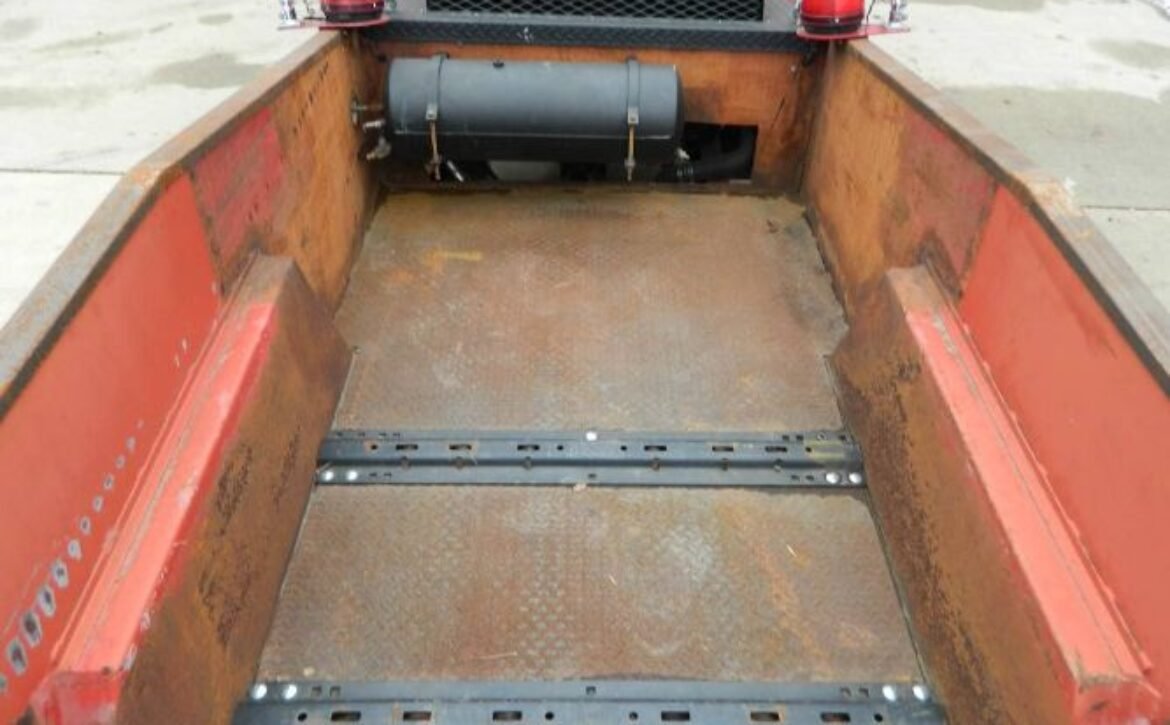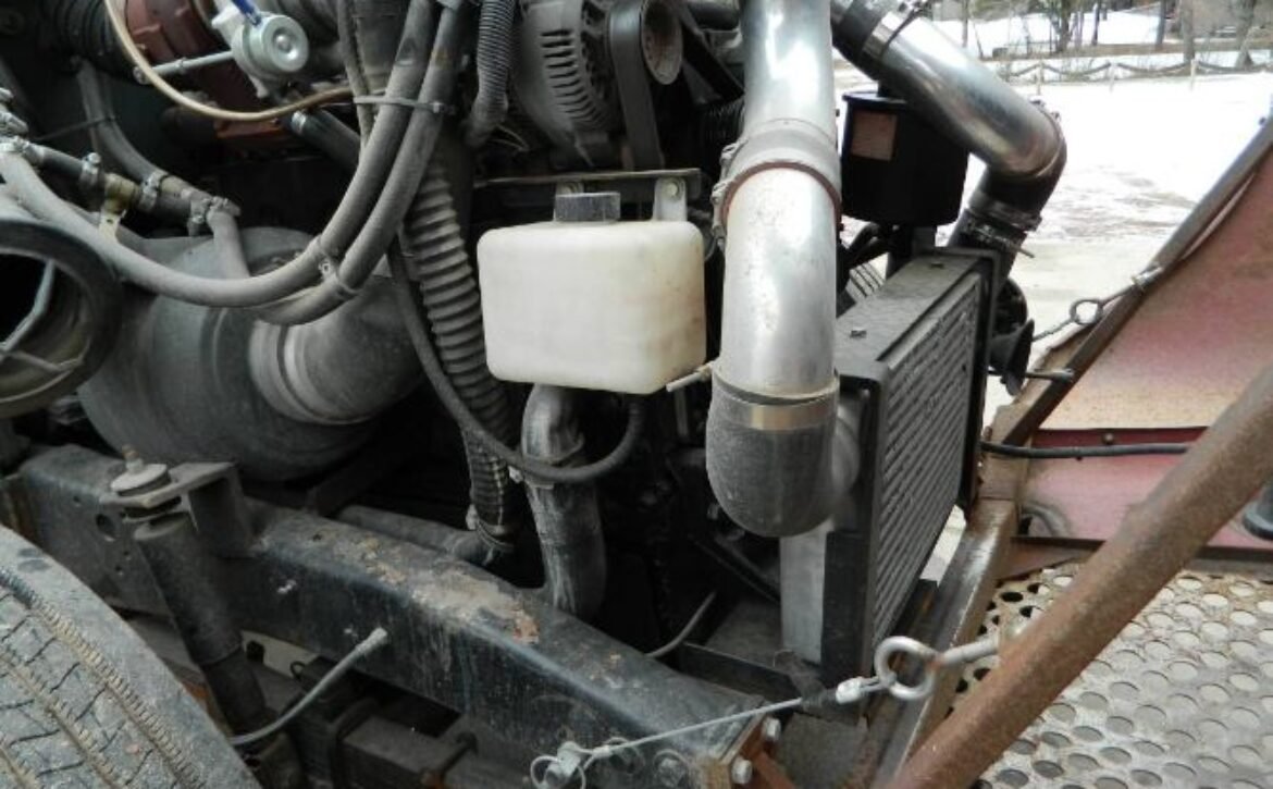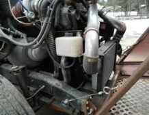 A huge aluminum radiator with three fans is positioned behind the cab, with a large intercooler installed in front, ensuring optimal cooling performance. The truck features hydro boost hydraulic brakes, with discs at the rear and drums at the front, complementing its dependable braking system. It also includes an air pump with a tank and air hose for added utility.