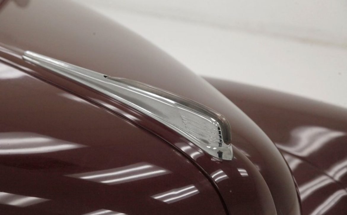 The exterior reflects true classic sophistication with its combination of chrome accents and rich, deep Monsoon Maroon paint. The body is in excellent condition, featuring rust-free panels and beautifully aligned gaps. Highlights include a horizontal-ribbed grille with single headlights and carefully crafted curved fenders. The painted steel wheels, adorned with FORD logo moon caps, and the Firestone wide white bias tires add to the vehicle’s period-appropriate appeal.