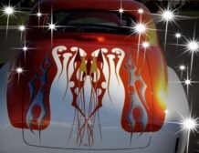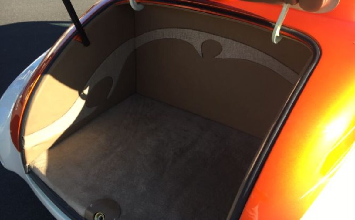 The aesthetic appeal is highlighted by a striking paint job with pearl white on the bottom and tangerine on top, adorned with graphics that capture attention. LED lighting in the front and back, combined with a light package under the car operated via remote, enhance its striking presence on the road.