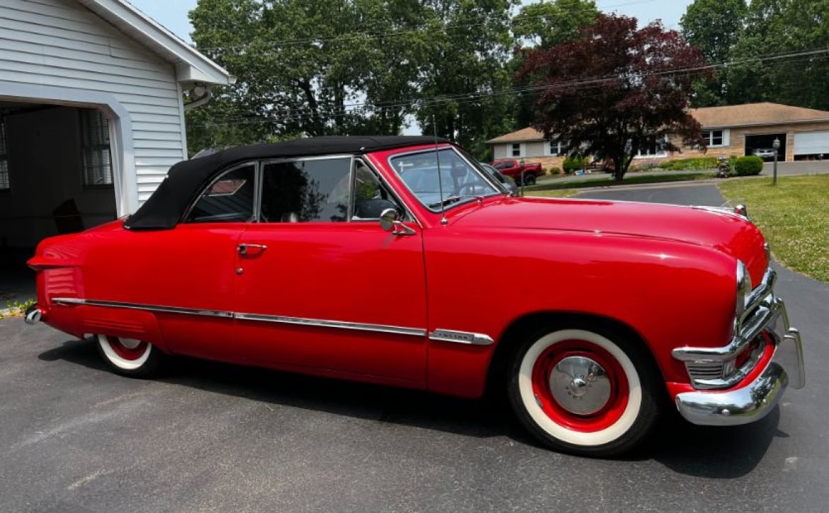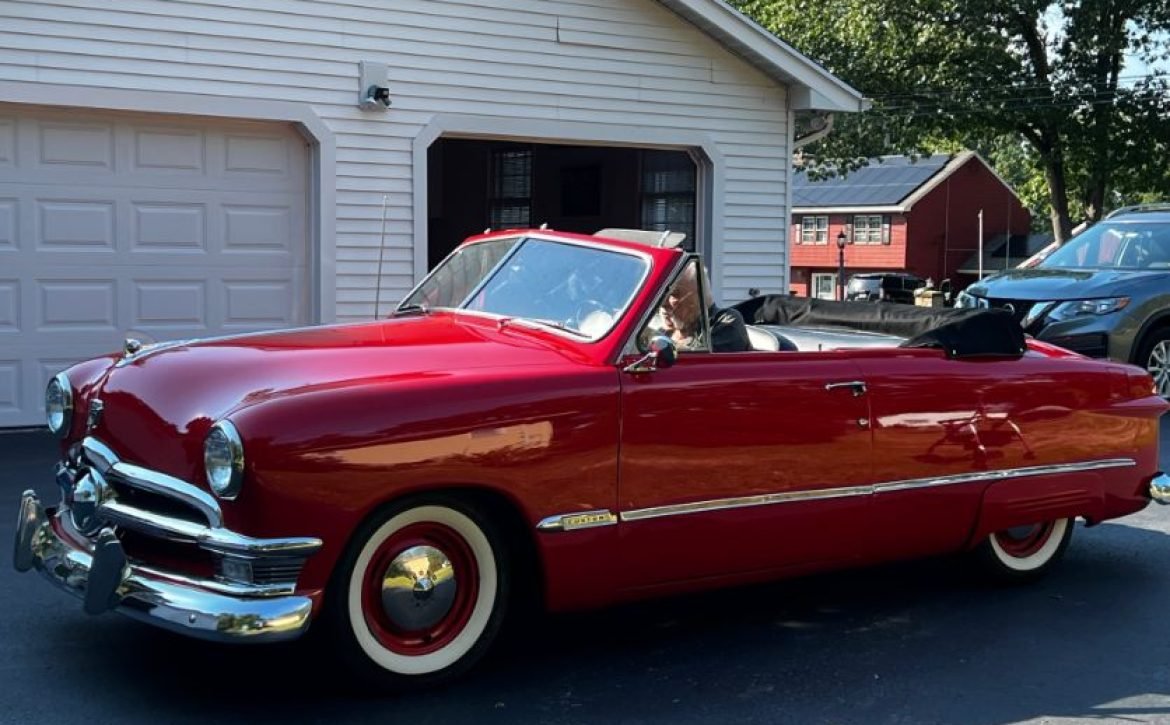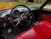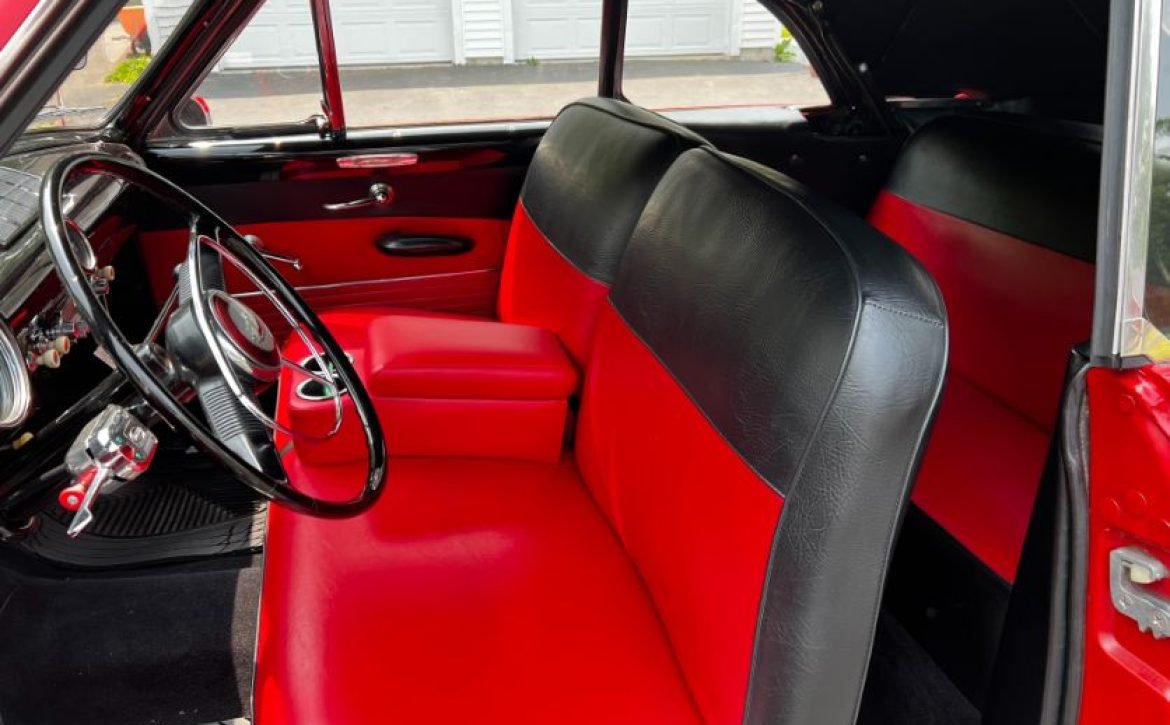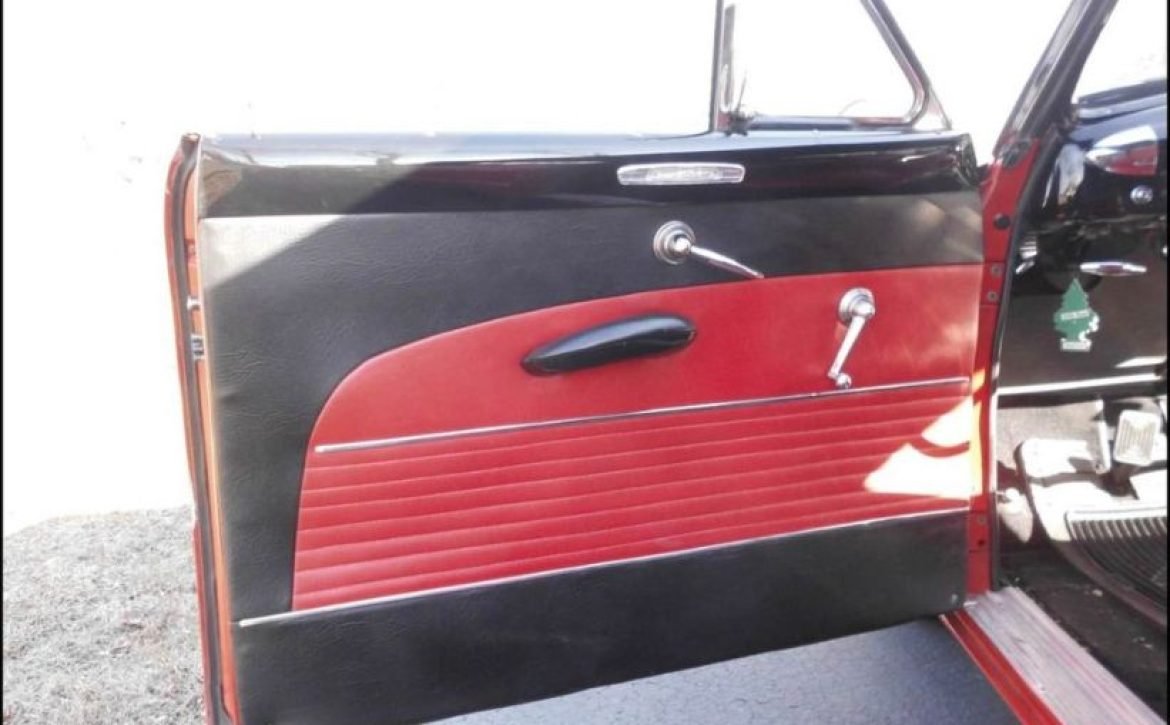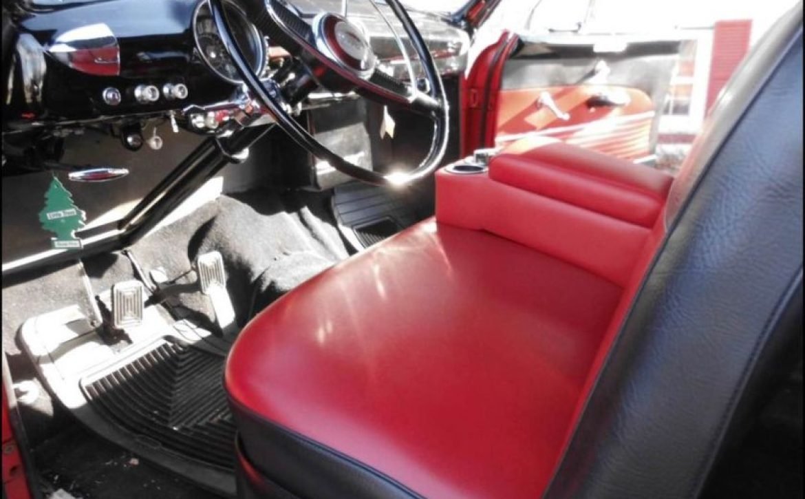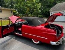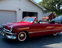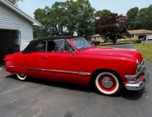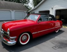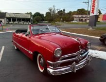 RedIntroducing the 1950 Ford Custom Convertible, a beautiful blend of vintage charm and robust performance. This classic car is finished in a striking red color complemented by a chic black canvas top, which adds to its timeless appeal. Step inside to be greeted by an elegant black and red interior that perfectly matches the exterior’s sophistication.