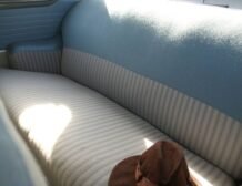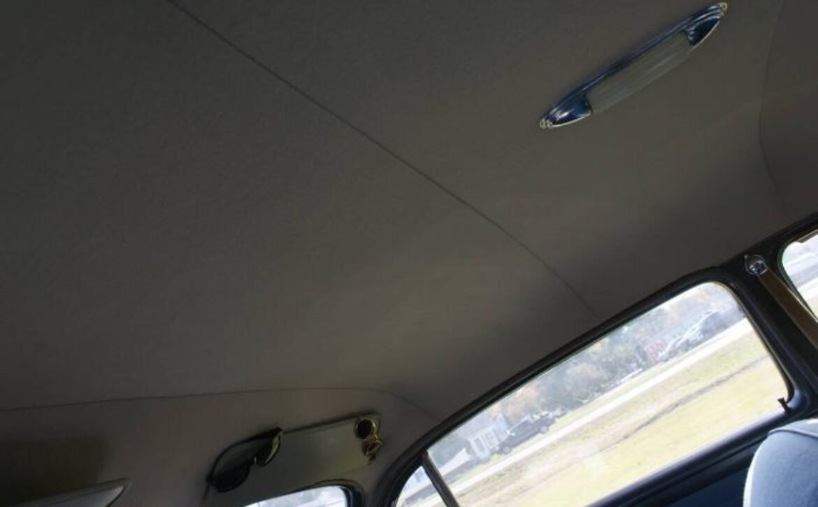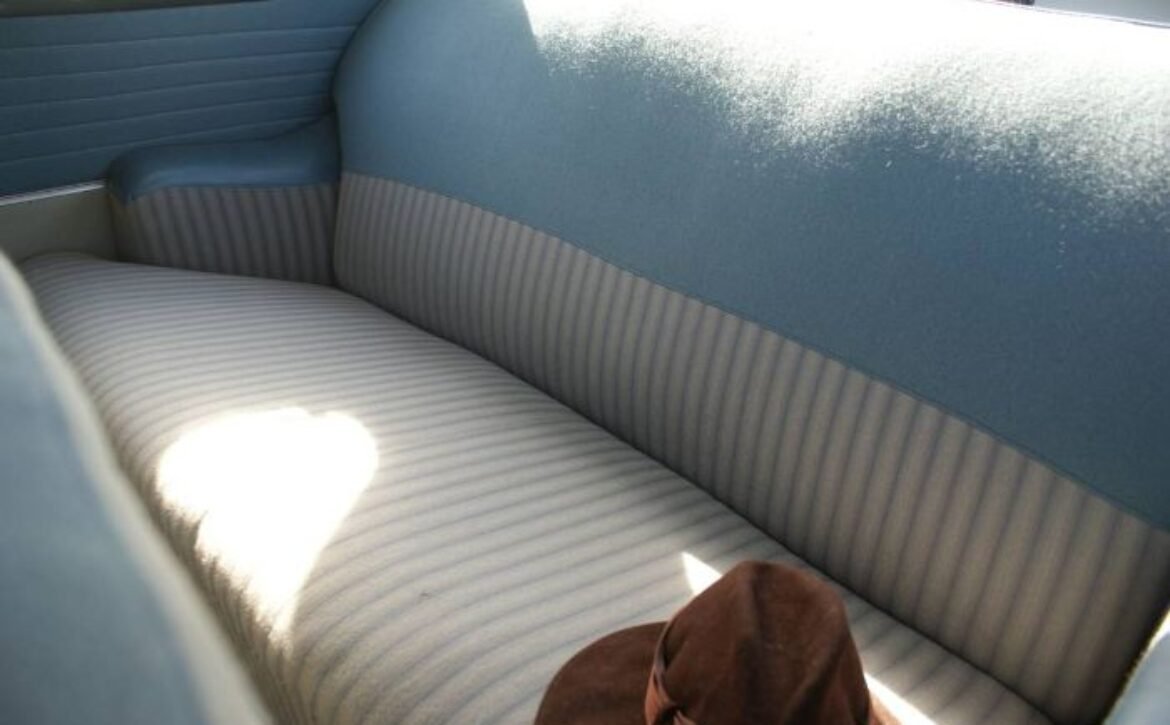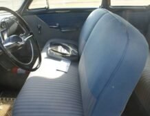 Inside, the car impresses with upholstery made from original factory material in near-new condition, complemented by rubber floor mats. The blue and grey door panels, along with the off-white headliner, give the interior a refined look. Chrome handles, knobs, steering wheel, and trim are all in superb condition. Notable features include a heater, signal lights, a push-button factory AM radio, and a clock, adding convenience and comfort to your driving experience.