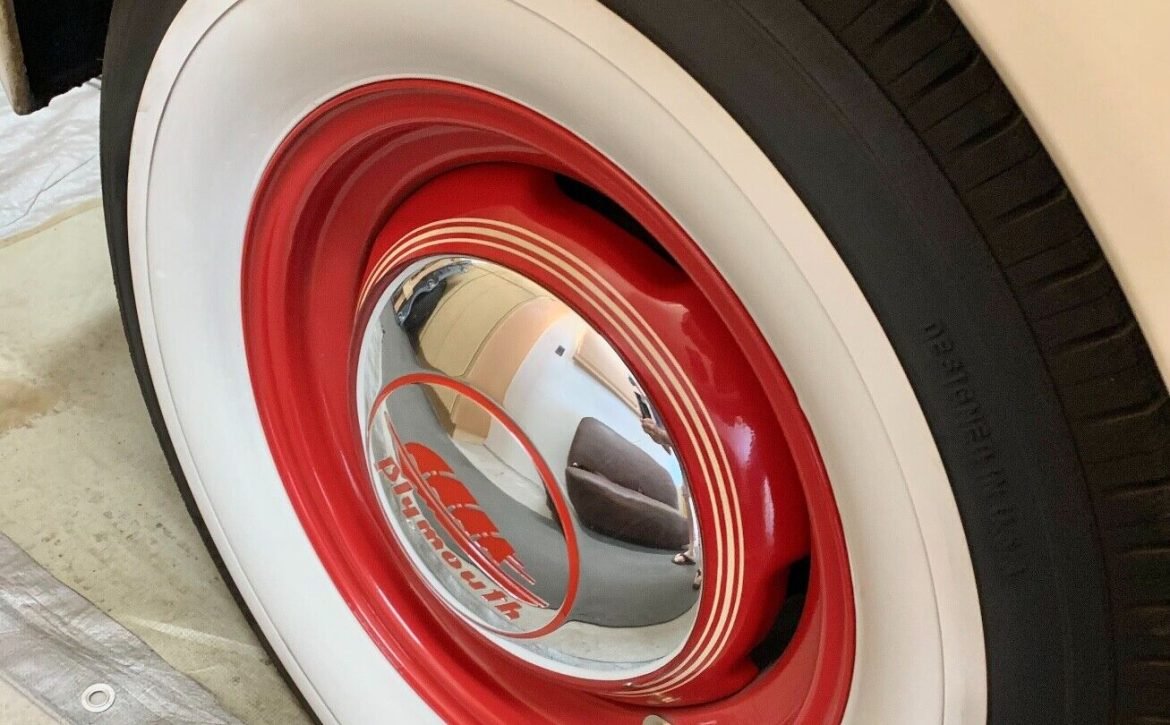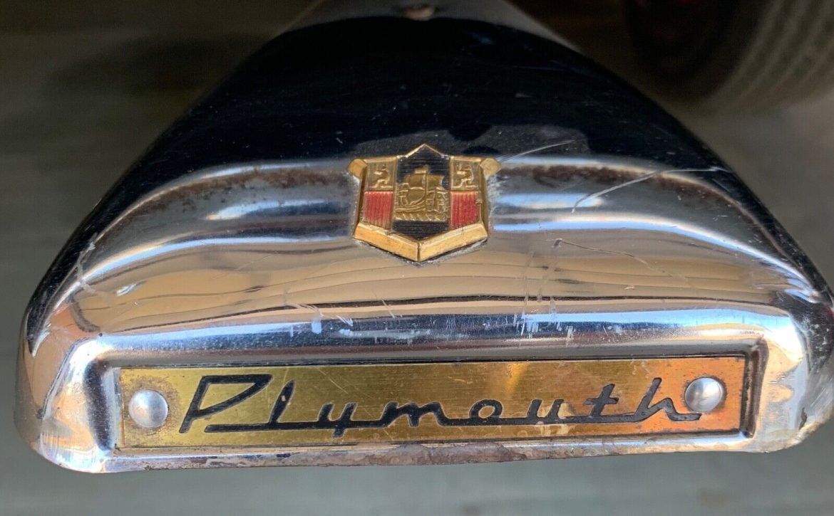 - New Plymouth hubcaps and a rare Plymouth muffler accessory.
