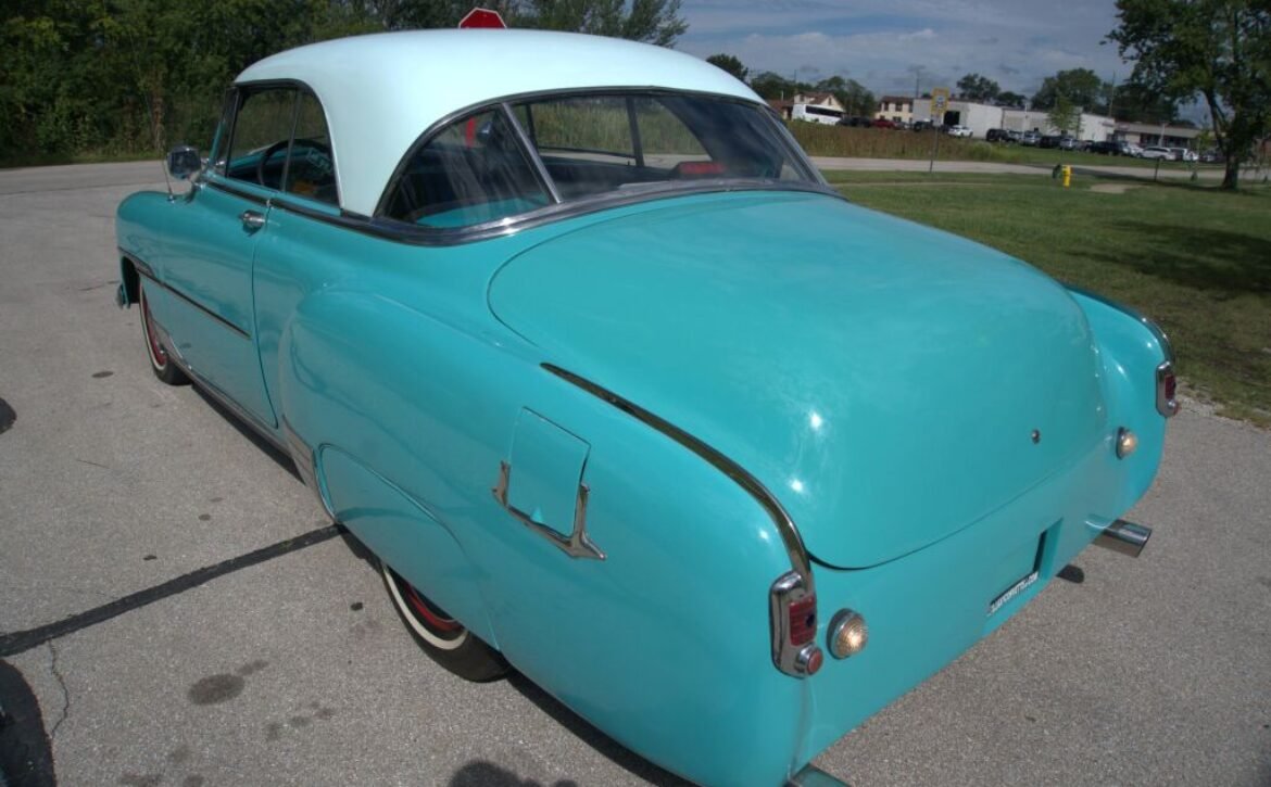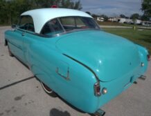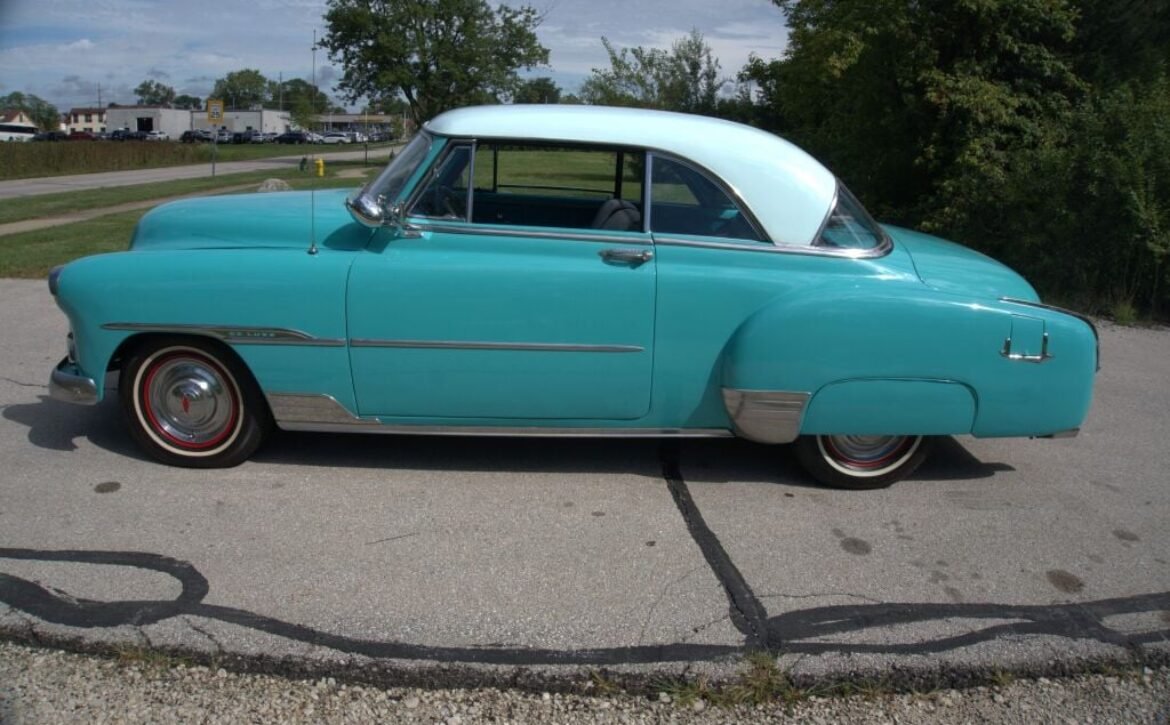 Blue/whiteIntroducing the 1951 Chevy Bel Air – a timeless classic that’s ready to hit the road. This eye-catching vehicle features a solid teal blue exterior with a distinct white top, subtly blending vintage charm with a hint of modern appeal. Though it has a few minor paint chips on the hood, it remains a standout piece.
