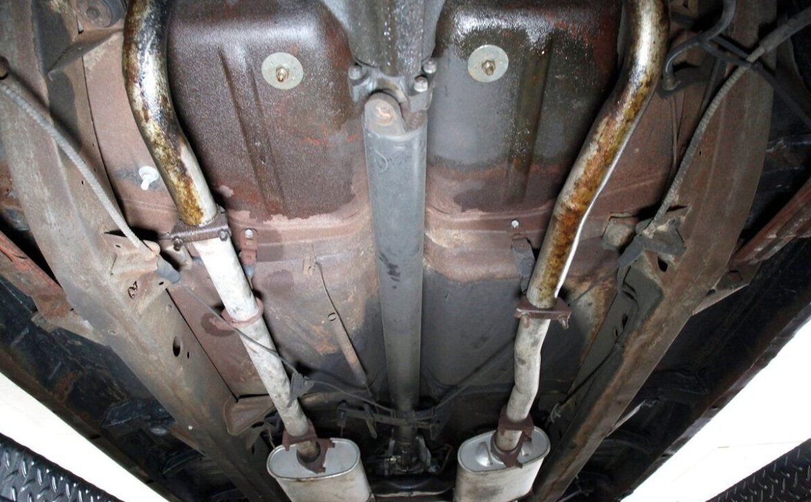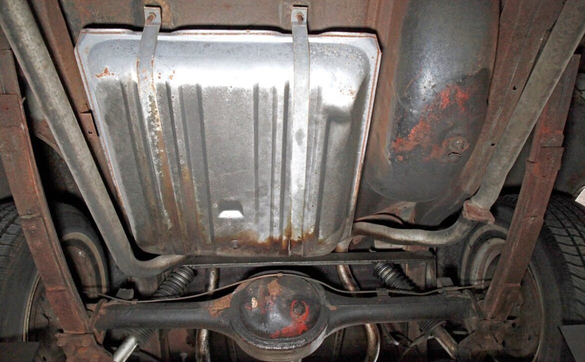 Below deck, the undercarriage exhibits typical surface rust throughout, especially on the frame, wheel wells, and rockers. However, oil seepage from the engine and rear differential has preserved some areas from deeper rust intrusion.