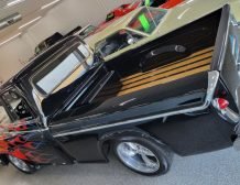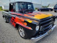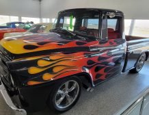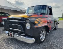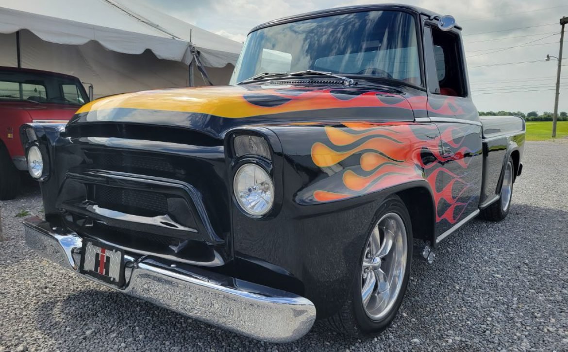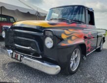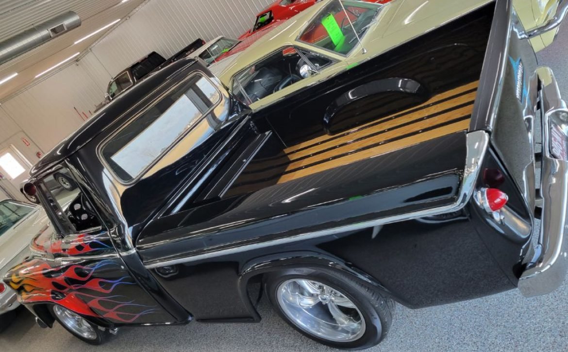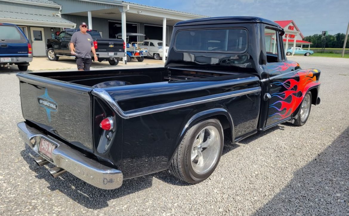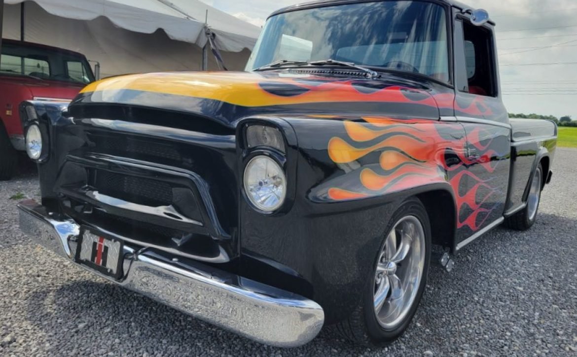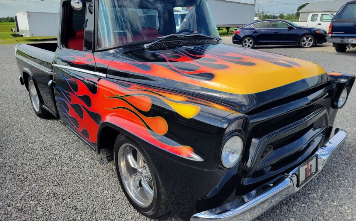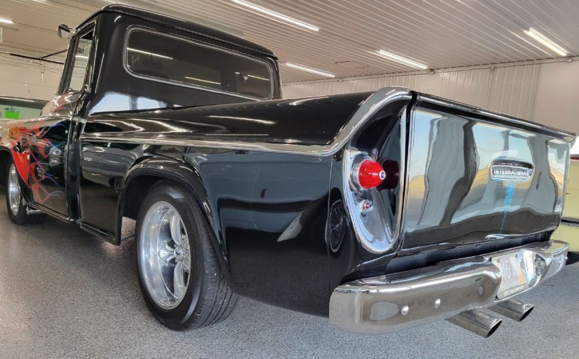BlackExperience the timeless appeal of this completely restored 1957 International Pickup. With its glossy black paint finish and striking multicolored flames elegantly adorning the front and sides, this custom truck is sure to turn heads wherever it goes. The exterior is further complemented by its chrome grille and bumpers, adding a touch of classic charm.
