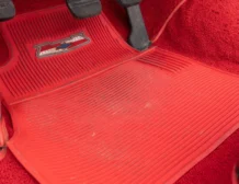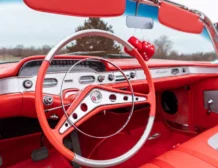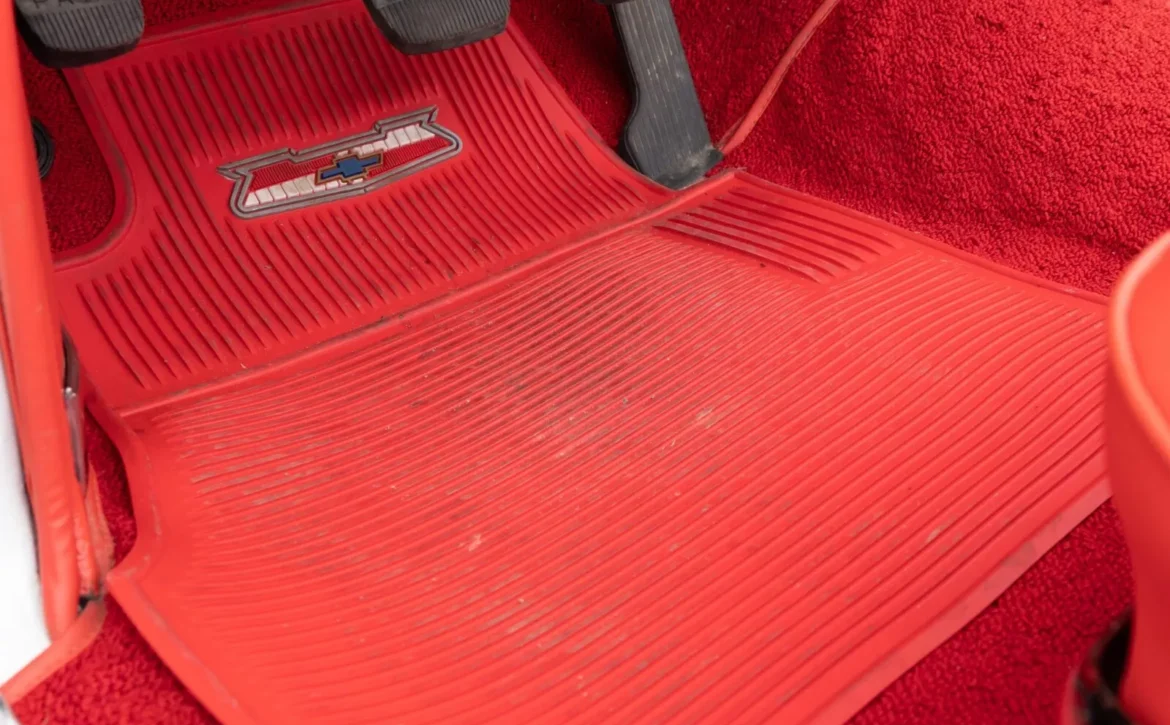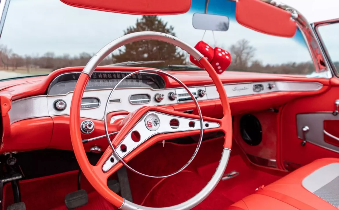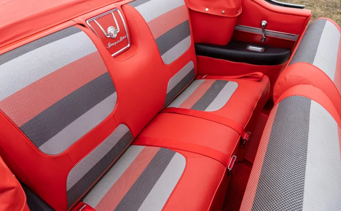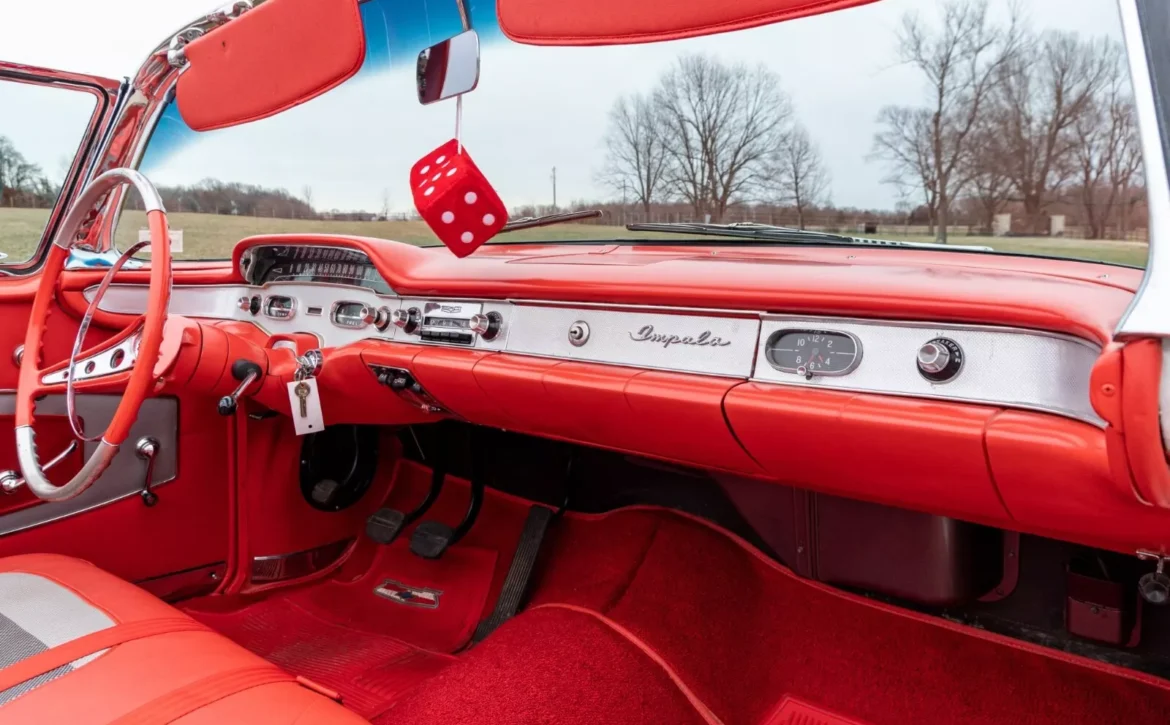 Red vinyl interior that contrasts beautifully with the white exterior and provides a bold, classic look.