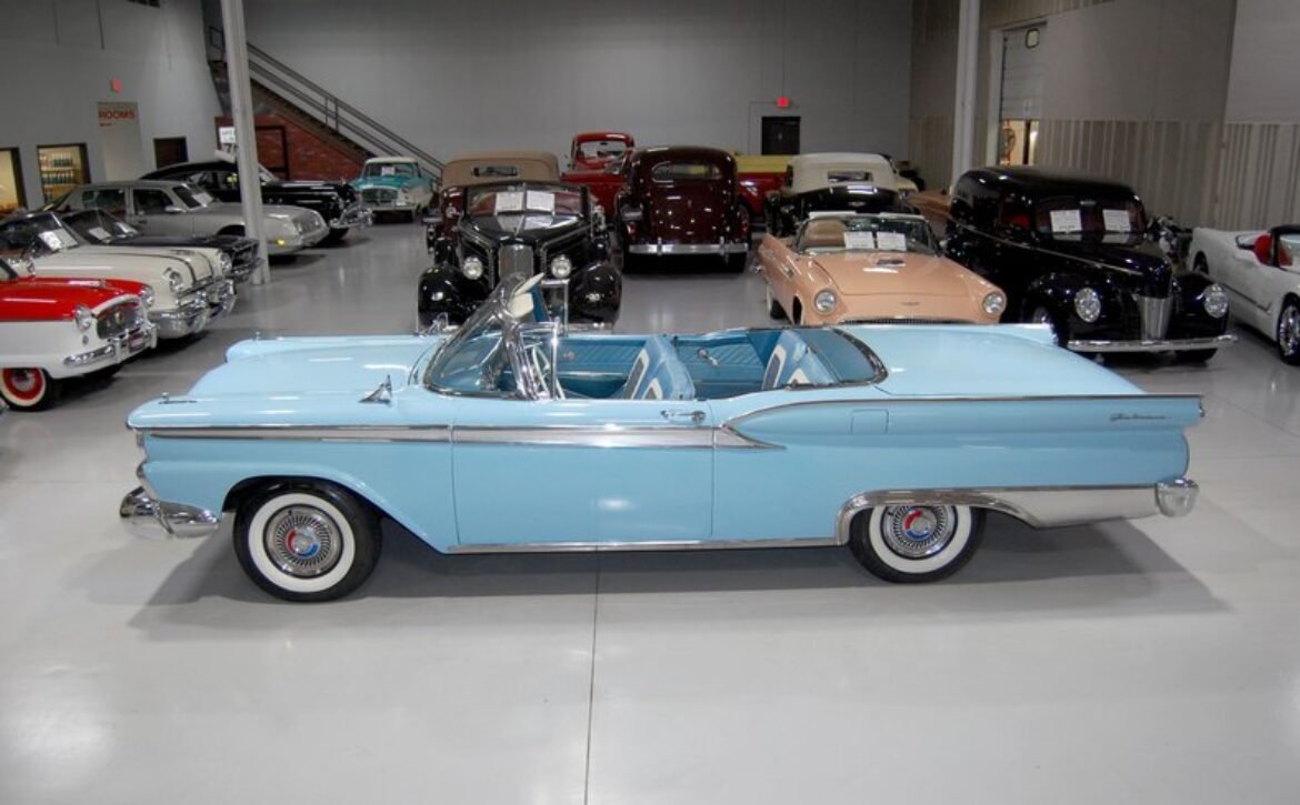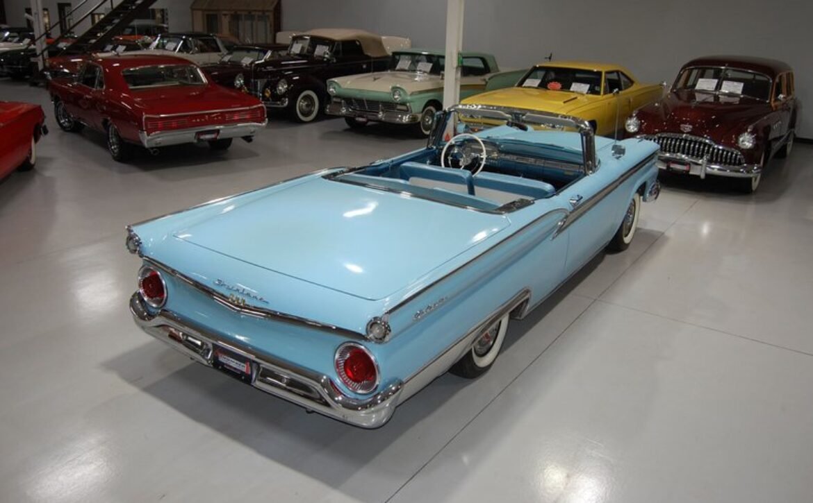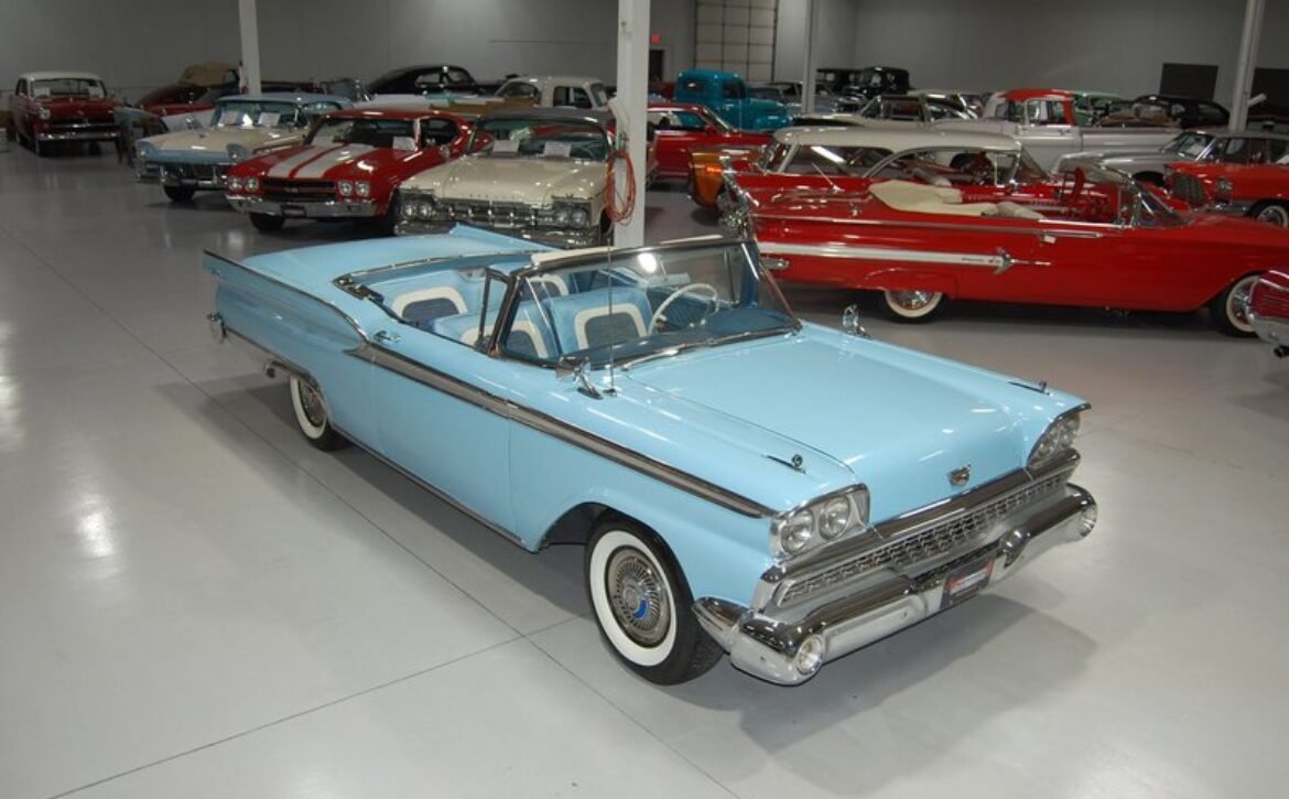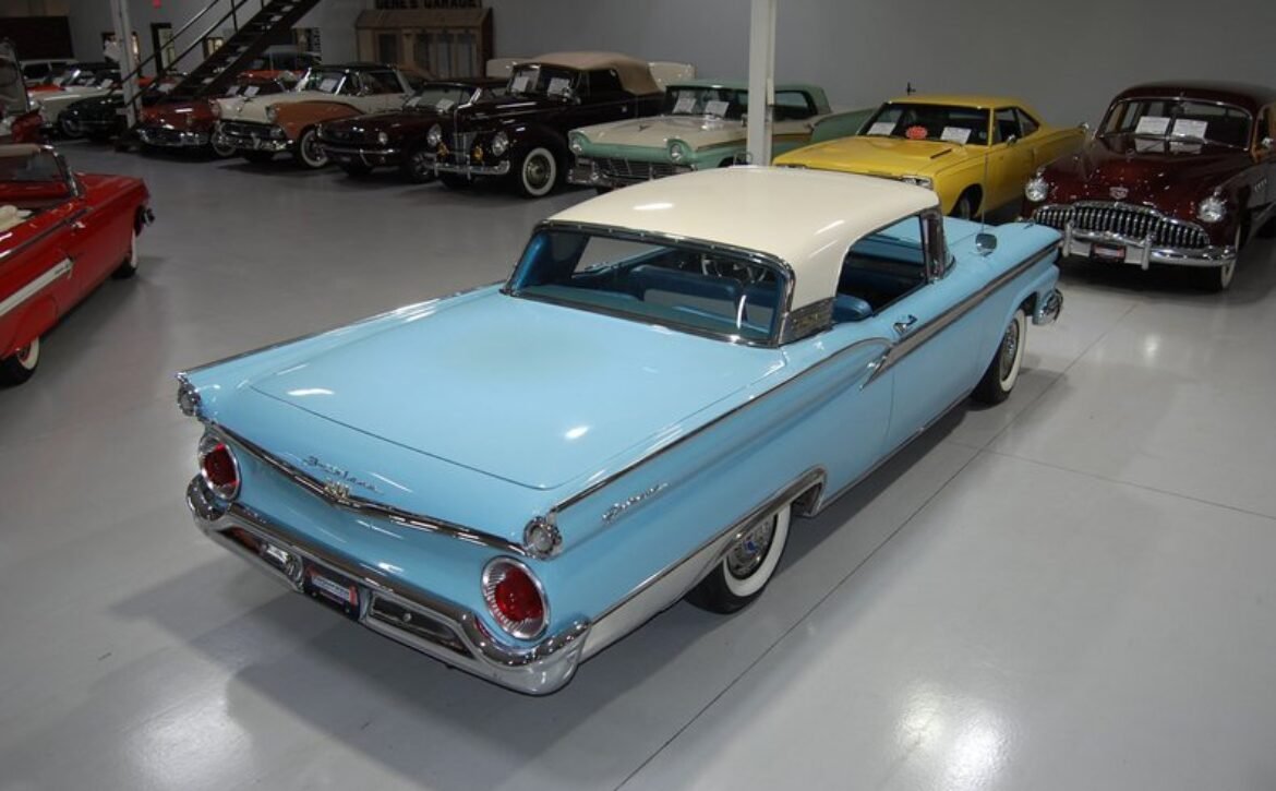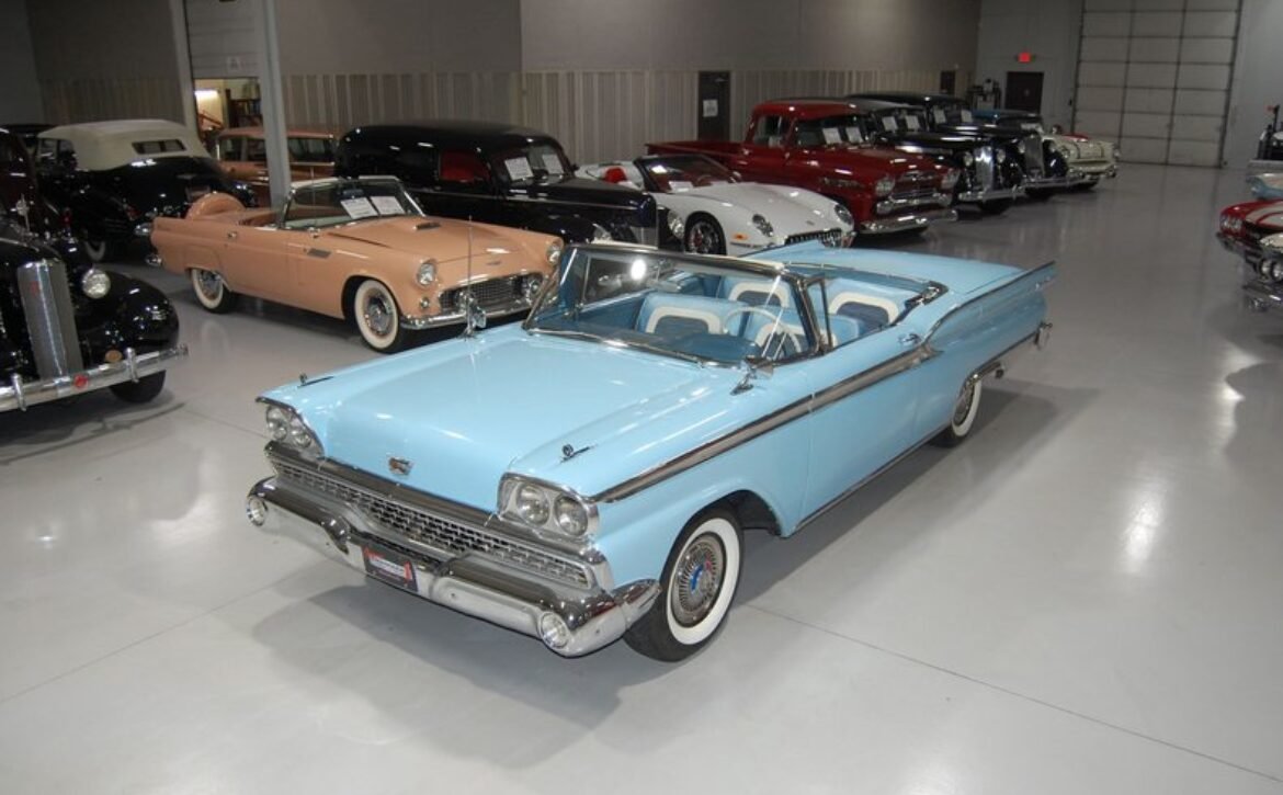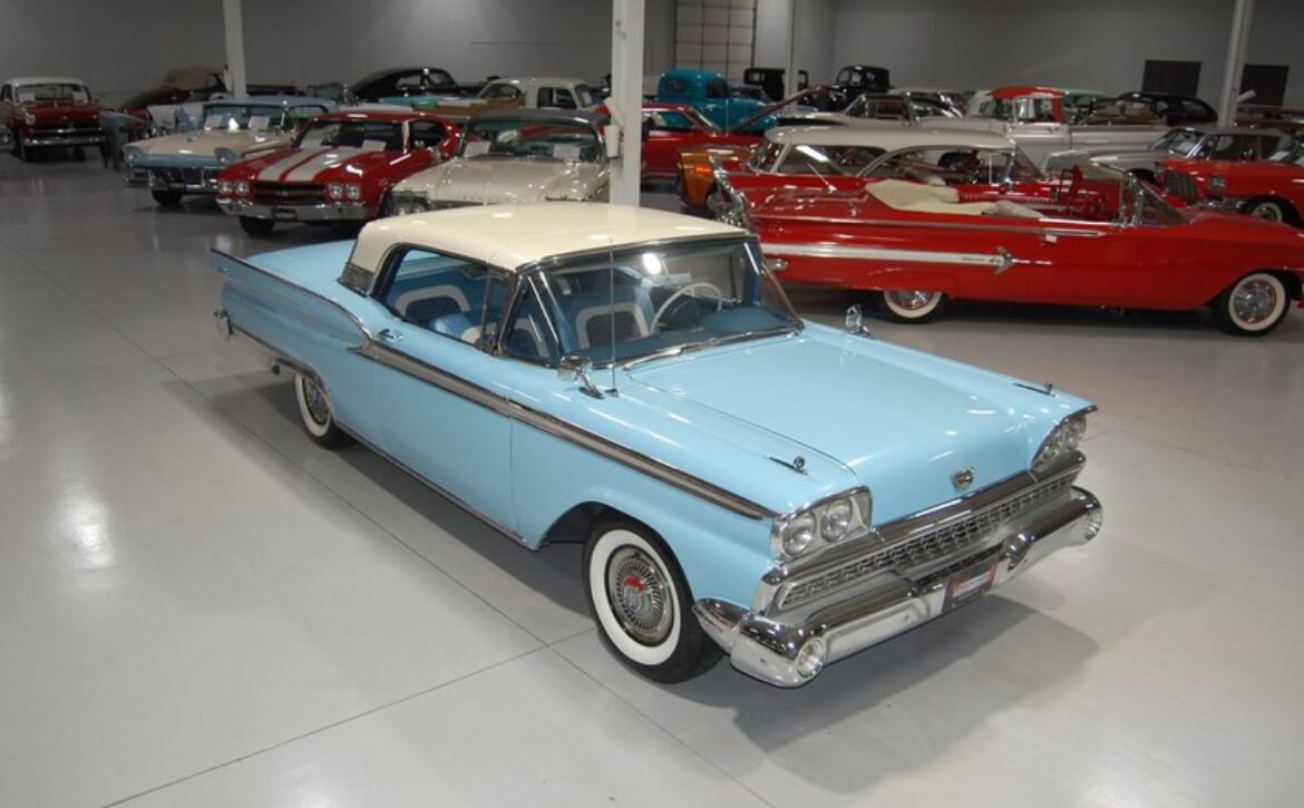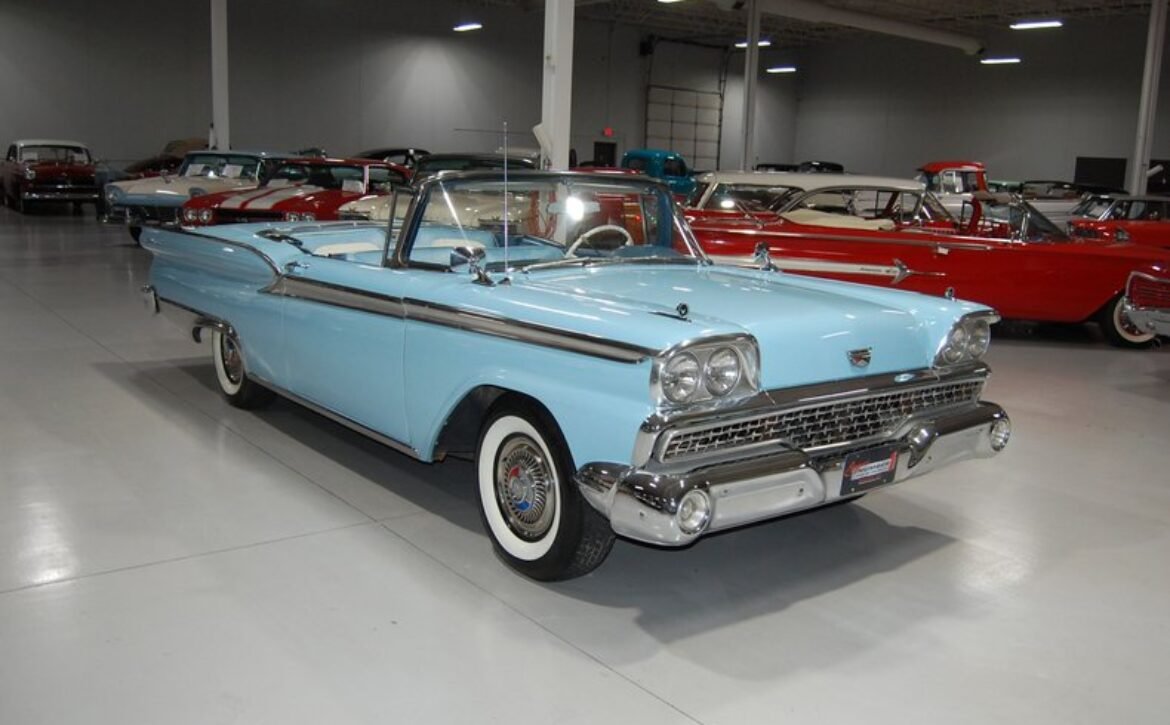 Experience a piece of 1950s automotive engineering excellence with this stunning 1959 Ford Fairlane 500 Galaxie Skyliner. This classic car represents the final year of production for the Skyliner model, renowned for its innovative retractable hardtop that merges the elegance of a hardtop with the open-air freedom of a convertible. This model is a rare find, being one of only 12,915 Skyliners produced in 1959.