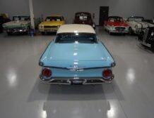 The elegantly designed exterior features a two-tone finish in Wedgewood Blue and Colonial White, which complements its iconic styling. The vehicle rides on wide whitewall radial tires accentuated by Sun-Ray center caps, offering not only a smooth ride but also a classic appearance that captures the era’s style.