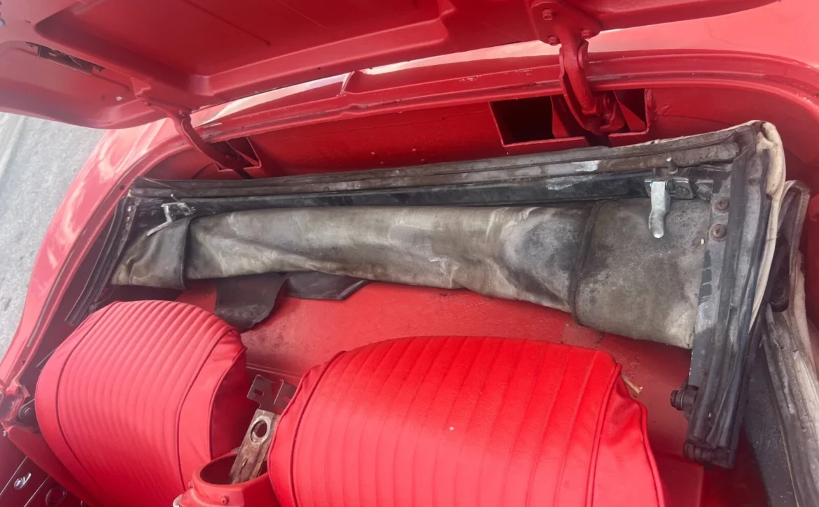 The soft top will need to be redone, as it hasn’t been raised in a long time. The hardtop is complete and in good condition.