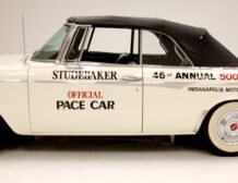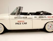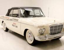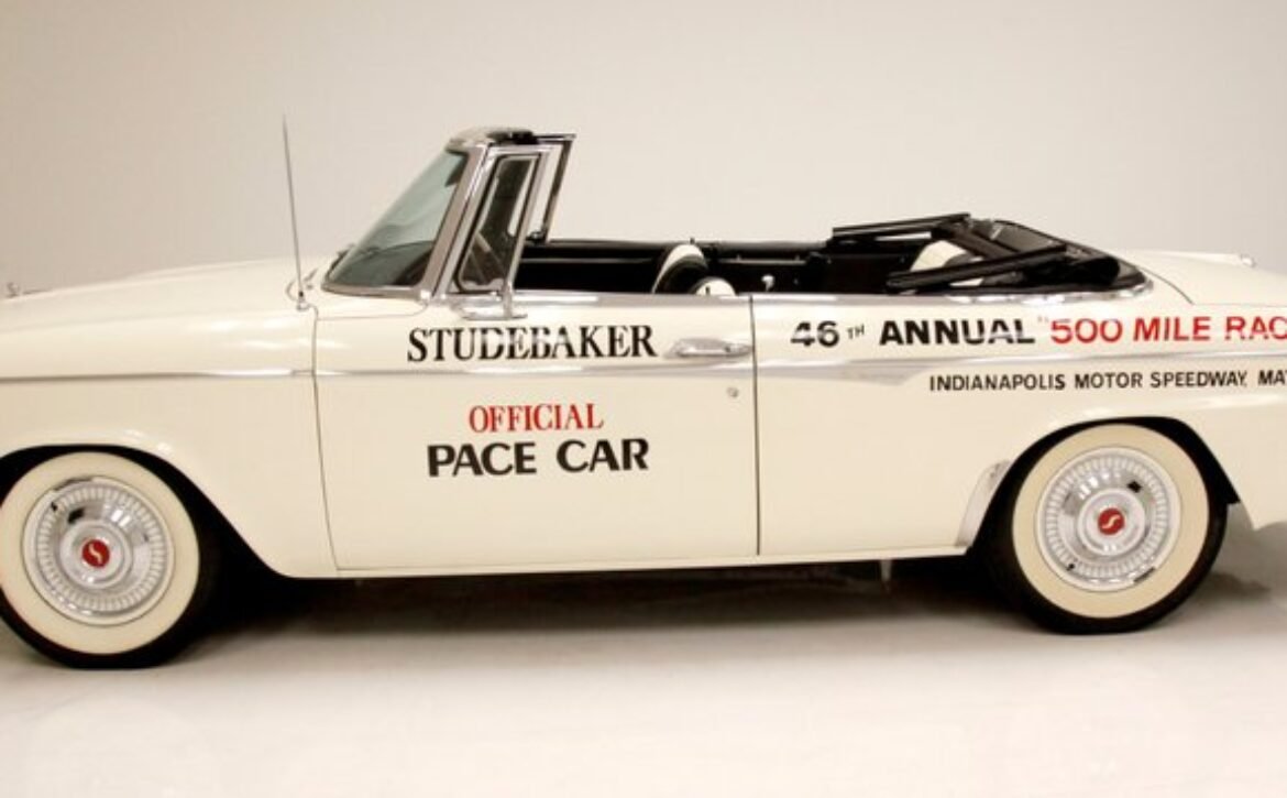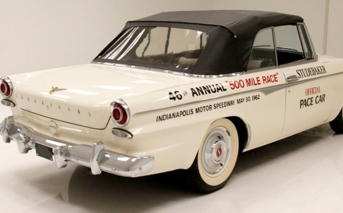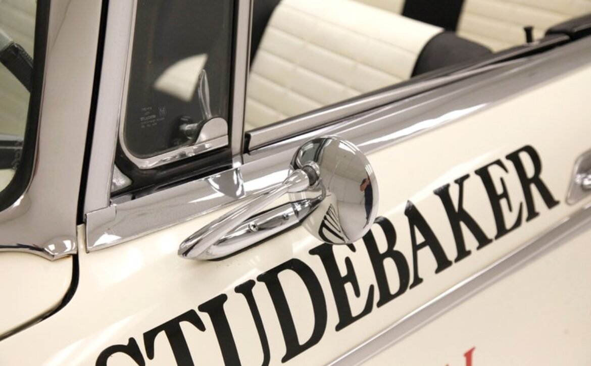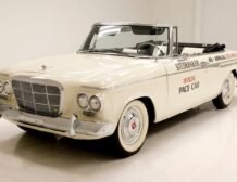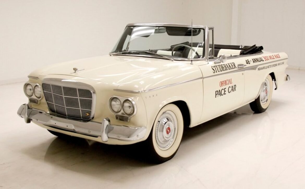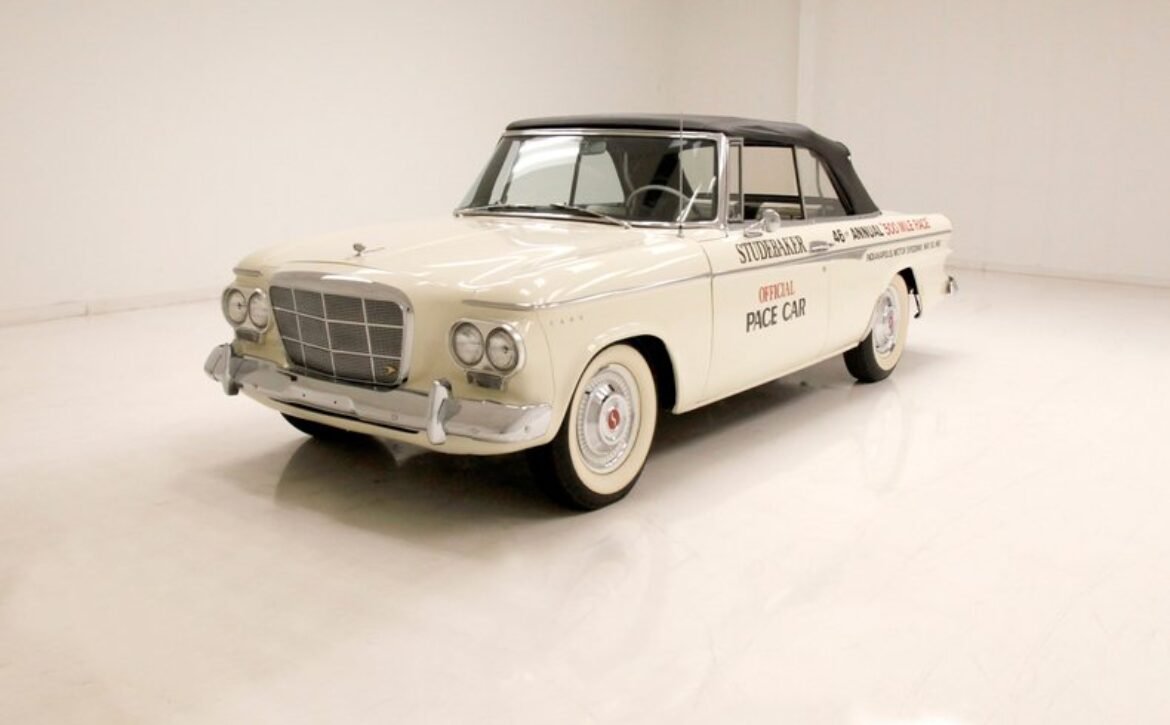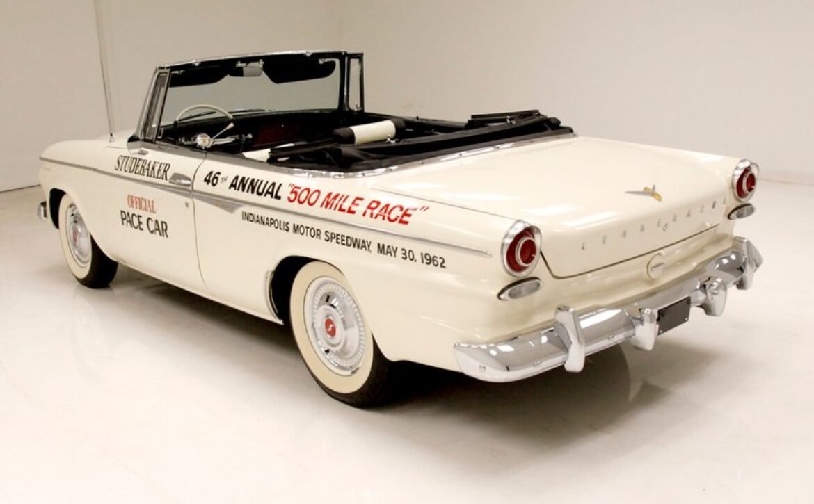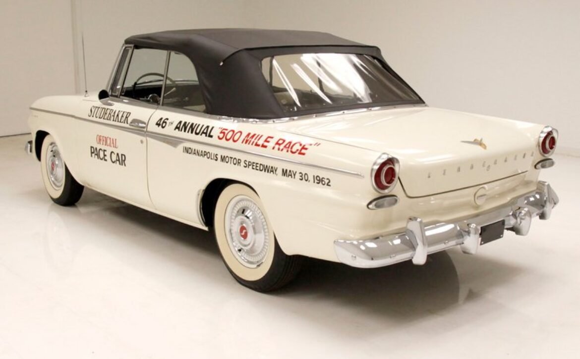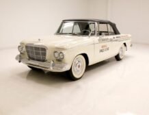 Presenting a 1962 Studebaker Daytona Lark convertible, a splendid representation of classic 60’s automotive design. This vehicle is adorned with graphics reminiscent of the 1962 Indianapolis 500 pace car, making it a unique and highly desirable collector’s item. The striking dual headlights are framed in chromed bezels with distinctive overhanging visors, echoing the sophisticated design of yesteryear. Its beautifully preserved white exterior is accentuated by a polished stainless windshield surround and chrome-trimmed features, all while rolling gracefully on Studebaker straight-faced rims wrapped in wide whitewall tires.