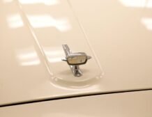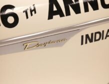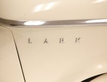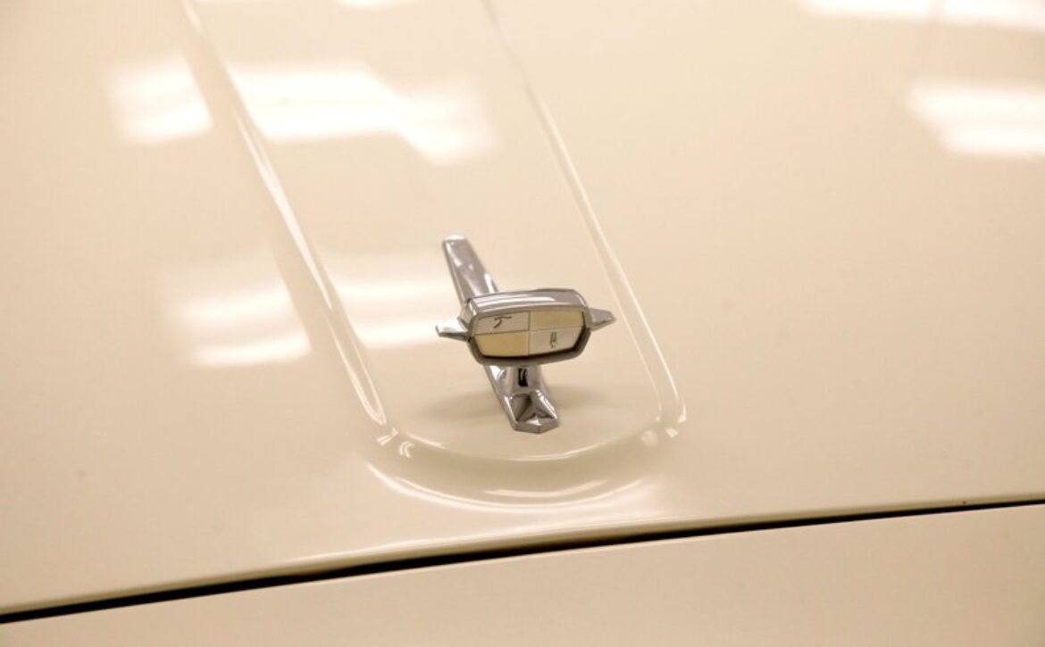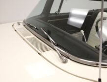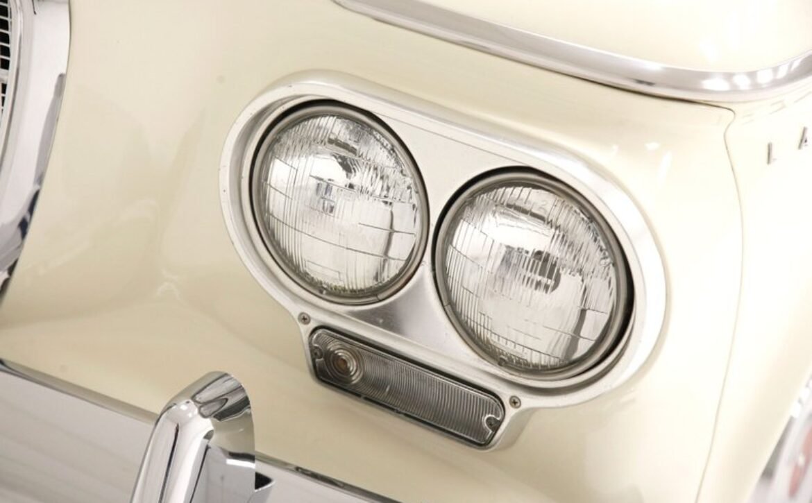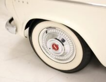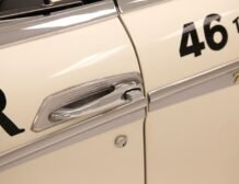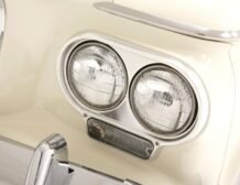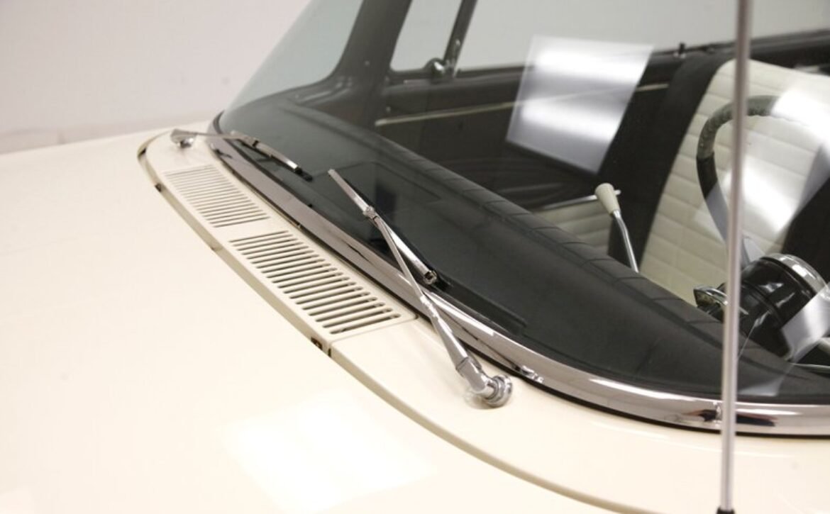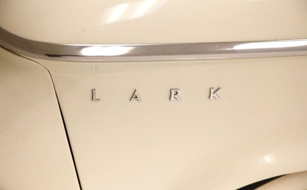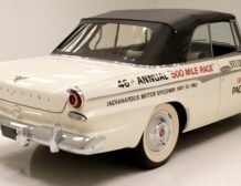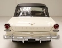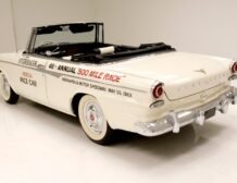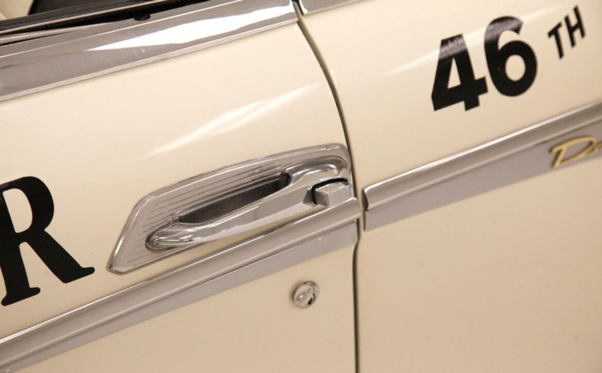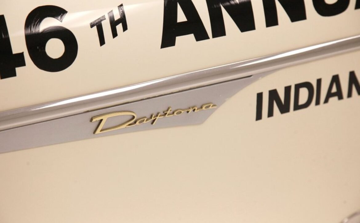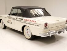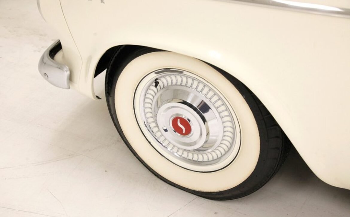 Presenting a 1962 Studebaker Daytona Lark convertible, a splendid representation of classic 60’s automotive design. This vehicle is adorned with graphics reminiscent of the 1962 Indianapolis 500 pace car, making it a unique and highly desirable collector’s item. The striking dual headlights are framed in chromed bezels with distinctive overhanging visors, echoing the sophisticated design of yesteryear. Its beautifully preserved white exterior is accentuated by a polished stainless windshield surround and chrome-trimmed features, all while rolling gracefully on Studebaker straight-faced rims wrapped in wide whitewall tires.
