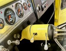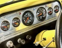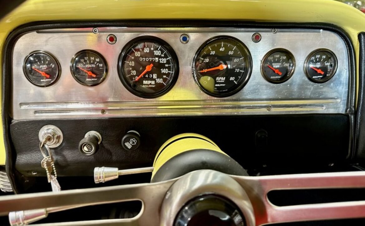 The interior has been fully refurbished and offers comfort with grey and black cloth upholstery over a split bench seat. A built-in center console, black vinyl dash, and door panels with black carpeting complete the look. Amenities include an AM/FM/CD stereo, heat and air conditioning, and an anti-theft battery shutoff switch. It features manually cranked windows and a comprehensive Stewart Warner gauge set, including a 160-mph speedometer, tachometer, and additional dials for fuel level, battery voltage, coolant temperature, and oil pressure. The odometer reads 6,970 miles, indicative of the mileage since the build was completed.