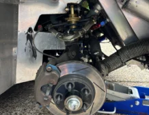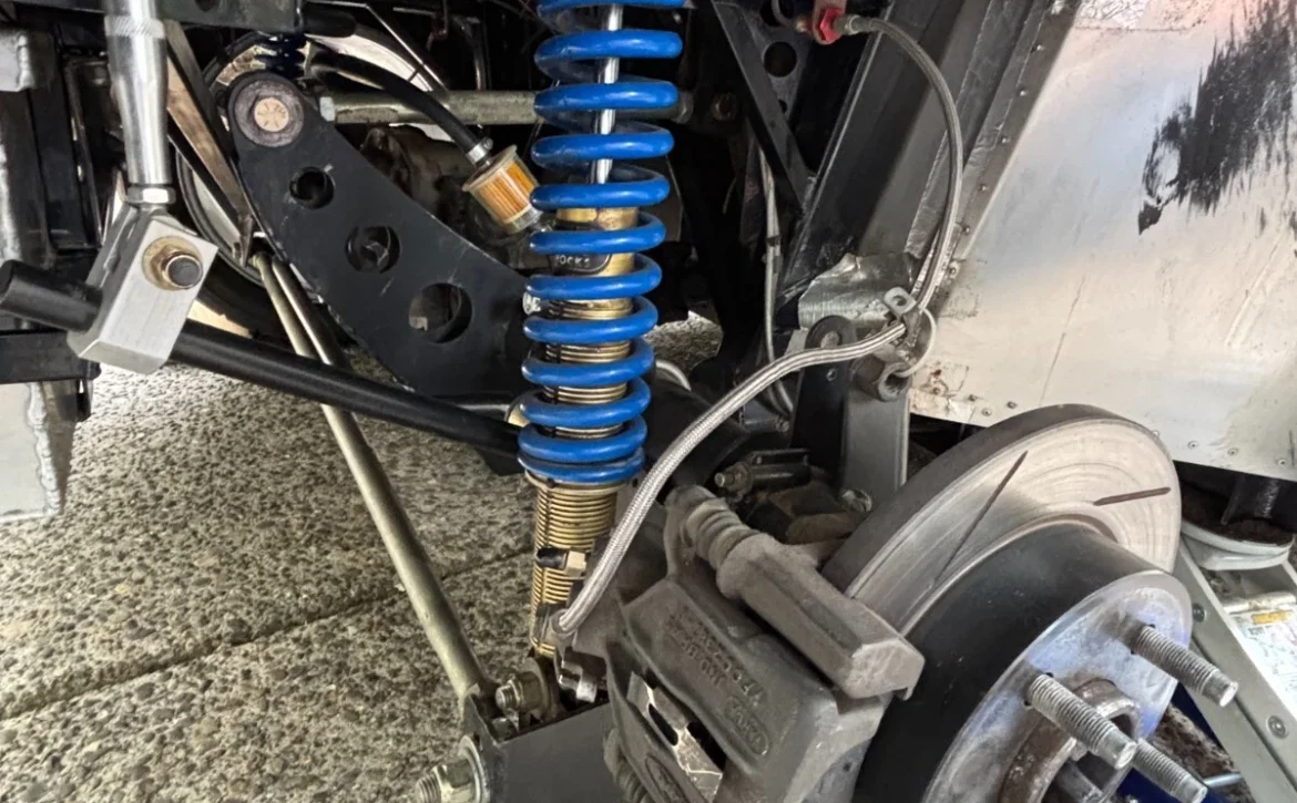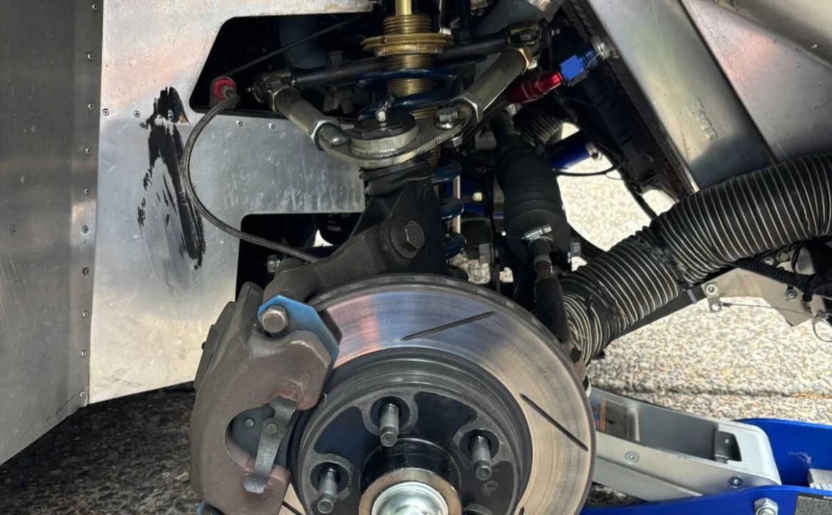 Front: 1985 Mustang SVO calipers, 10.9” slotted rotors, Hawk Blue pads, air duct cooled