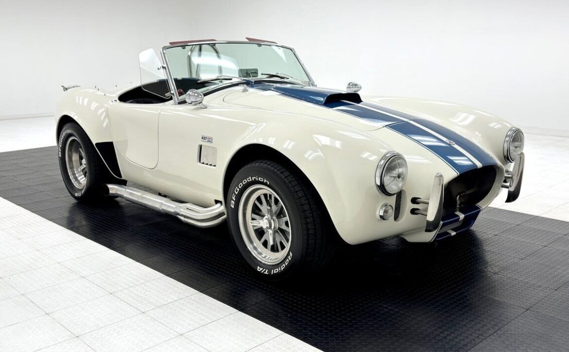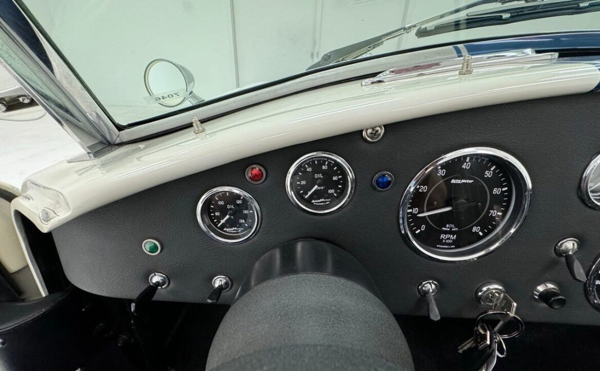 Paint & Trim: Finished in an American White with blue racing stripes, this Cobra honors the original racing heritage. The reflective accents include light trim rings, bumperettes, side mirrors, window frame, roll bar, and polished headers, all enhancing its aggressive look.