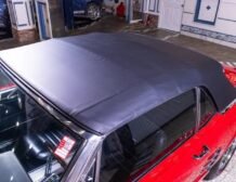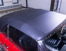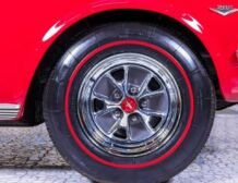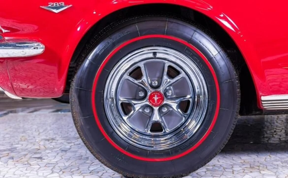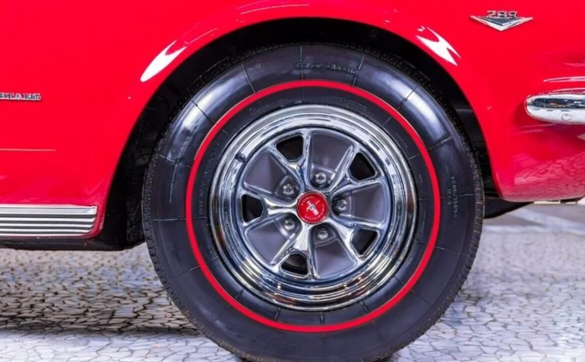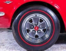 The exterior of this Mustang is beautifully showcased in Signalflare Red with a mirror-like finish achieved through a detailed base coat clear coat process, followed by wet sanding, buffing, and polishing. Gold pin striping accentuates the sleek lines, complemented by pristine rocker moldings. Every piece of trim and stainless steel shines brilliantly, with restored front and rear bumpers adding to the vehicle’s impressive appearance. This Mustang is fitted with a power-operated convertible top in black, with a matching boot, sitting on 14″ Styled Steel Wheels accompanied by Coker Redline Tires. The panel fit is impeccable, ensuring a seamless and attractive silhouette.