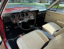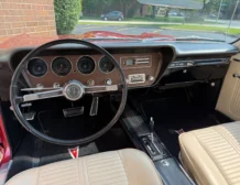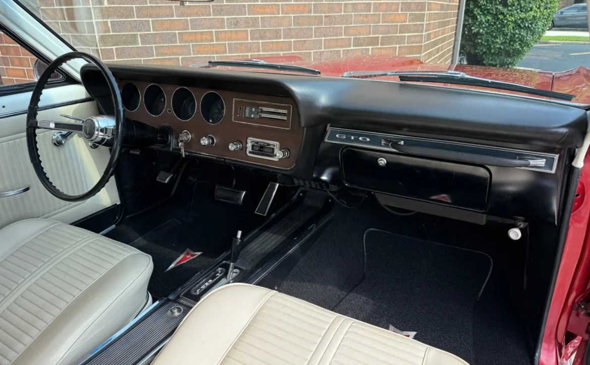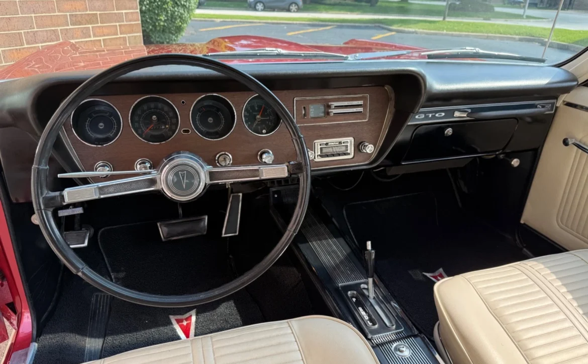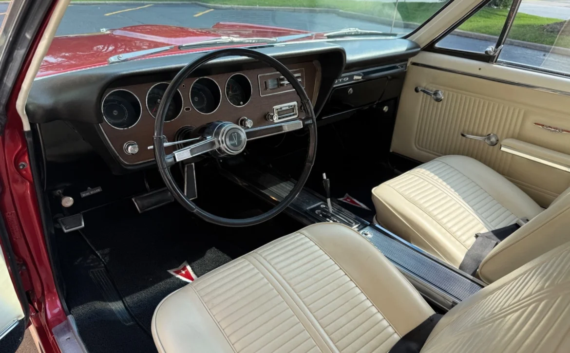 Original steering wheel, woodgrain dash, and gauges in great shape
