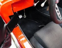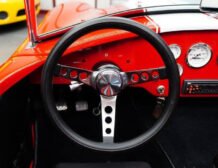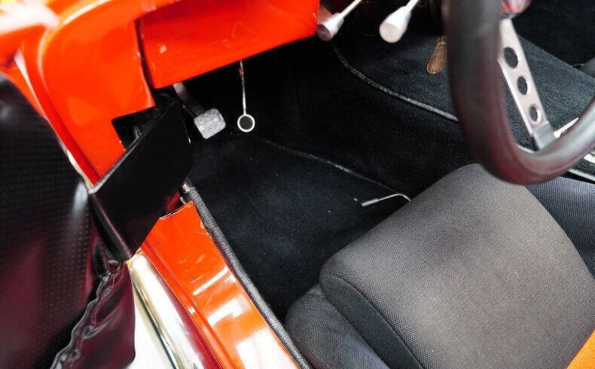 Tilton Overhung Pedals, Jensen AM/FM/CD Player, Ididit Steering Column with tilt, and a Three-Spoke Steering Wheel for a classic, race-inspired feel