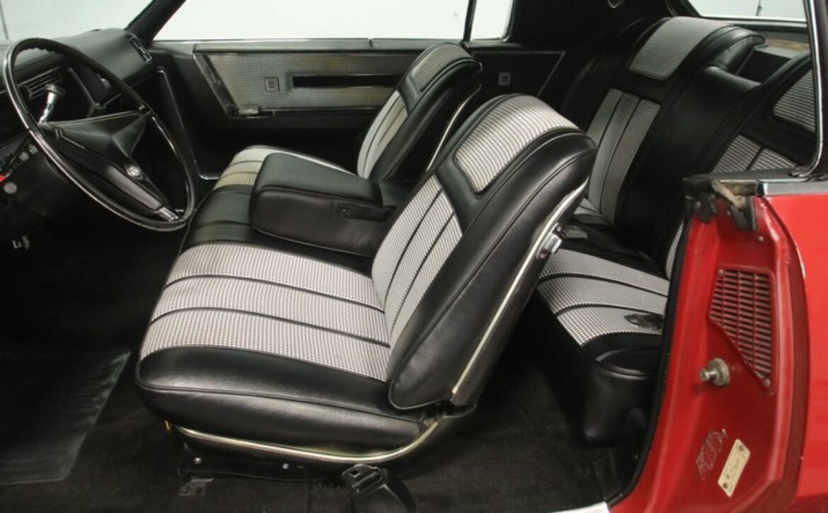 This meticulously maintained vehicle showcases its original design, including well-preserved wheel covers, ensuring a vintage and authentic presence. Inside, the spacious hardtop offers a compelling blend of elegance and muscle car flair, featuring a unique houndstooth interior that harmonizes with its black and bright detailing. Comfort is paramount, with amenities such as a fold-down front armrest, tilt/telescoping steering column, and classic features like an AM/FM radio, power locks, and power windows to enhance the driving experience.