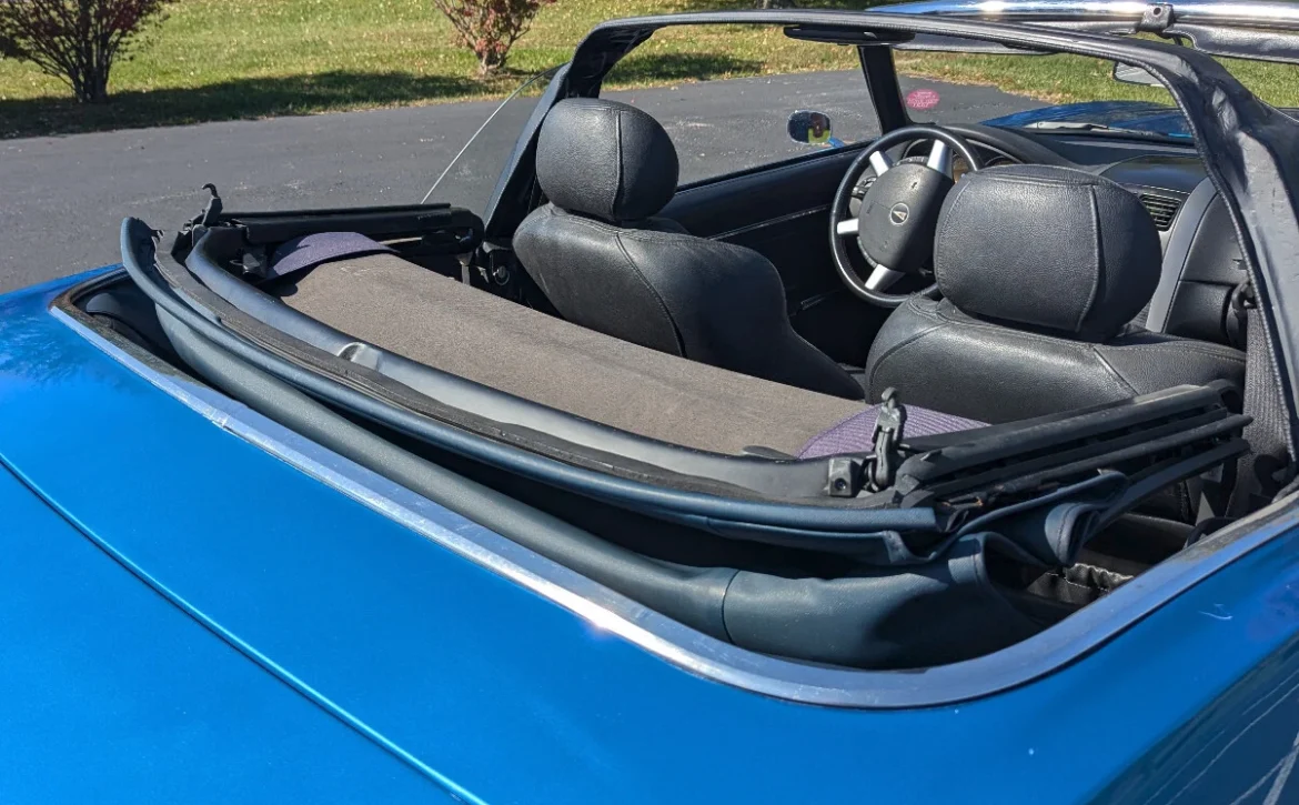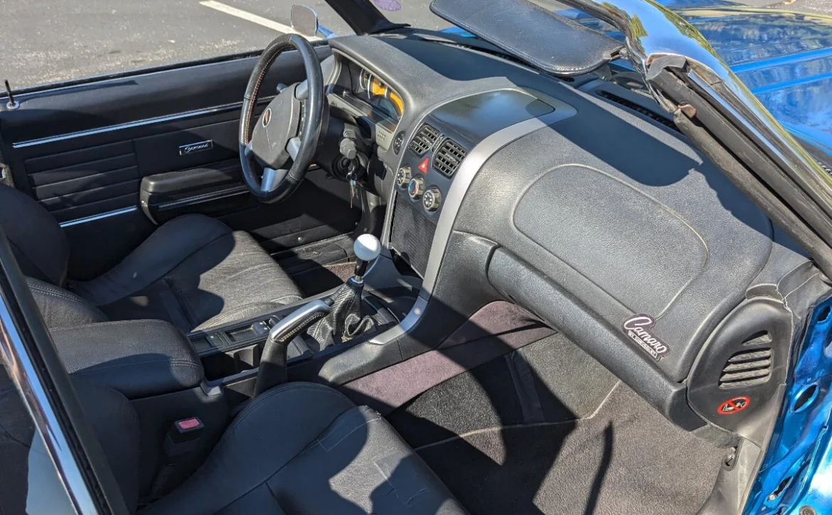This Camaro started life as a six-cylinder automatic and now features an LS1 V8, T56 6-speed manual transmission, GTO dash and interior components, updated suspension and braking, and a clean, rust-free body with original Lemans Blue on Black color scheme and a dark blue manual convertible top.