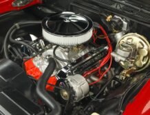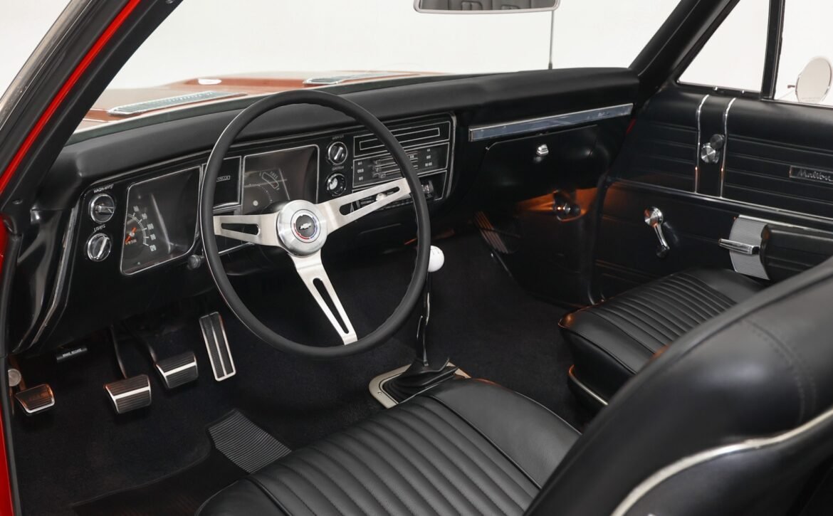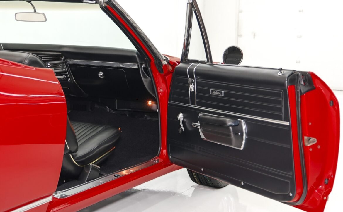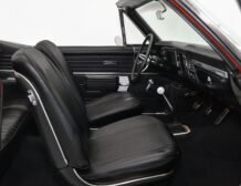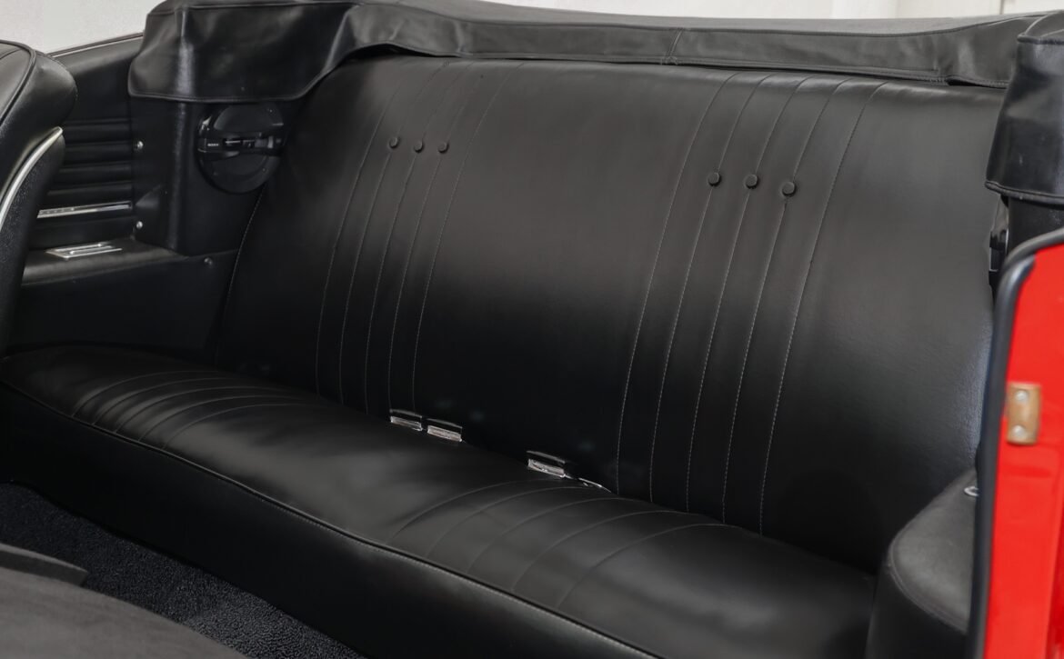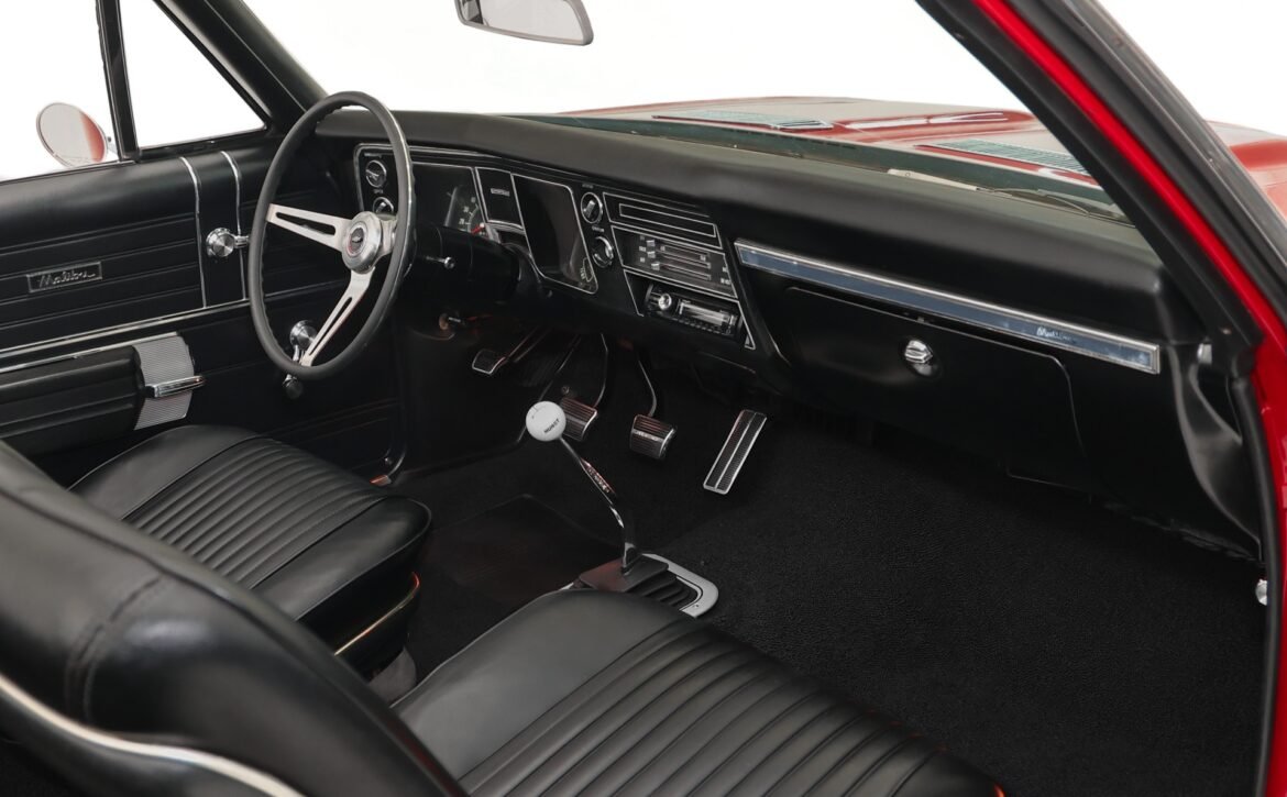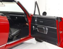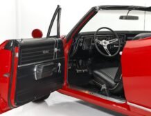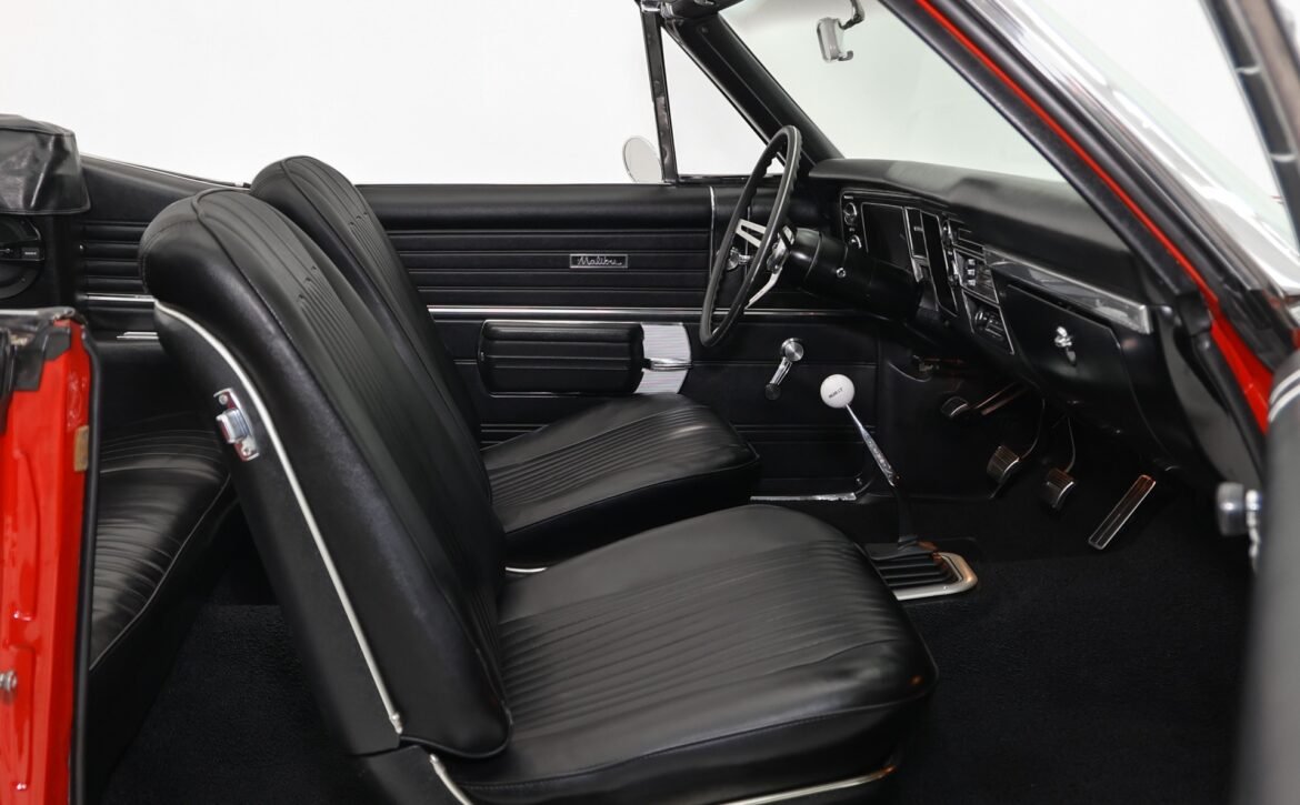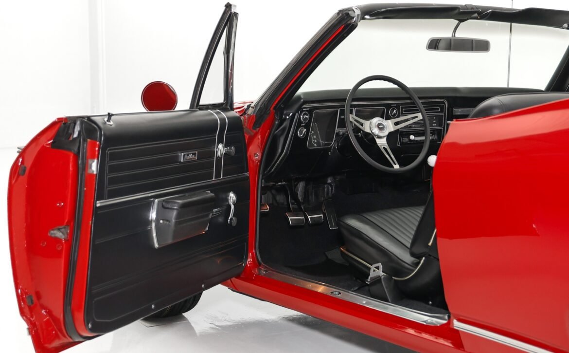 Exterior: The Chevelle’s bodywork shines with its professional finish in the original R-code Matador Red. It features an upgraded Super Sport hood, pristine chrome, stainless trim, and brand new American Racing chrome Torque Thrust wheels paired with Nitto performance tires, enhancing both its aesthetic appeal and performance. The white convertible top, in excellent condition, provides a refreshing escape from the heat and comes equipped with a top boot for open-air driving.