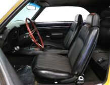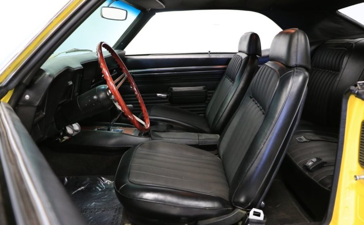 Under the hood lies a powerful and visually striking 396/402 cubic-inch V8 engine, complete with a bold orange block, shining valve covers, and a bright air grabber. This high-performance engine is equipped with a Holley four-barrel carburetor, an Edelbrock intake, and a throaty dual exhaust system featuring Flowmasters. The Muncie M20 four-speed manual transmission provides an engaging driving experience, further enhanced by power steering, power brakes, front discs, and wide BF Goodrich T/A tires. For enthusiasts, the tactile feedback from the Hurst shifter and wood-rimmed sports steering wheel sets this car apart as a true driver’s vehicle.