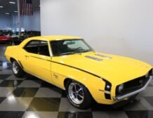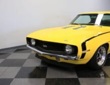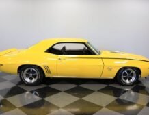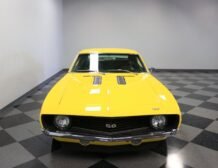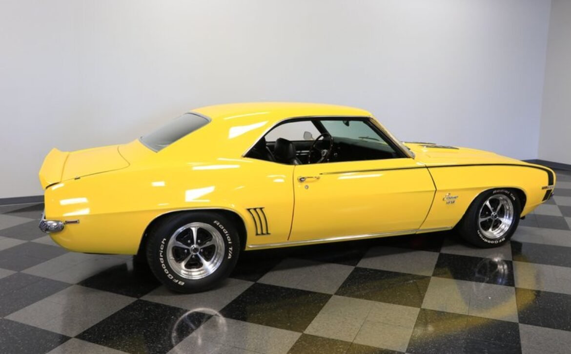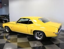 The Camaro’s striking paint job, reminiscent of GM’s ultra-desirable Daytona Yellow, provides an eye-catching gloss and radiance while maintaining the classic charm. Its dark contrasting features, including the blackout grille, deep chin spoiler, and blackout rear panels, are telltale signs of the powerhouse big block under the hood. The attention to detail is evident in the seamless side stripes and modern American Racing alloy wheels that update the classic mag-style look.