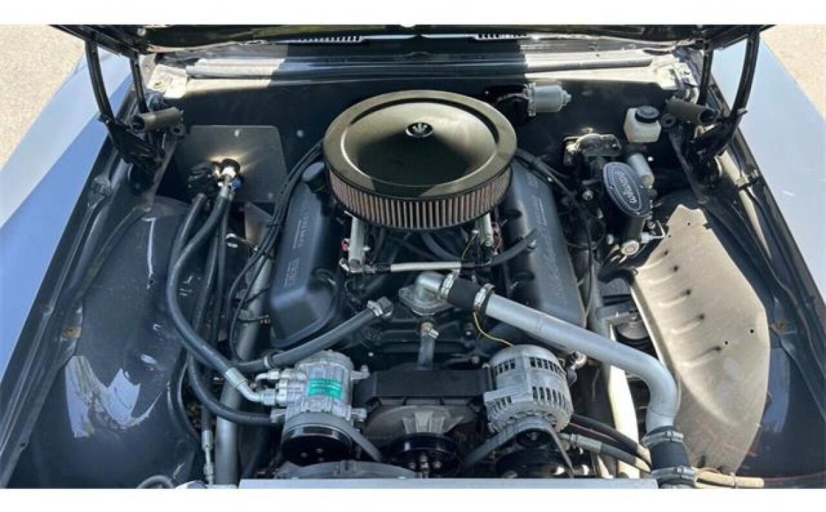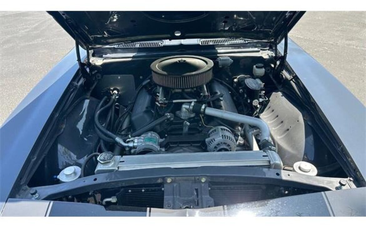 This Camaro stands proud in its authentic GM paint codes, with a stunning grey exterior and bold black racing stripes—a tribute to the muscle car era. The custom wheels, paired with a mini-tubbed rear, give this Camaro a stance that’s as aggressive as it is attractive. The car sits on a pro-touring suspension with all-new shocks and springs, ensuring a smooth and controlled ride. The custom dual exhaust finishes the look with a sound that matches the car’s fierce performance.