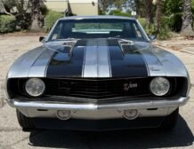 THIS… is a 1969 Chevrolet Camaro Z28 Coupe, finished in Cortez Silver with black stripes over a black interior, and powered by a modern 6.2-liter LS3 V8 mated to a Tremec T-56 6-speed manual transmission.