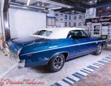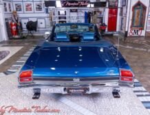 Step inside the refreshed interior adorned in dark blue accents that harmonize with the exterior. It features meticulously restored bucket seats and a matching rear bench, enhancing the driving experience. The SS is equipped with a center console and an automatic shifter. A well-maintained dashboard, correct gauges, and the classic SS steering wheel add to the authenticity. This Chevelle proudly offers Factory Air Conditioning, ensuring a comfortable ride anytime. The trunk is pristine, detailed with the correct splatter paint, and equipped with the original-style mat, jack, and spare.