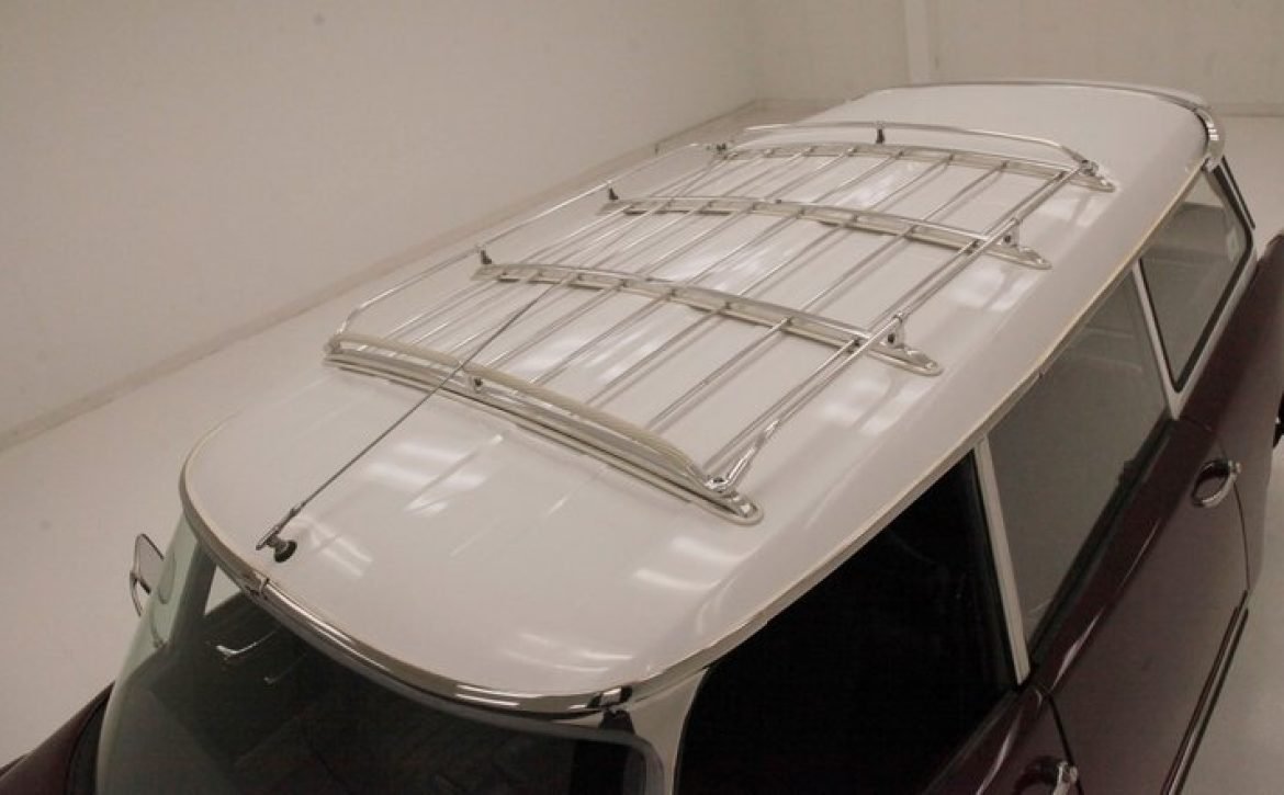 Exterior: The car’s design is highlighted with two-tone maroon paint contrasting the gray roofline, exuding an organic and sleek vibe. Equipped with a panoramic glass windshield, this Citroen includes chromed mirrors and functional roof rack, perfect for adventurous travels or daily use. Chrome-plated bumpers and dog dish wheel coverings add to its classic appeal, mounting on 185R15 redline tires.