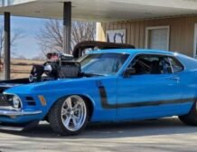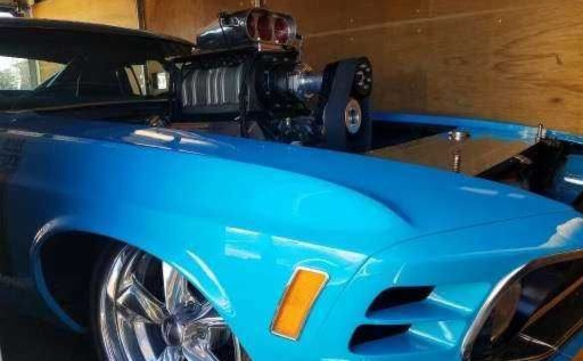 The car features a sleek blue exterior, accentuated with key components from the 1970 model including the grill, front clip, and quarter panels, adding a unique touch to its classic style. The inclusion of Wilwood 4-wheel disc brakes ensures reliable stopping power, a crucial feature for any high-performance vehicle.