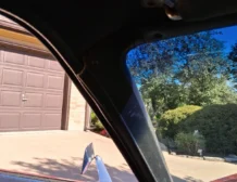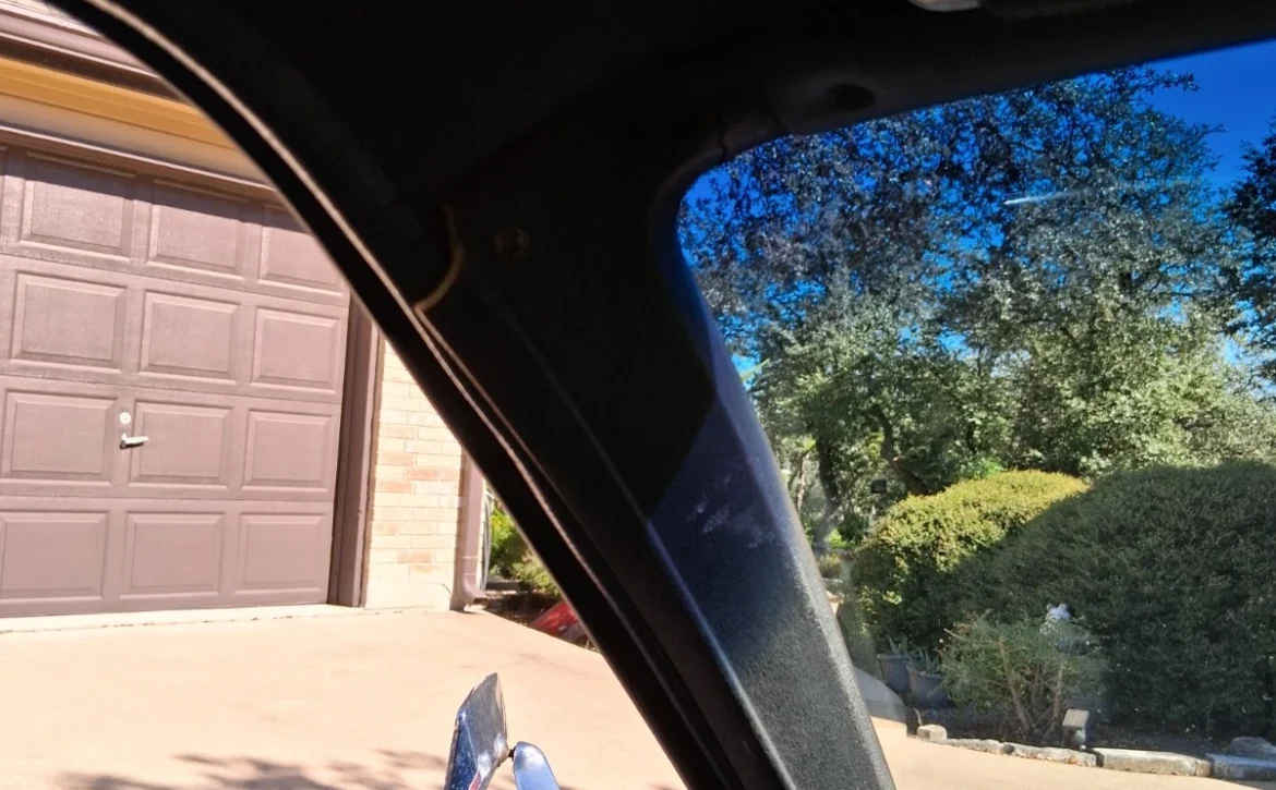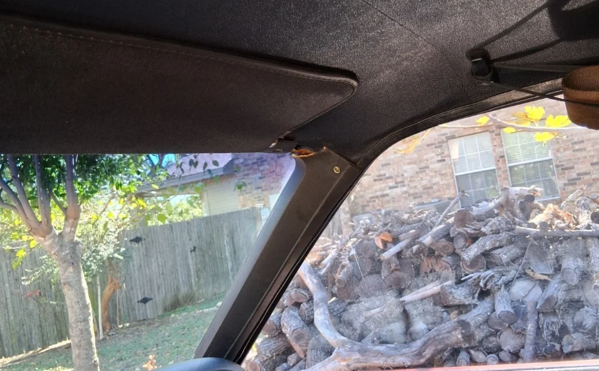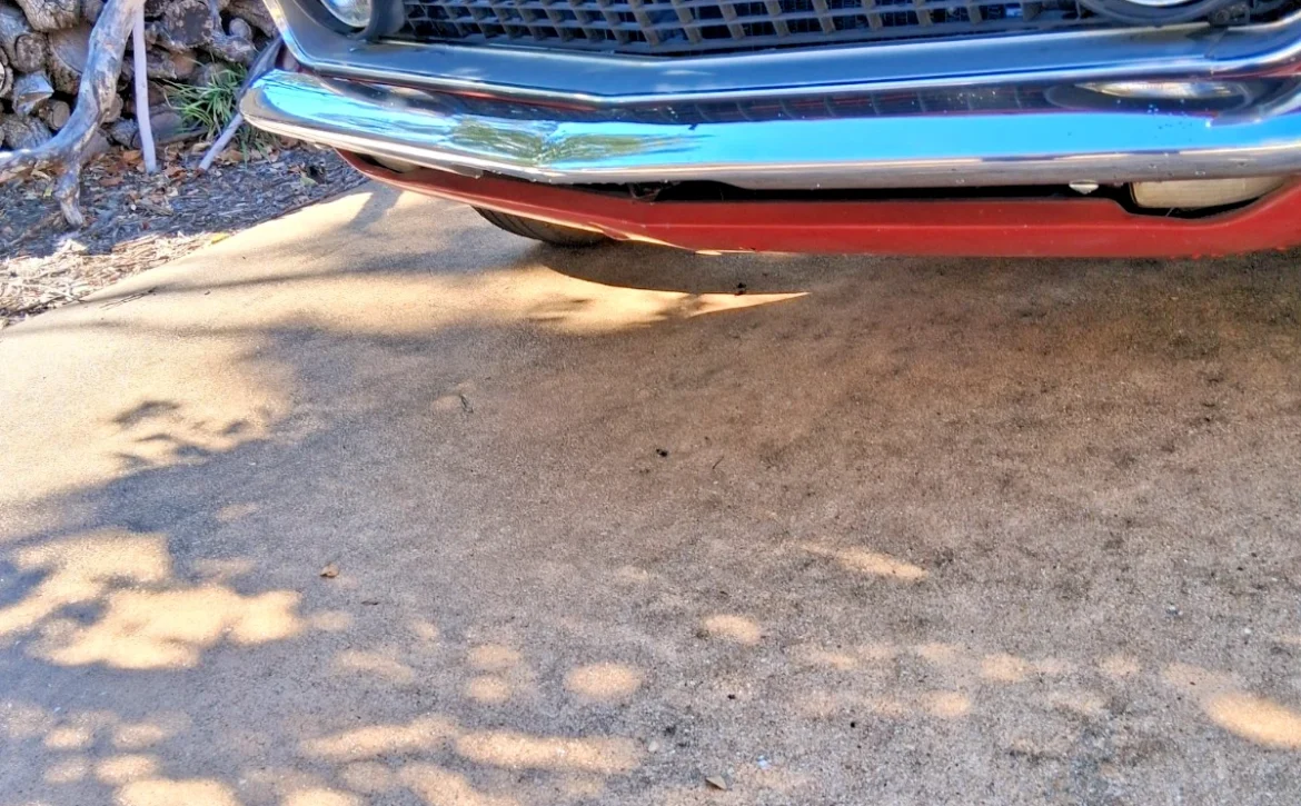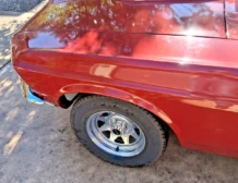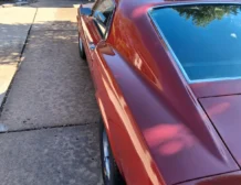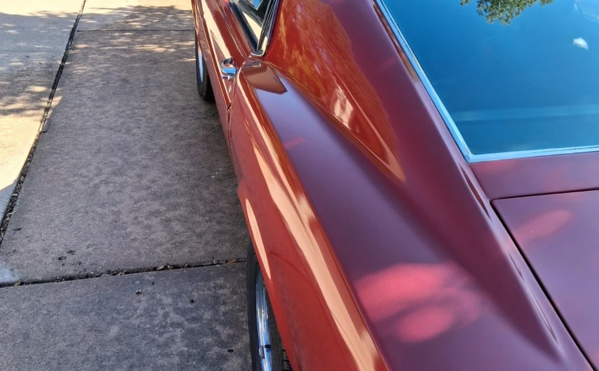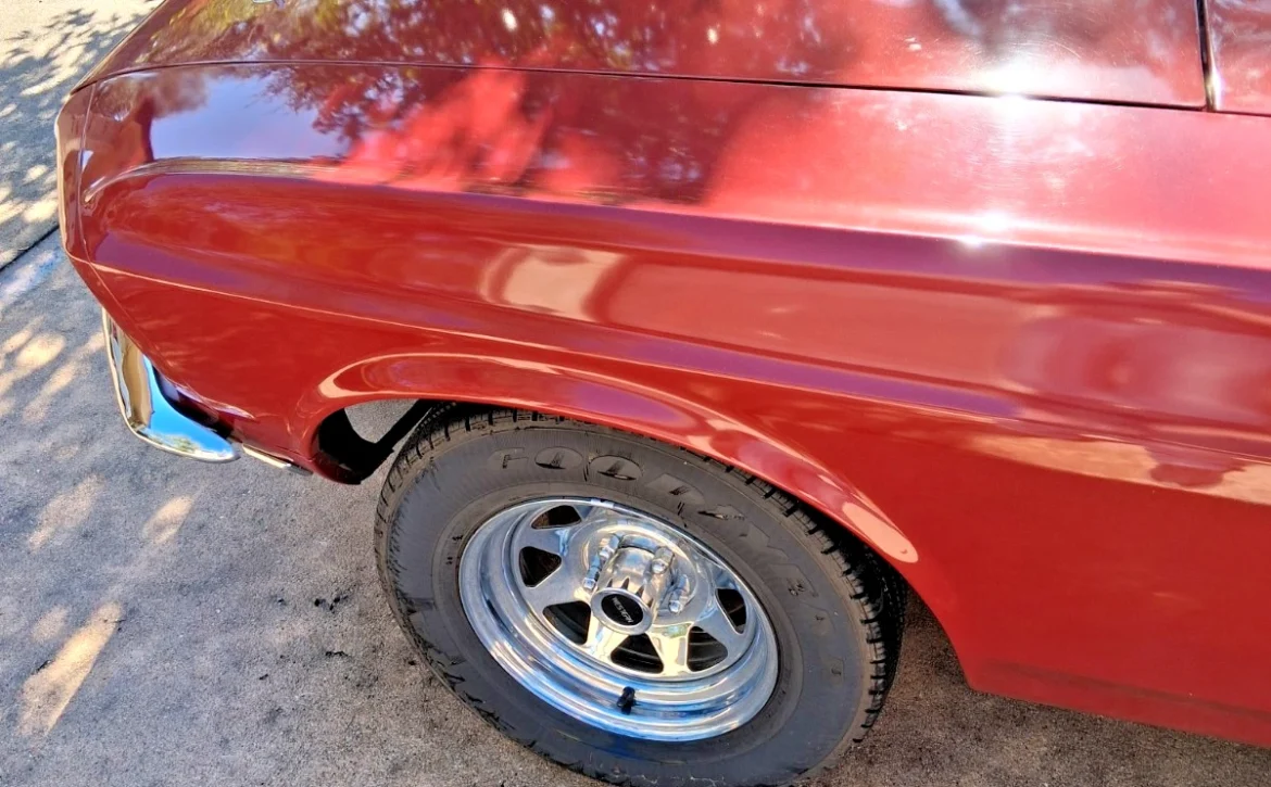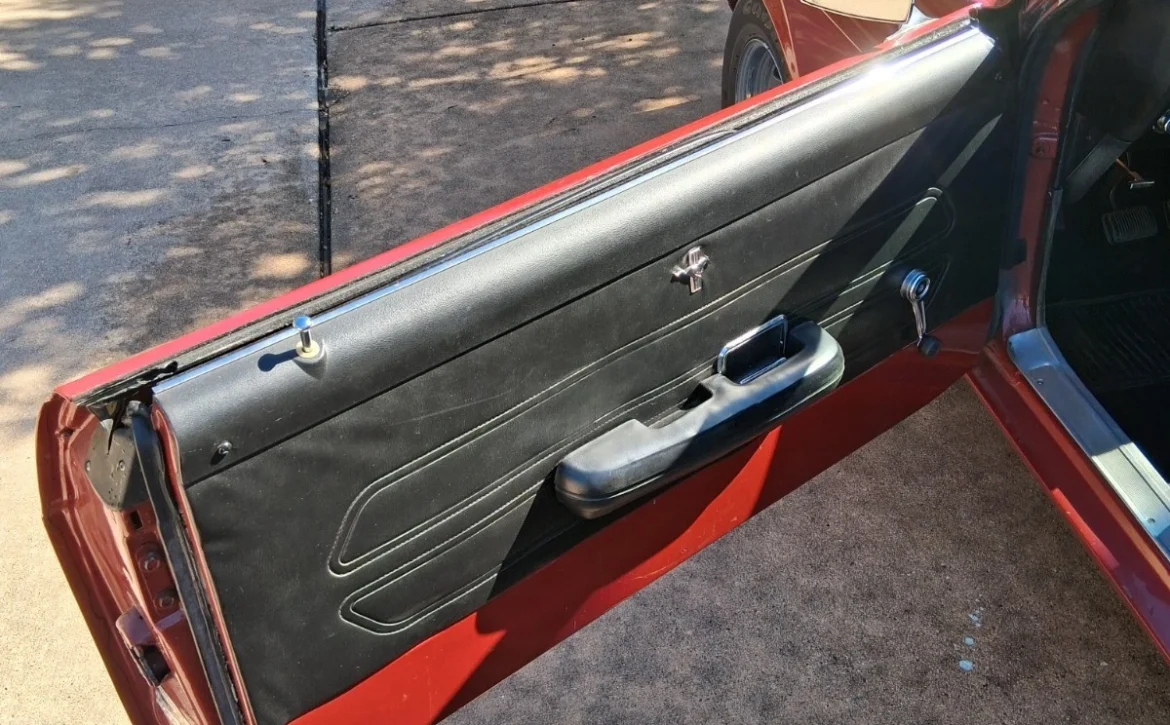 There is some light overspray from an unknown source (wrong place at the wrong time), which should come off with light compounding or polishing. There is a minor rust spot at the bottom of the driver-side door skin. The common Mustang cowl vent water leak issue has been addressed by removing the rusted metal and installing galvanized flashing with sealant. Overall, the body is a solid 20-footer, possibly better.