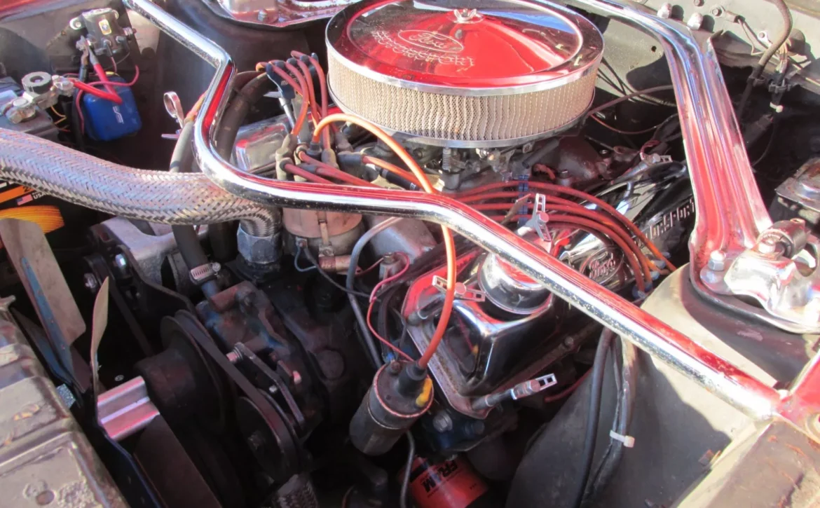 The car was originally a 351W 4V, 3-speed manual, with Gulfstream Aqua paint and factory A/C dash