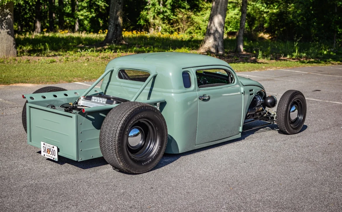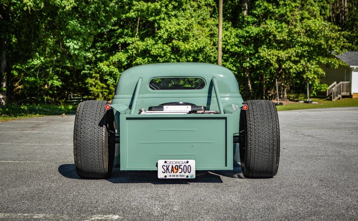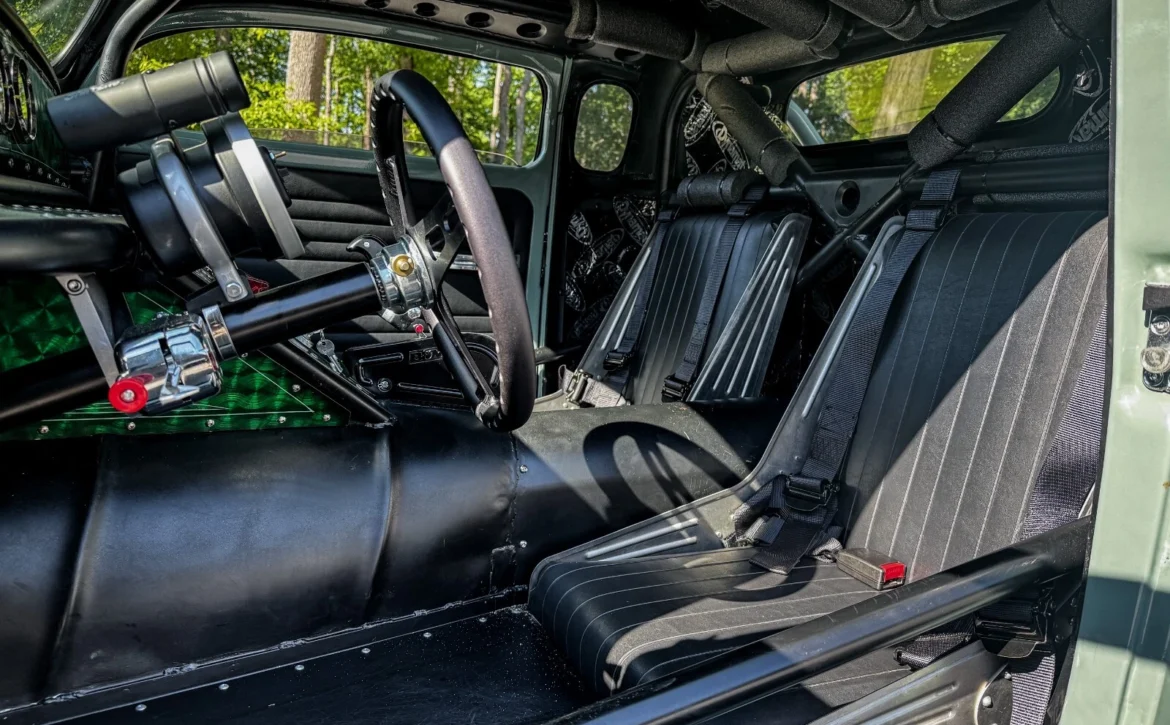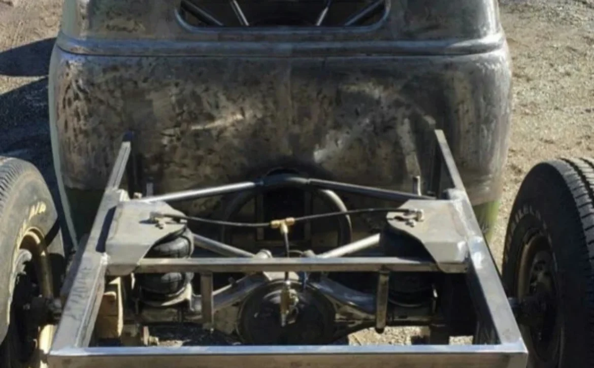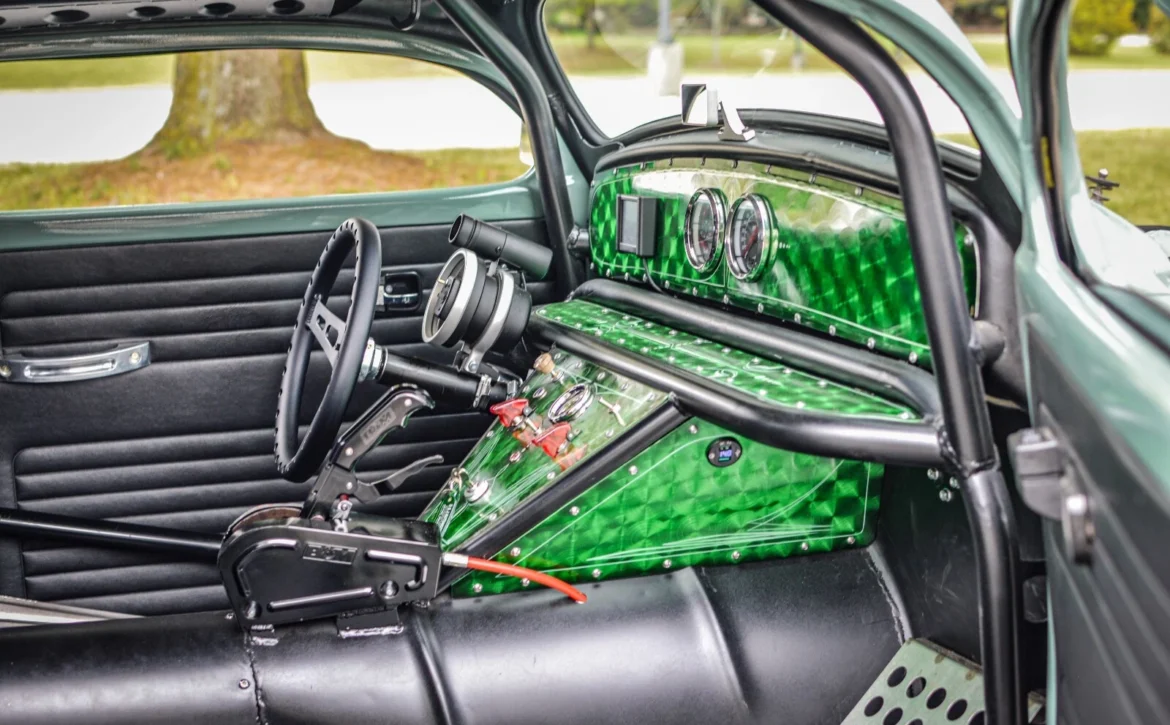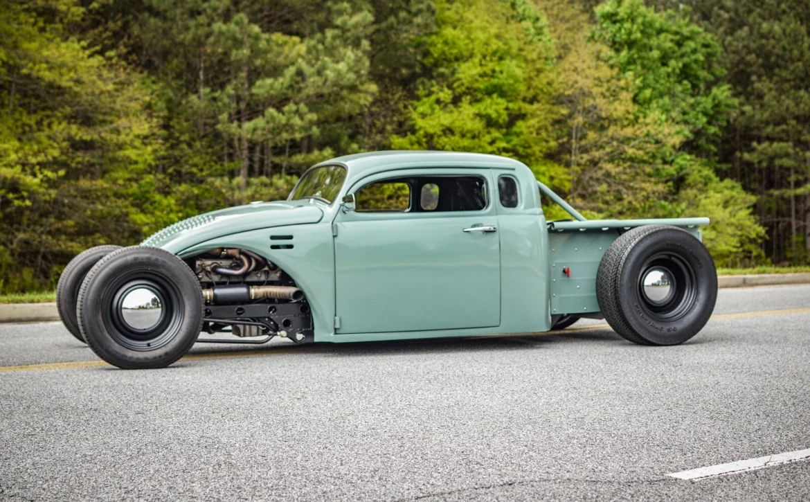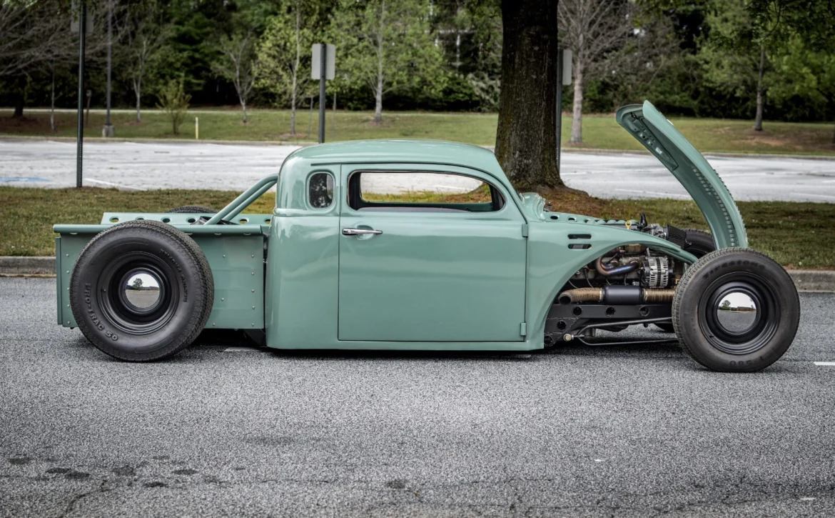 This one-of-a-kind custom build started life as a 1969 Volkswagen Beetle and has been radically transformed into a chopped, channeled, V8-powered hot rod pickup. Blending classic style with modern performance, it combines a Beetle body, a 1949 Chevy cab, and a custom-fabricated bed, all mounted to a hand-built steel frame with an integrated roll cage.