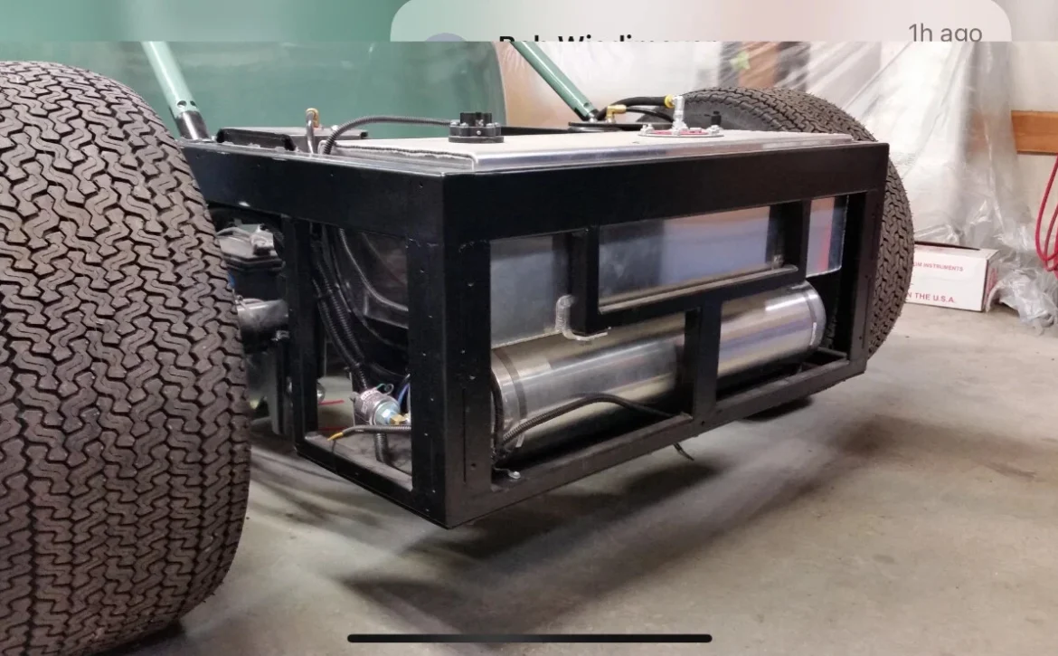 Custom hand-fabricated steel frame with integrated roll cage