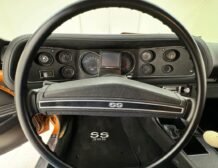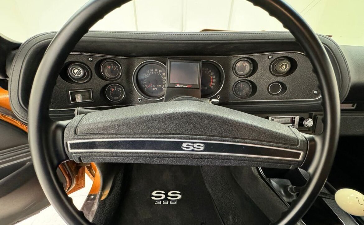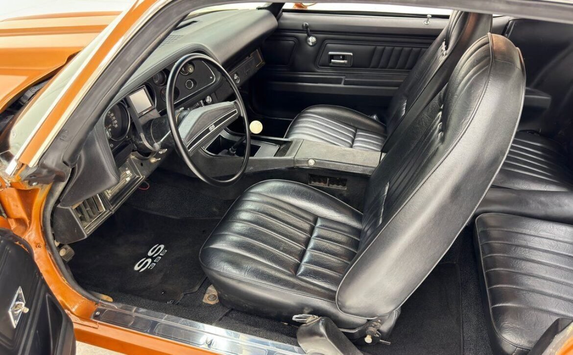 The exterior features a cowl hood, a solid front bumper, and a coarser SS grille emblem that defines the 1972 model year. A three-piece sharply angled rear spoiler and dual exhaust with straight tailpipes under the rear valance are standard on the SS, making it as functional as it is stylish. The contrasting black rear fascia around the quad taillights and license plate cutout further accentuates the car’s bold design. The body is sleek and uninterrupted by side moldings, with an SS396 fender badge proudly displayed. The 15-inch SS Sport wheels, wrapped in staggered tires, give this muscle car an extra muscular stance. The paint is in great condition, though there are some small areas of bondo repair and a few paint drips. The panel gaps are mostly good, with a few areas showing slight imperfections.