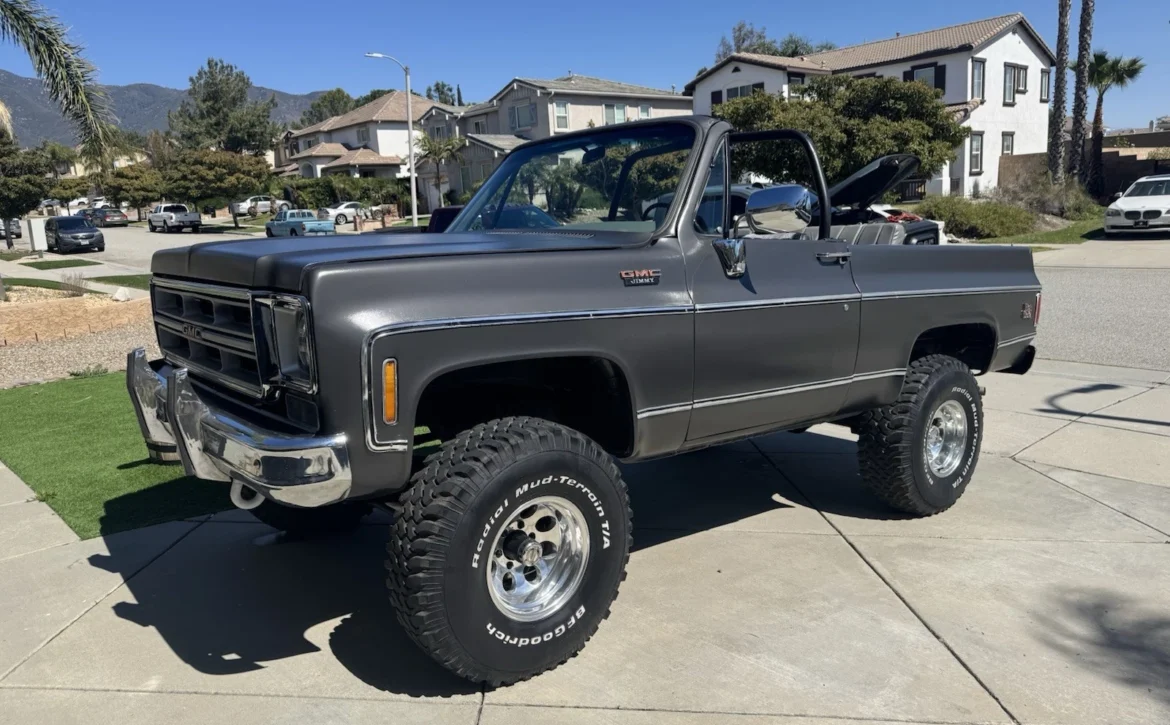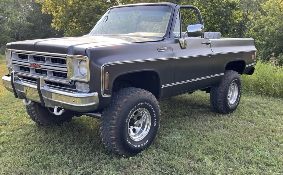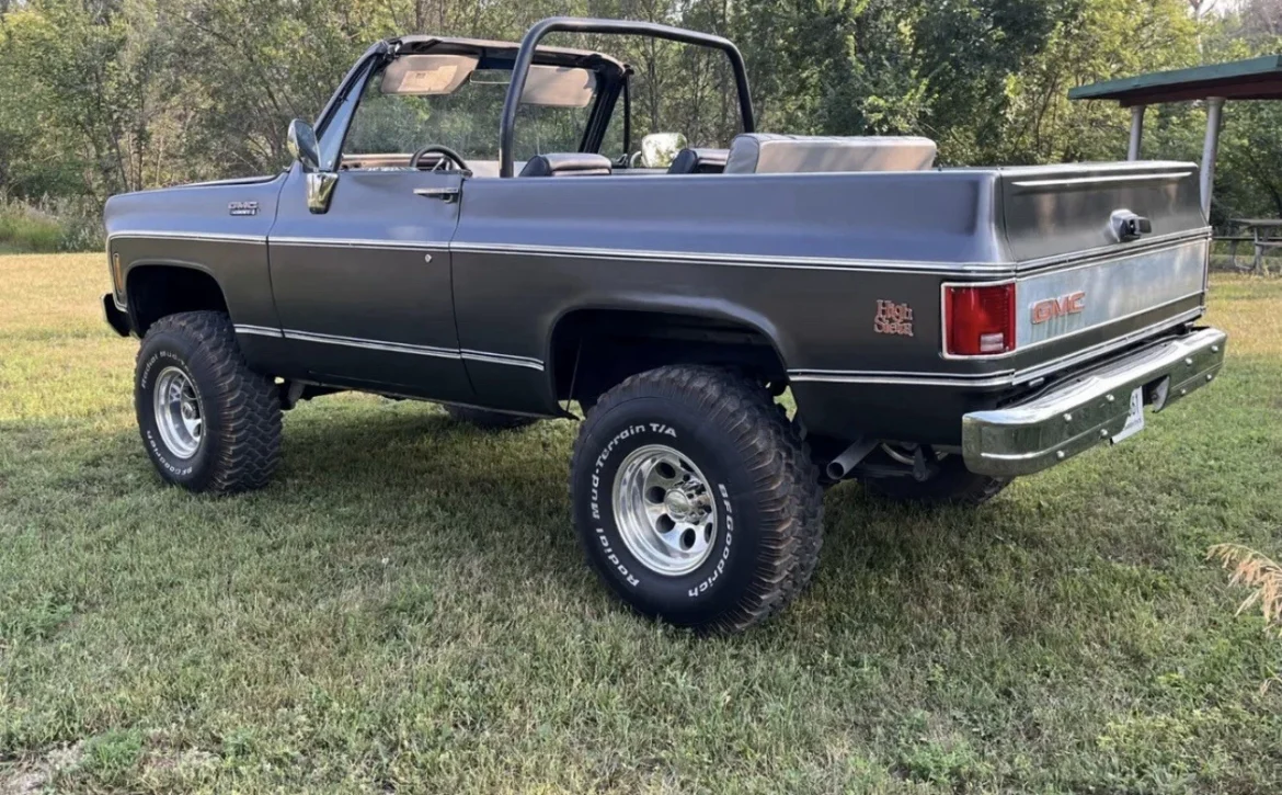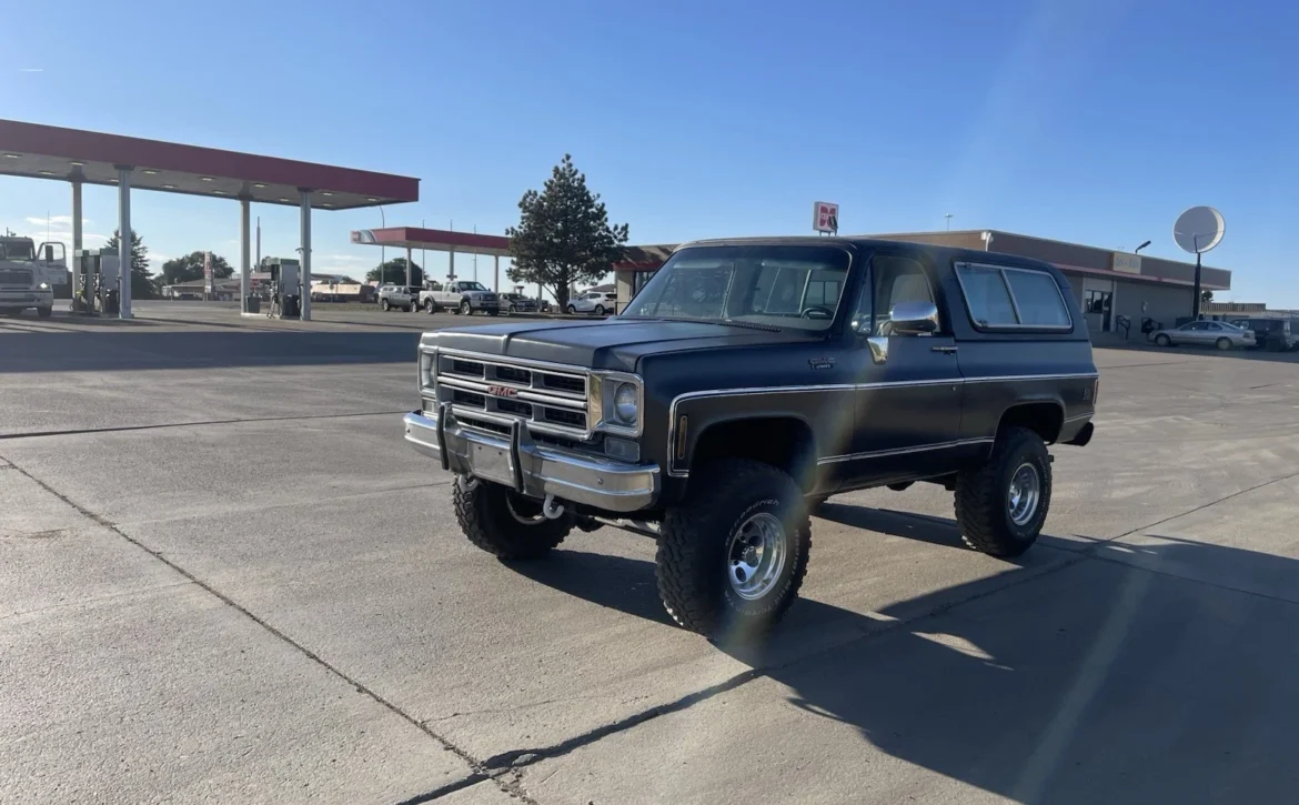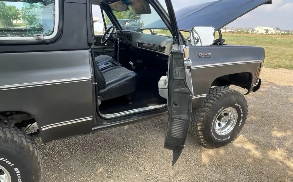 Classic 1975 GMC Jimmy High Sierra finished in black with a matching black interior. This 4WD SUV is equipped with an automatic transmission and an 8-cylinder engine. Interior features spacious cloth seating.