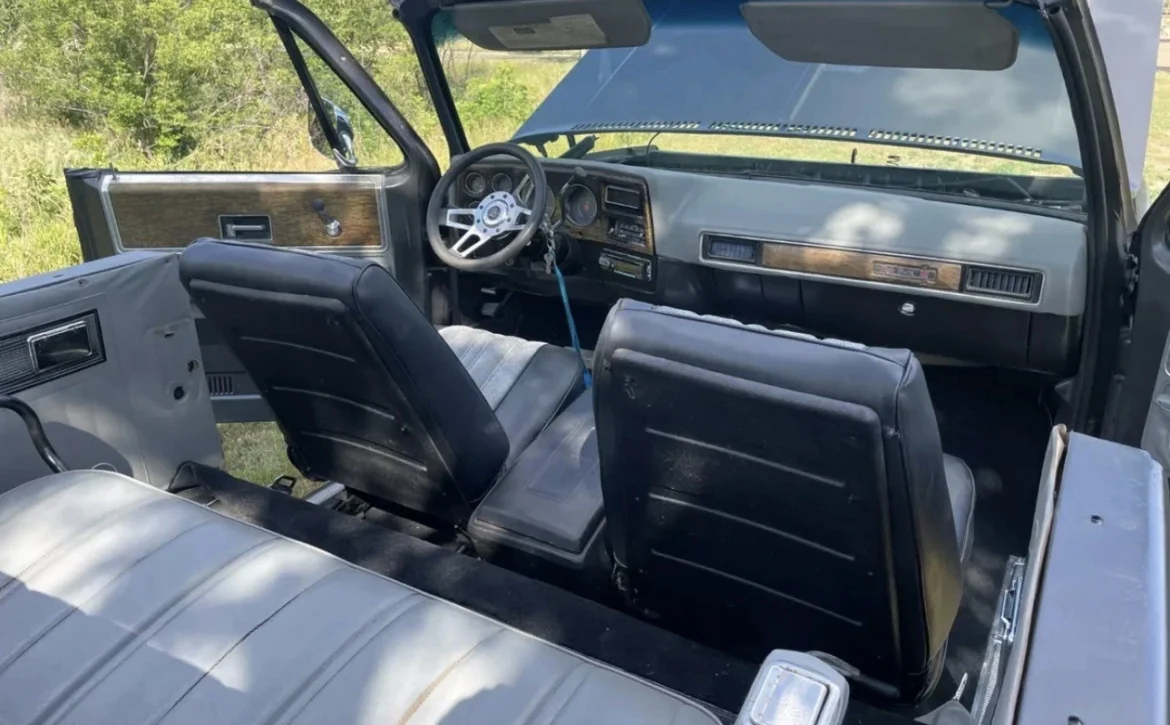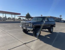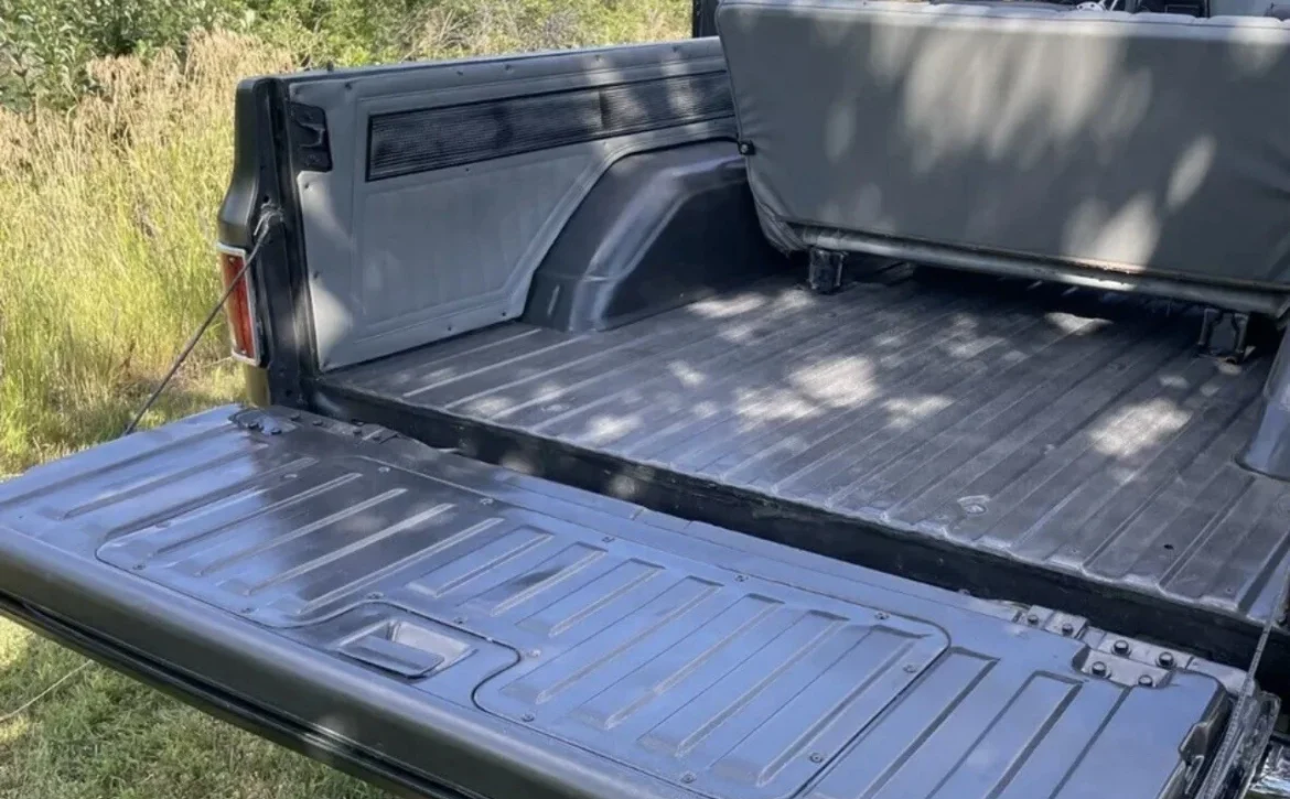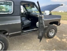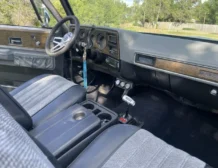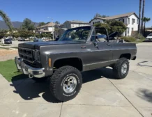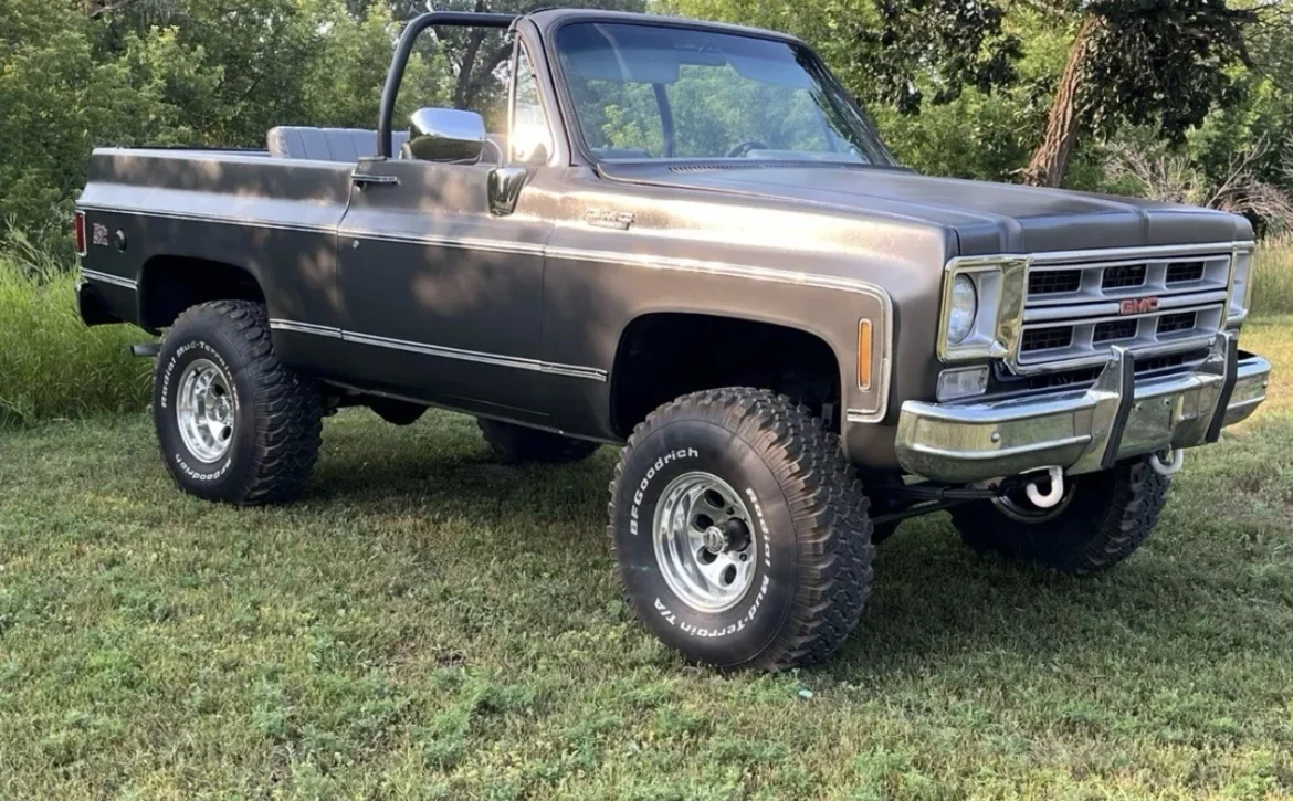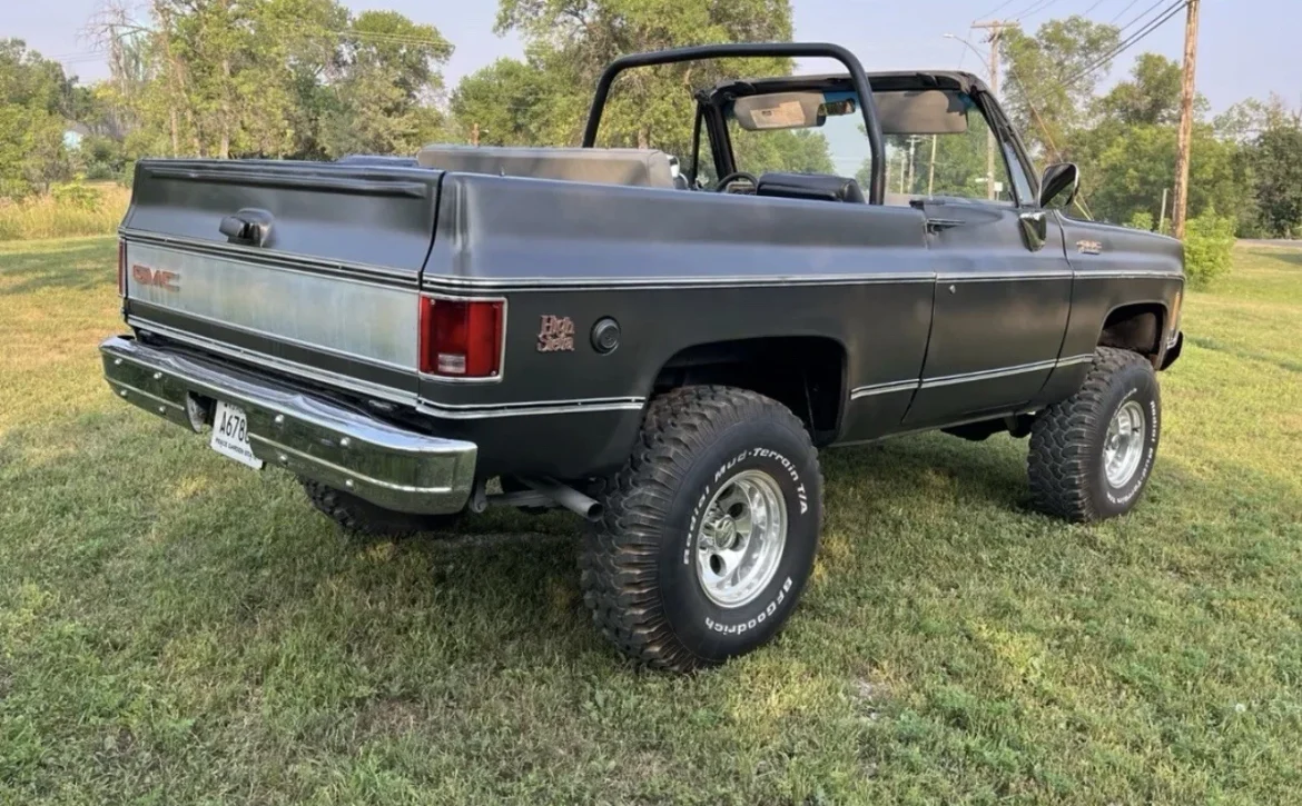 Classic 1975 GMC Jimmy High Sierra finished in black with a matching black interior. This 4WD SUV is equipped with an automatic transmission and an 8-cylinder engine. Interior features spacious cloth seating.
