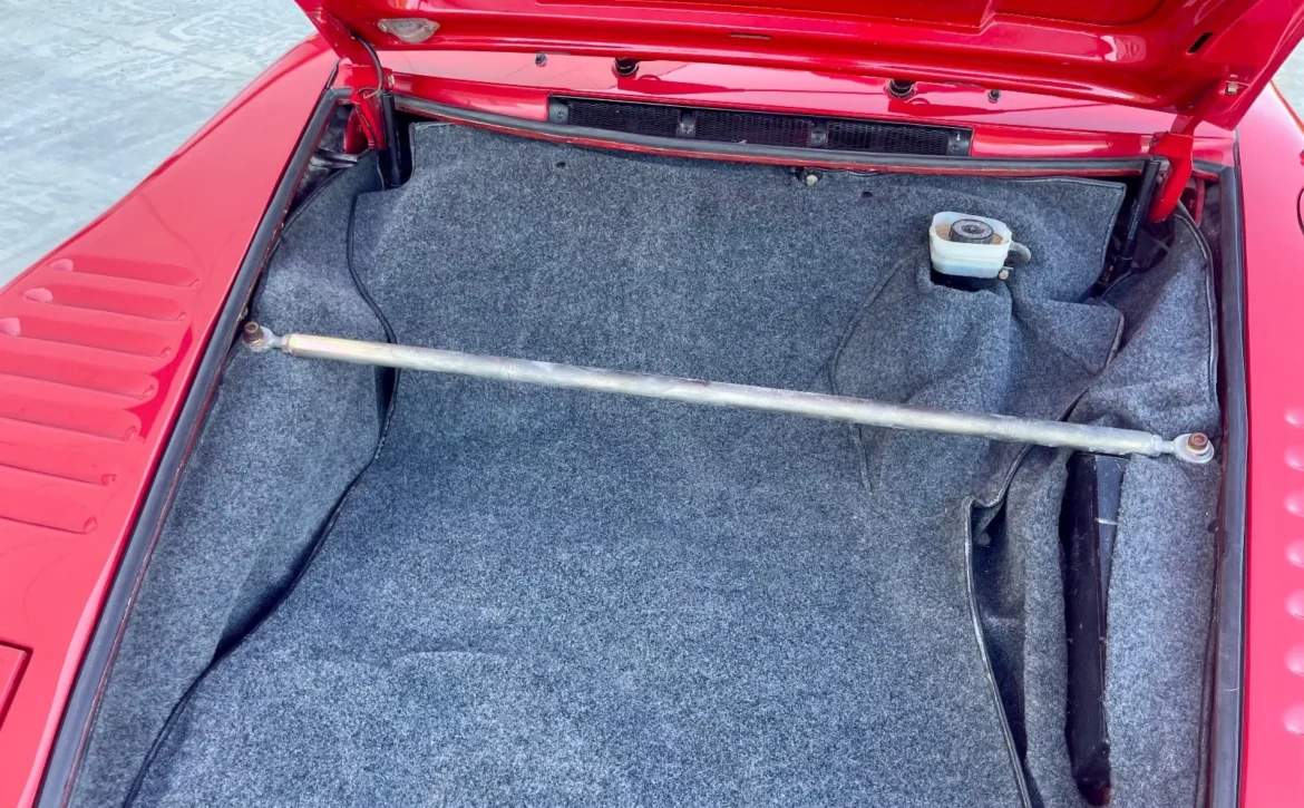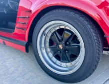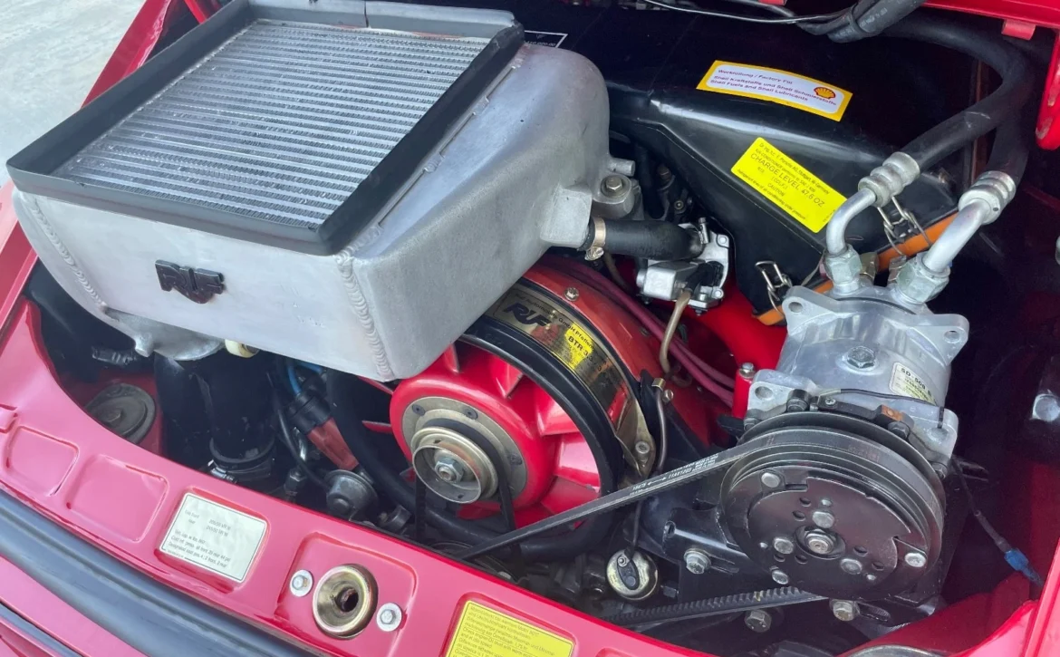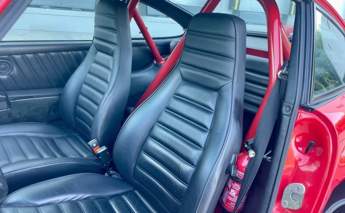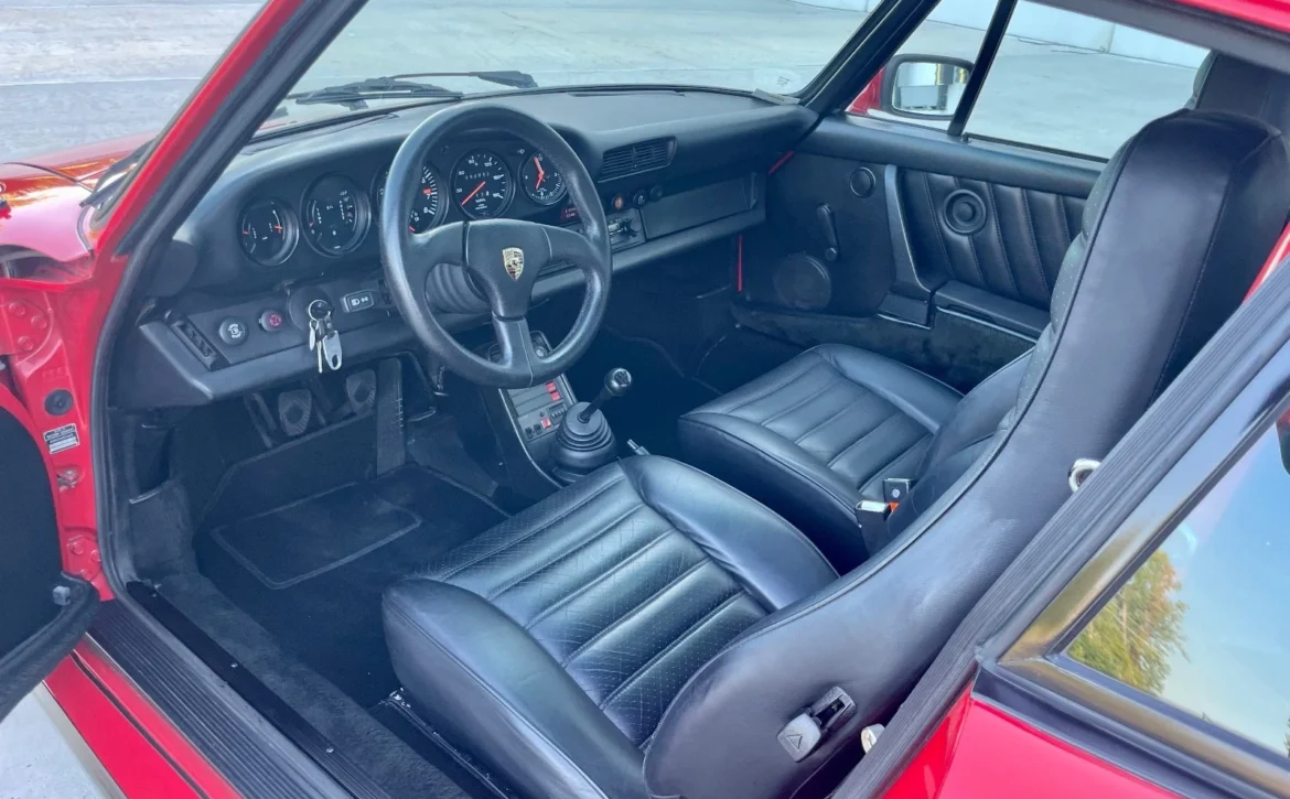 Finished in Guards Red, the car received a 2024 refinish to correct cosmetic imperfections. A new windshield and rubbers were installed in 2023. The exterior sits on multi-piece Fuchs-style wheels wrapped in new Pirelli tires.